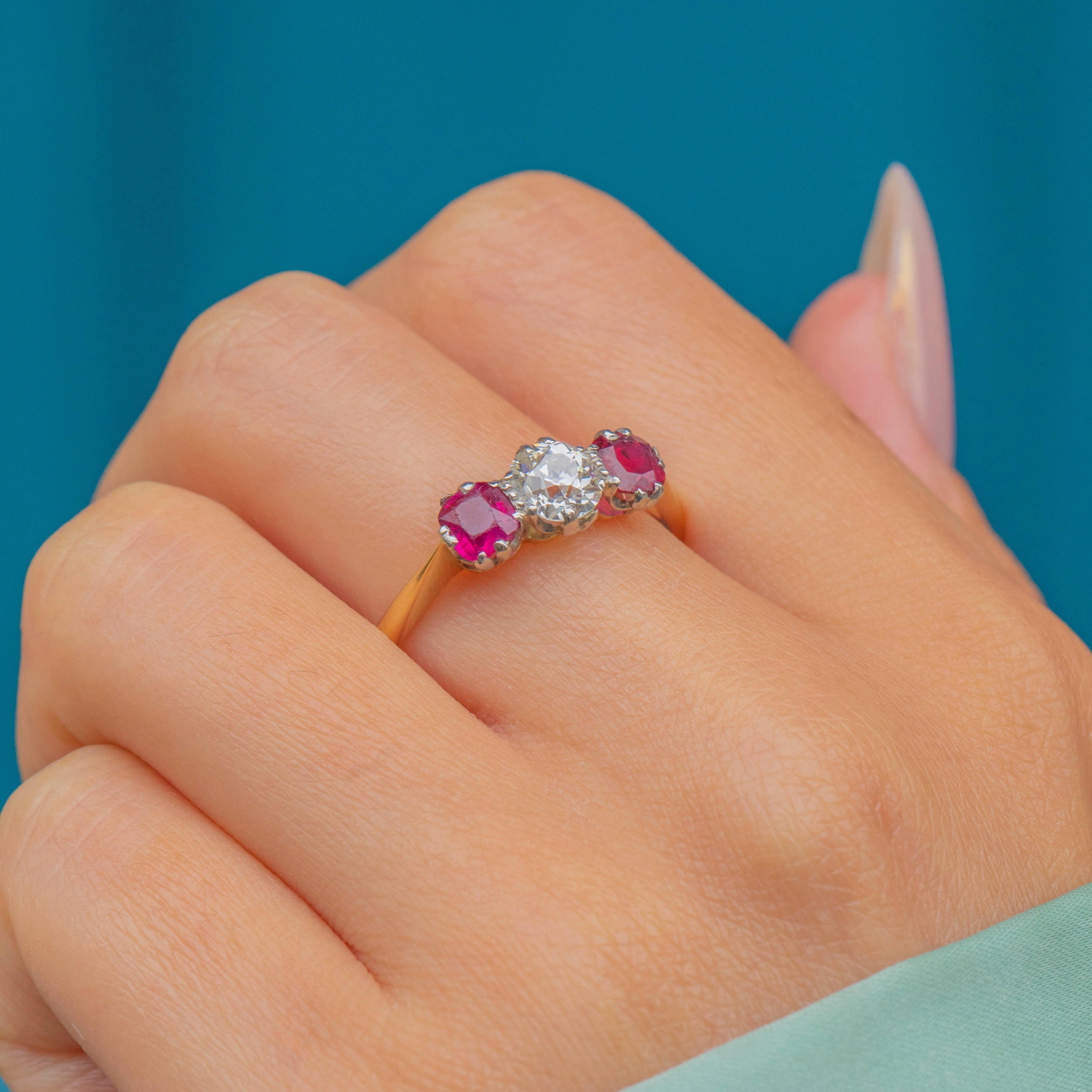 This exquisite Art Deco trilogy ring showcases a central sparkling Diamond flanked by two vibrant Rubies, set elegantly in Platinum with an 18ct Gold band.