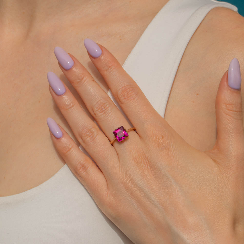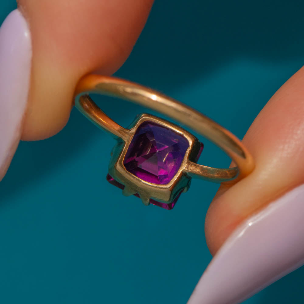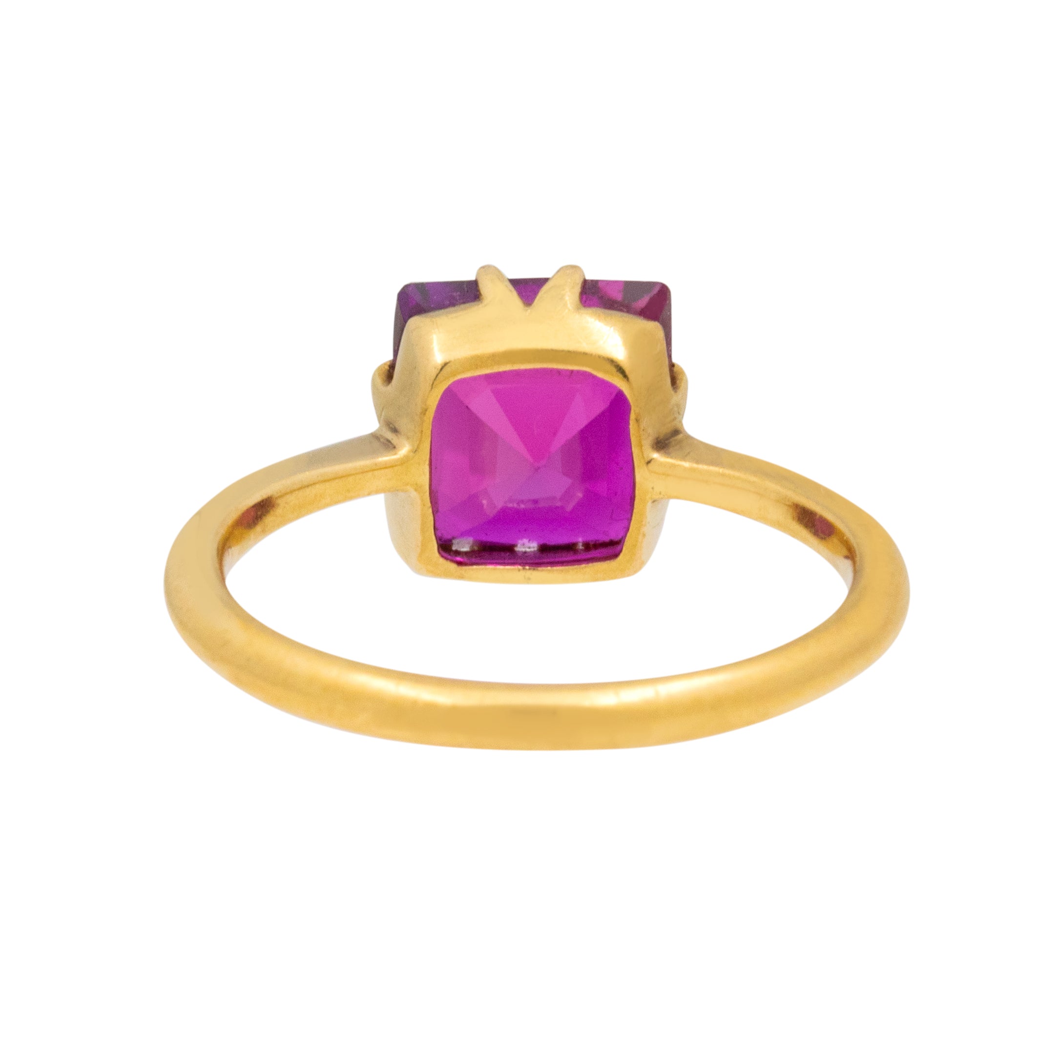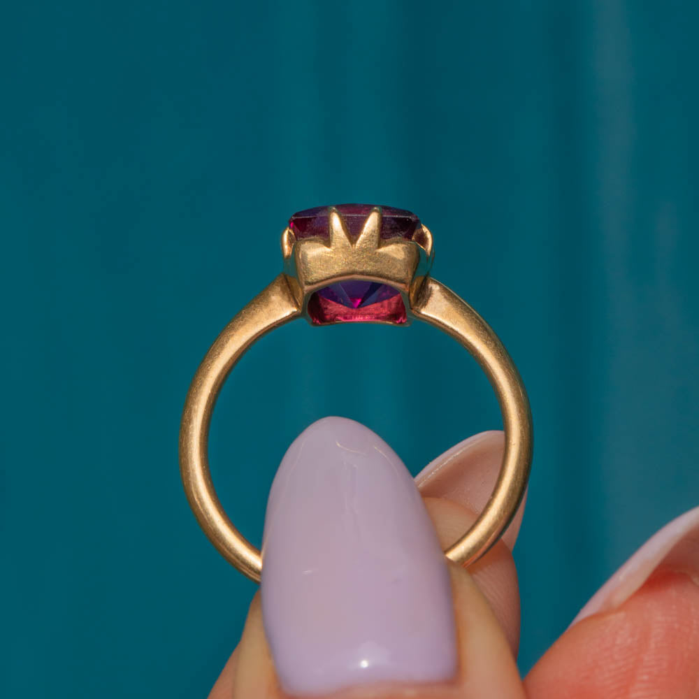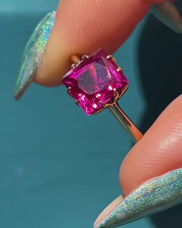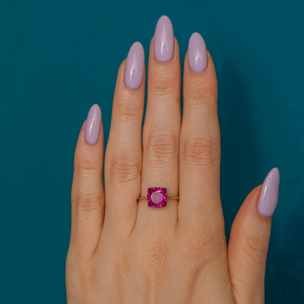 This antique 18ct Gold Ruby solitaire ring is fit for the jewellery box of Barbie! Her 3.15ct Ruby has hot fuchsia hues dancing between her facets, and with claw settings on each side, the light streams through from every direction.