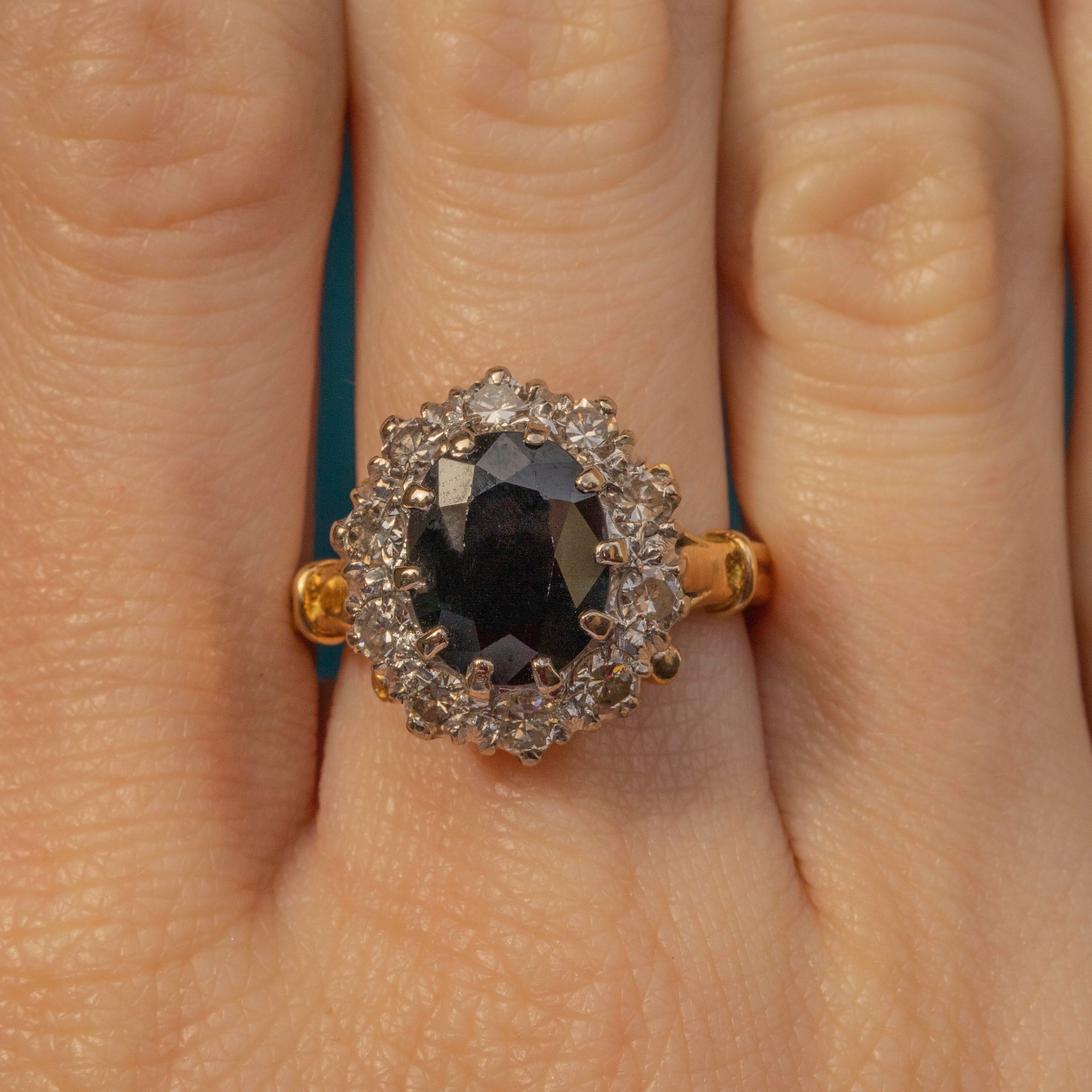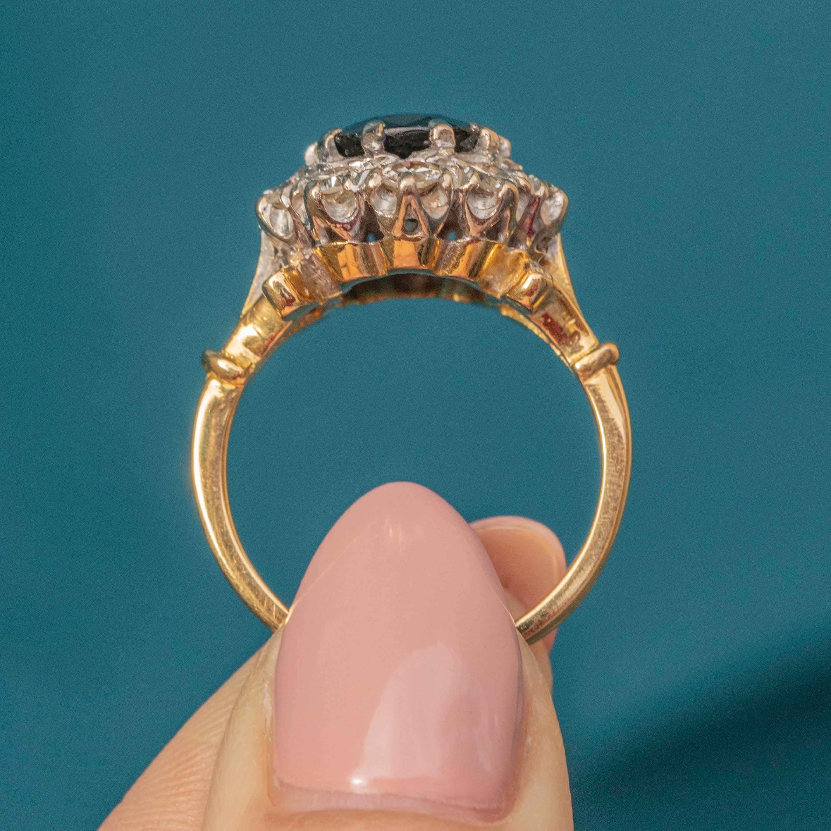 EXCELLENT. This antique Edwardian 18ct Gold Sapphire Diamond cluster ring is in excellent condition! The Sapphire and Diamonds sit securely within their settings, free from any damage. The ring has retained its structural integrity and the Gold has an even saturation throughout. A great choice for an engagement ring or ring to be worn daily with confidence. With a well rounded band, this Sapphire Diamond ring glides onto your hand a dream!
