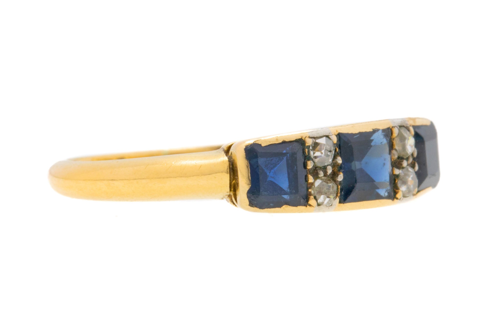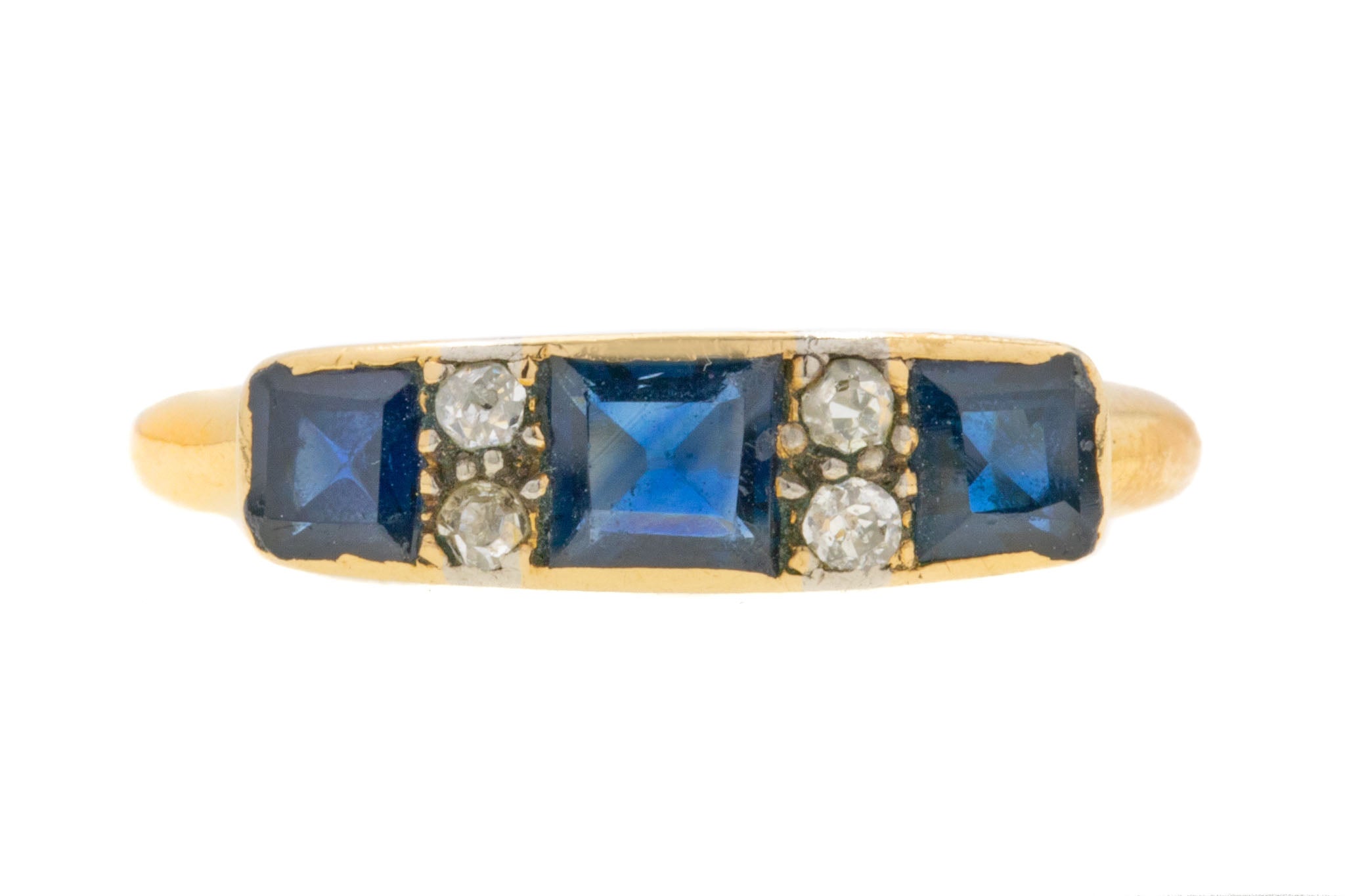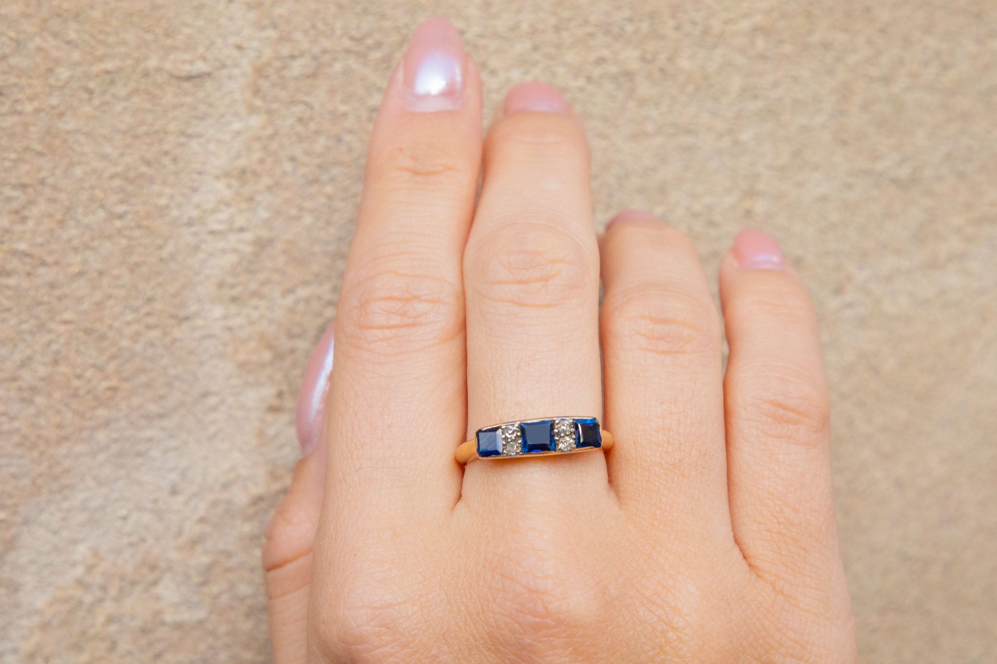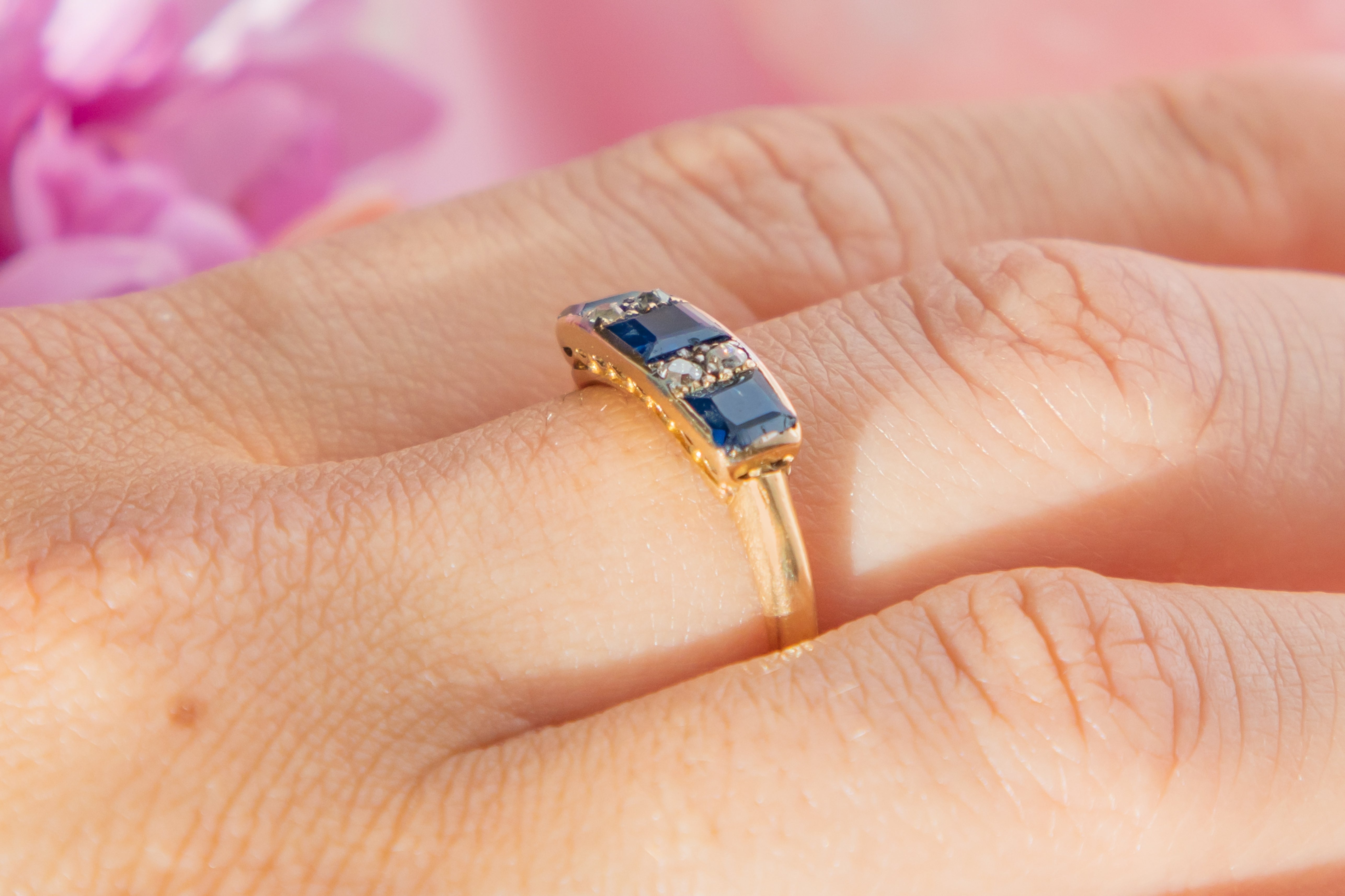 This Art Deco 18ct Gold Sapphire Diamond ring is a fine example of craftsmanship during the early 1900s! Boasting three square Sapphires, flaunting moody deep blue hues, with four mesmerising Diamonds nestled between - she looks as though she has been plucked from the night sky!