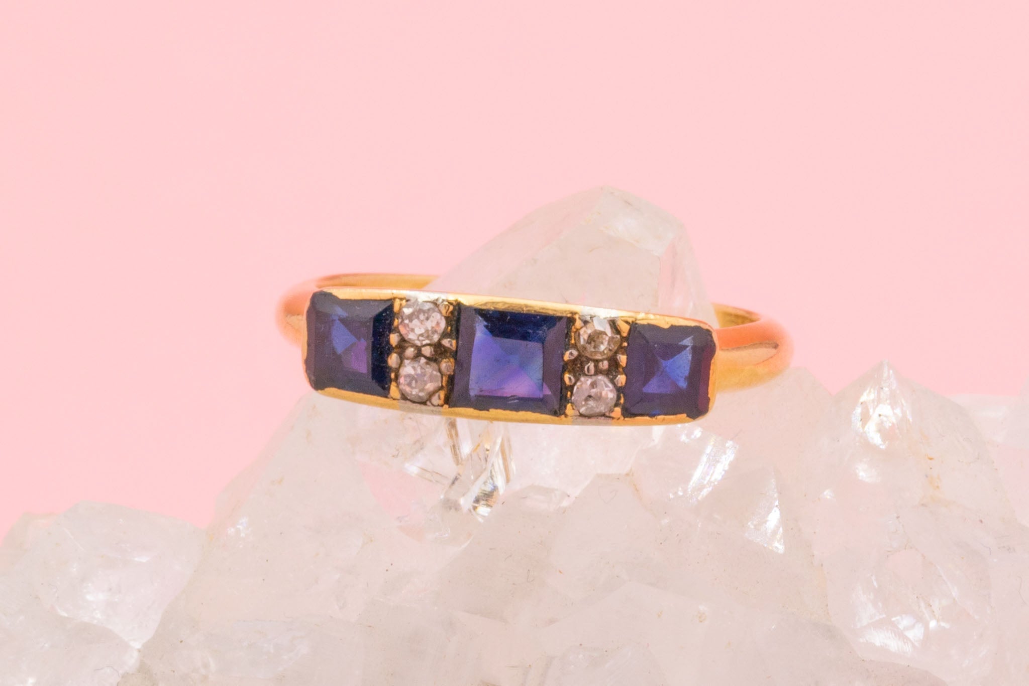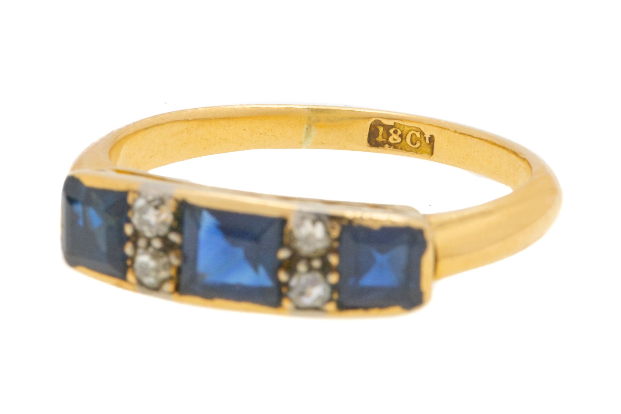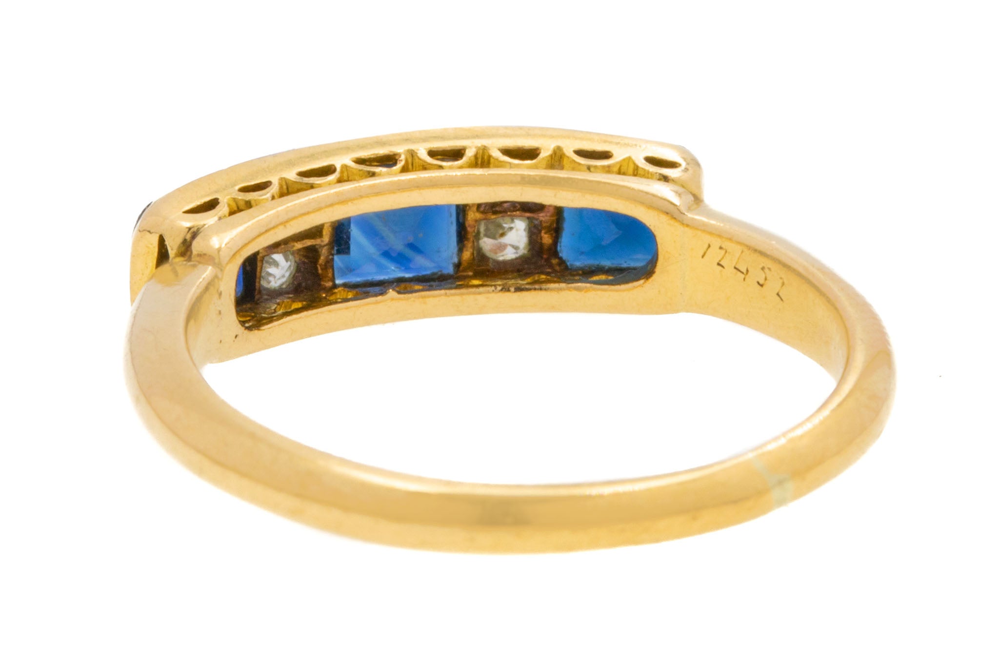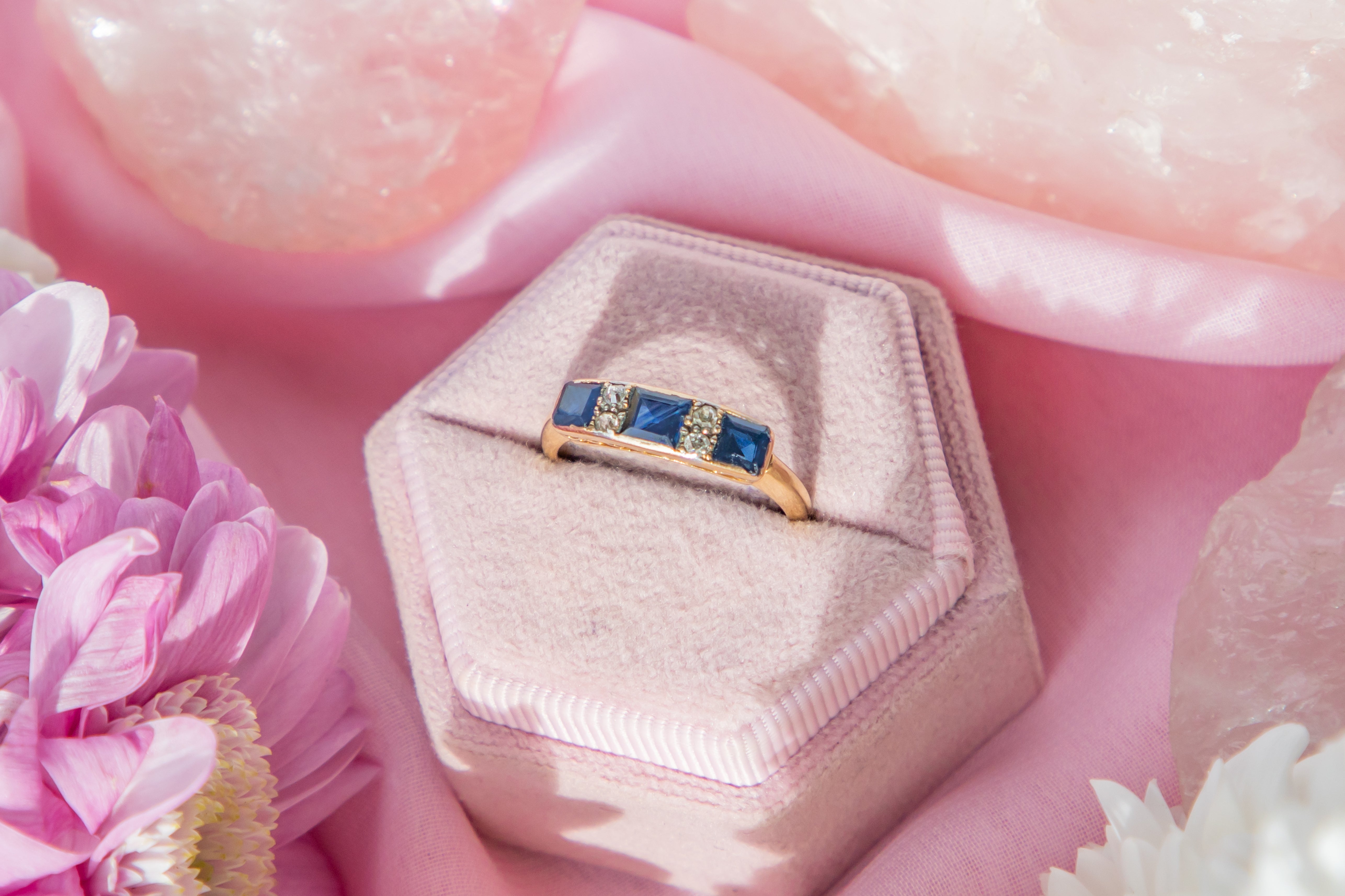 This Art Deco 18ct Gold Sapphire Diamond ring is a fine example of craftsmanship during the early 1900s! Boasting three square Sapphires, flaunting moody deep blue hues, with four mesmerising Diamonds nestled between - she looks as though she has been plucked from the night sky!
