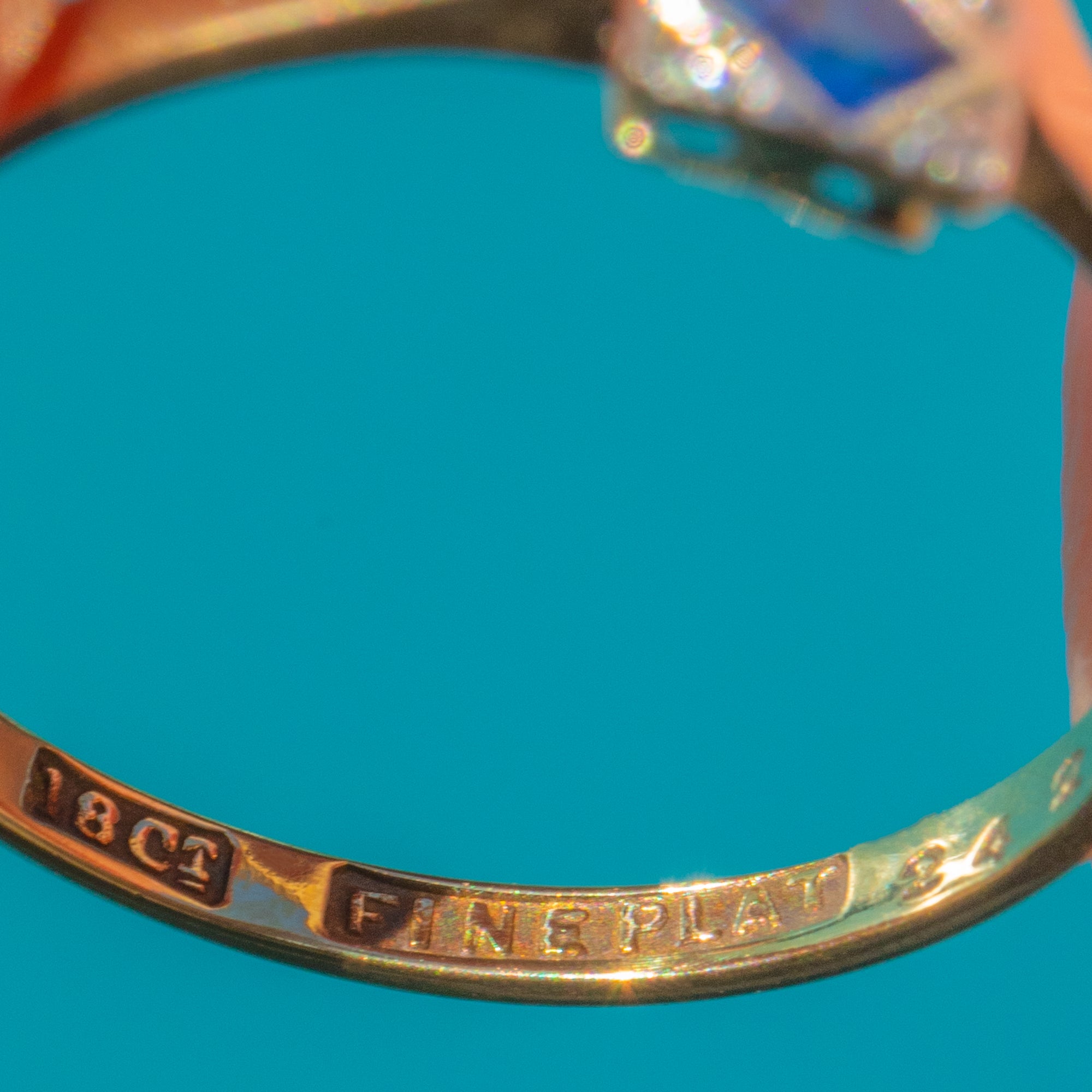 The crisp geometric design of the rectangular head captures the essence of the Art Deco period, combining bold colour with clean lines and symmetry. The neat stamps “18CT” and “FINE PLAT” add further charm and authenticity to this piece. A fabulous ring with a striking splash of blue, perfect for adding antique character to any collection.