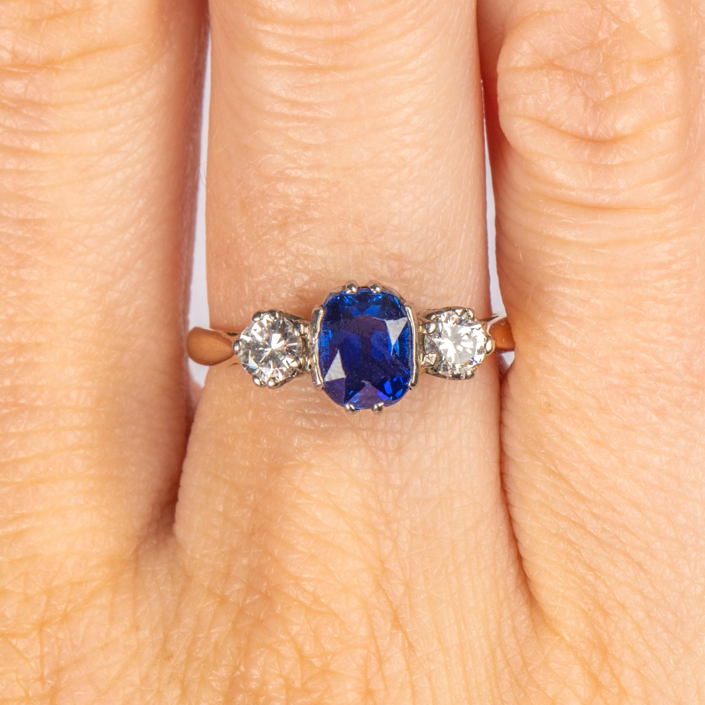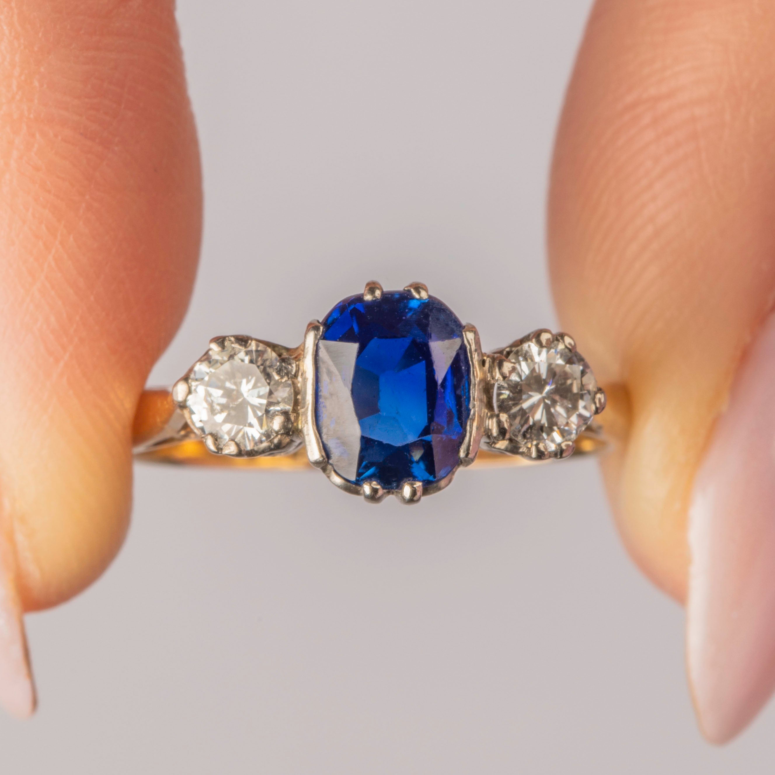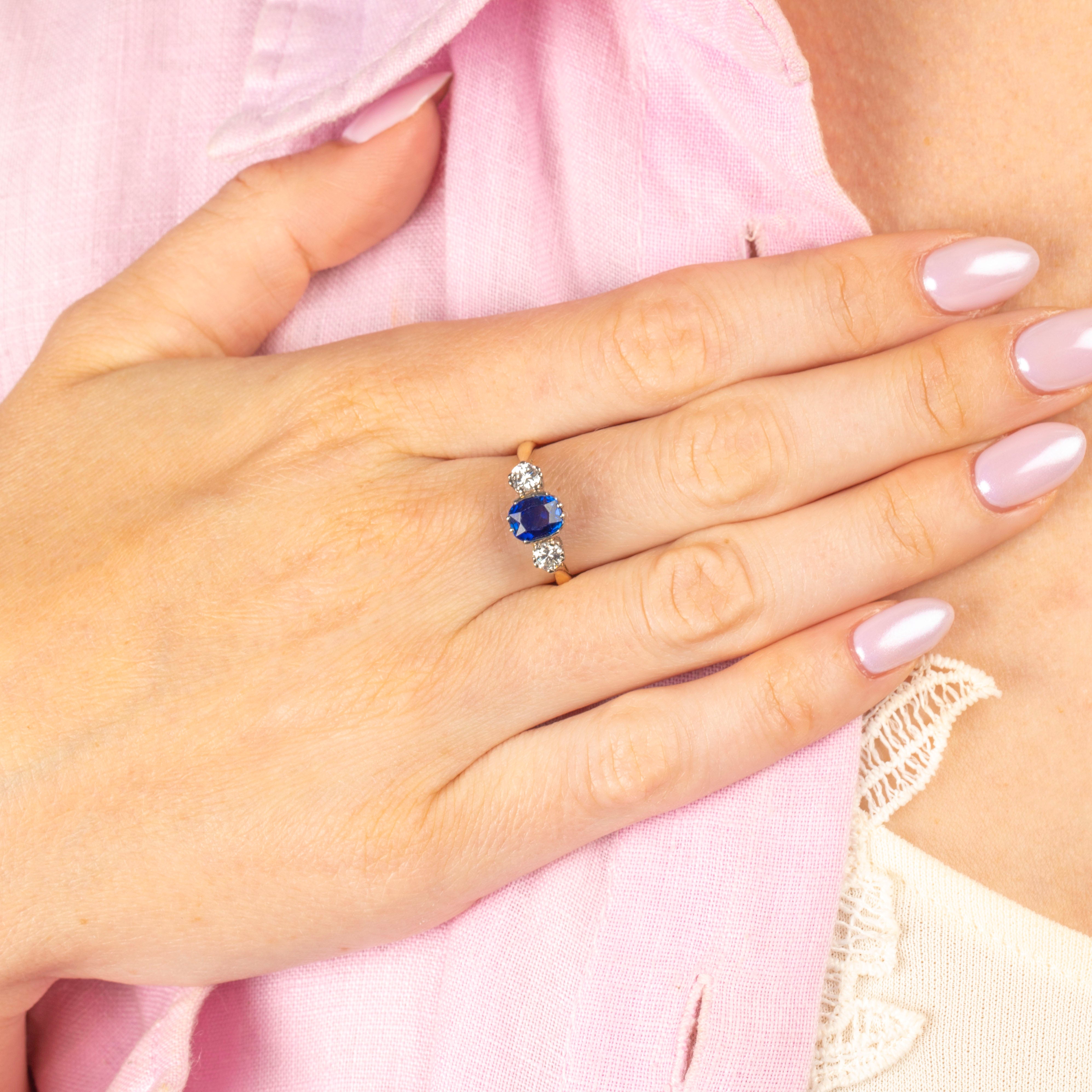 This Art Deco 18ct Gold Sapphire Diamond trilogy ring is just irresistible. Trilogy rings have a timeless appeal, and this heavenly beauty is no exception!