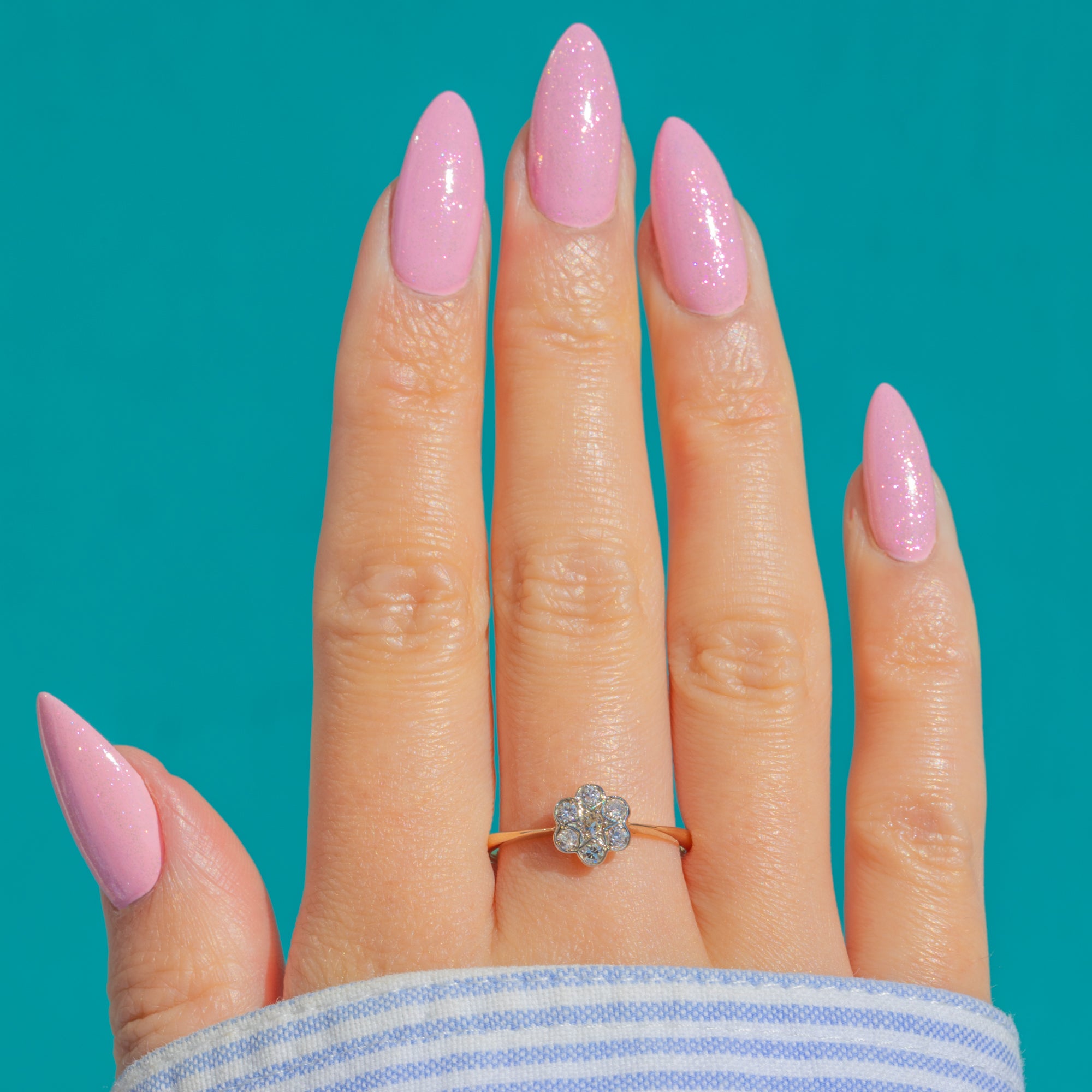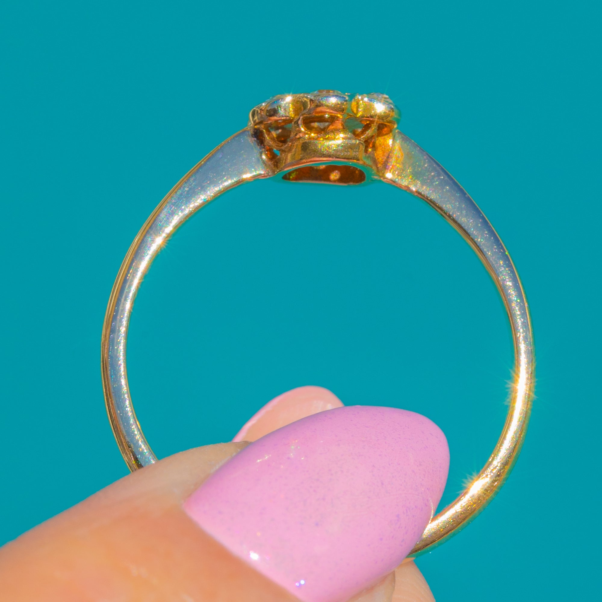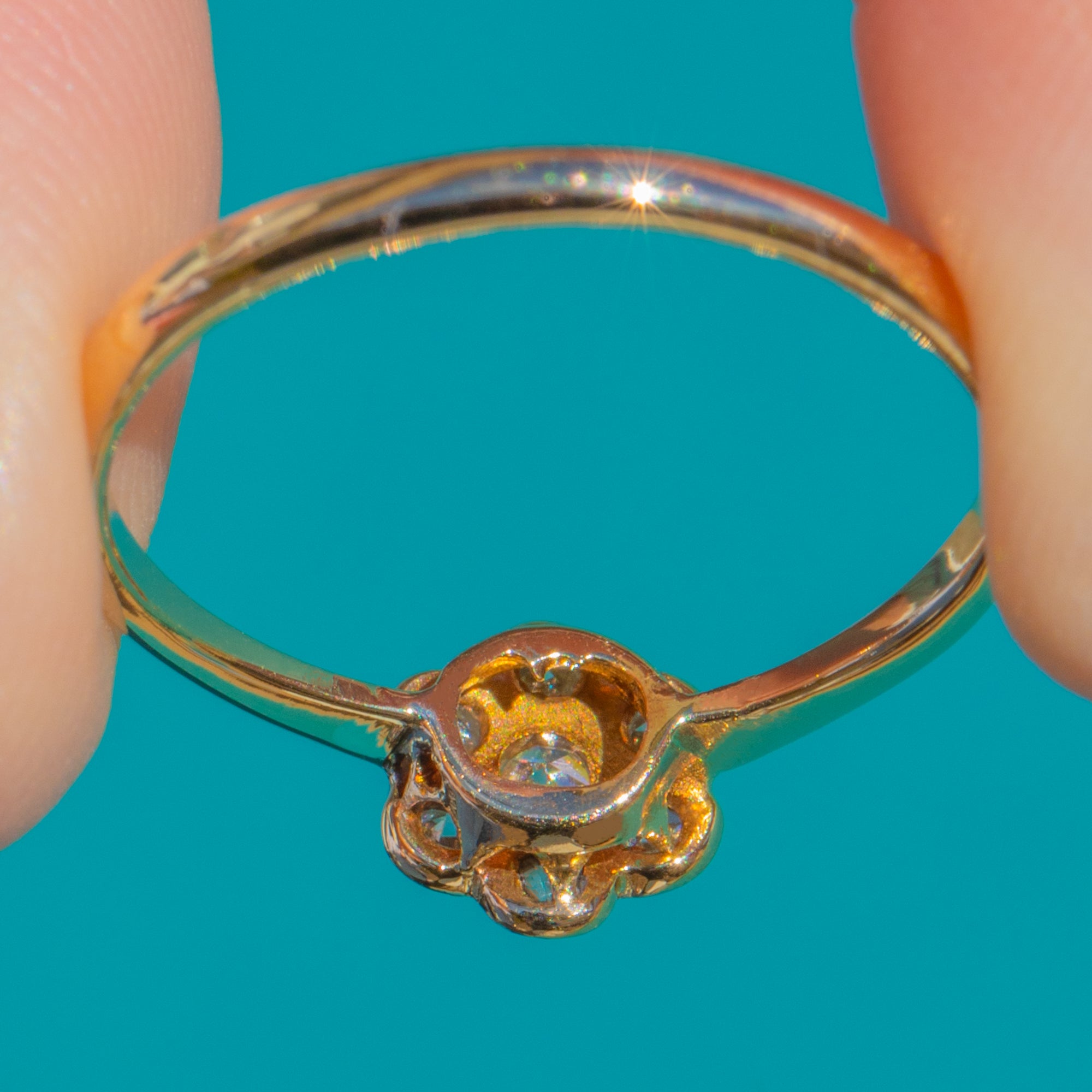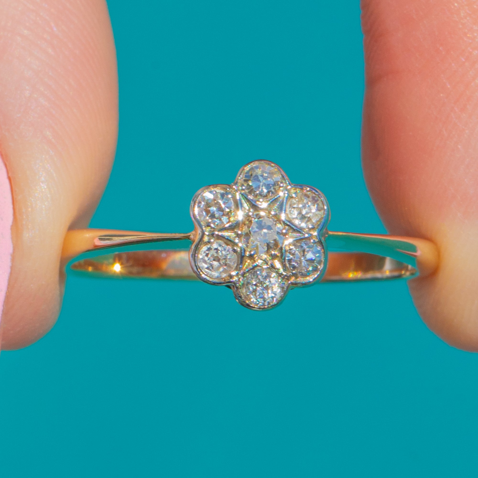 A timeless Art Deco daisy cluster ring, crafted in rich 18ct Gold and set with seven lively round Diamonds totalling approximately 0.20ct. The petite flower head sparkles with a bright, white-toned top poised above a slender yellow shank, creating a beautifully delicate two-tone look that flatters every angle.