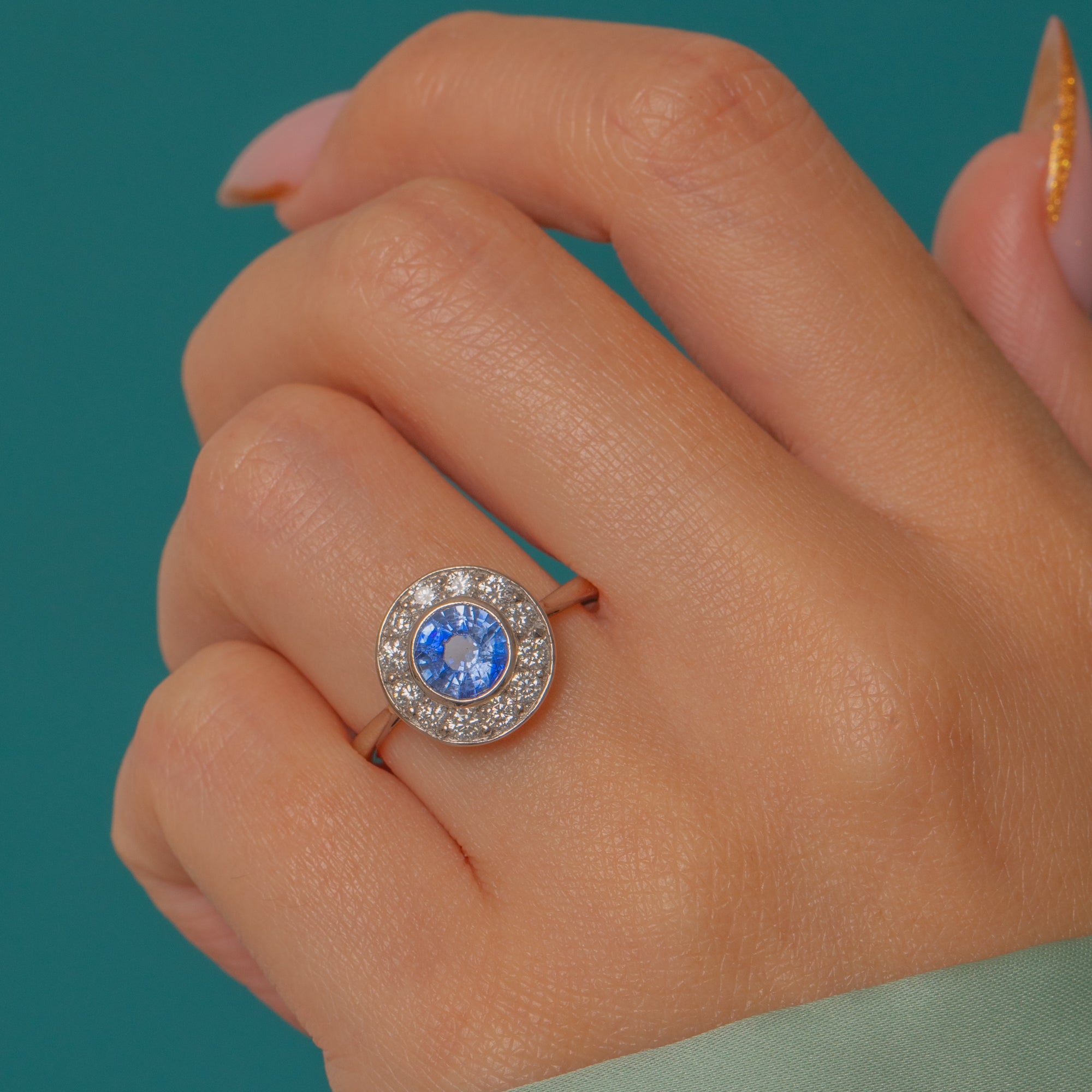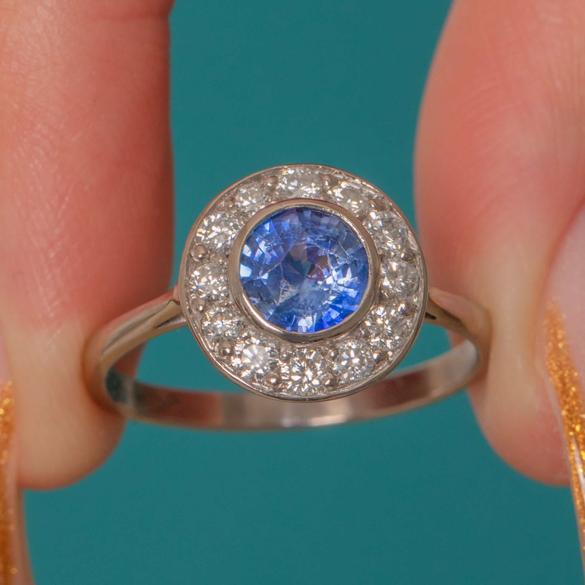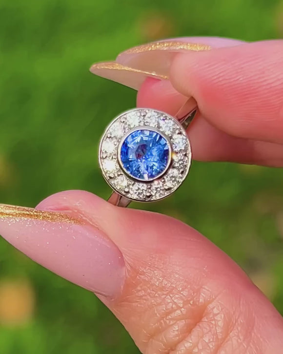 A classic Art Deco target ring showcasing a vivid Cornflower Sapphire in a neat Diamond halo. The Sapphire’s bright, even colour pops against the crisp white sparkle of the Diamonds, delivering that clean geometric glamour the 1920s–30s are loved for.