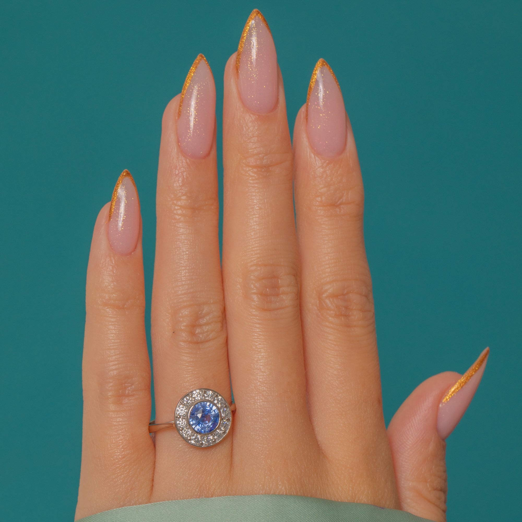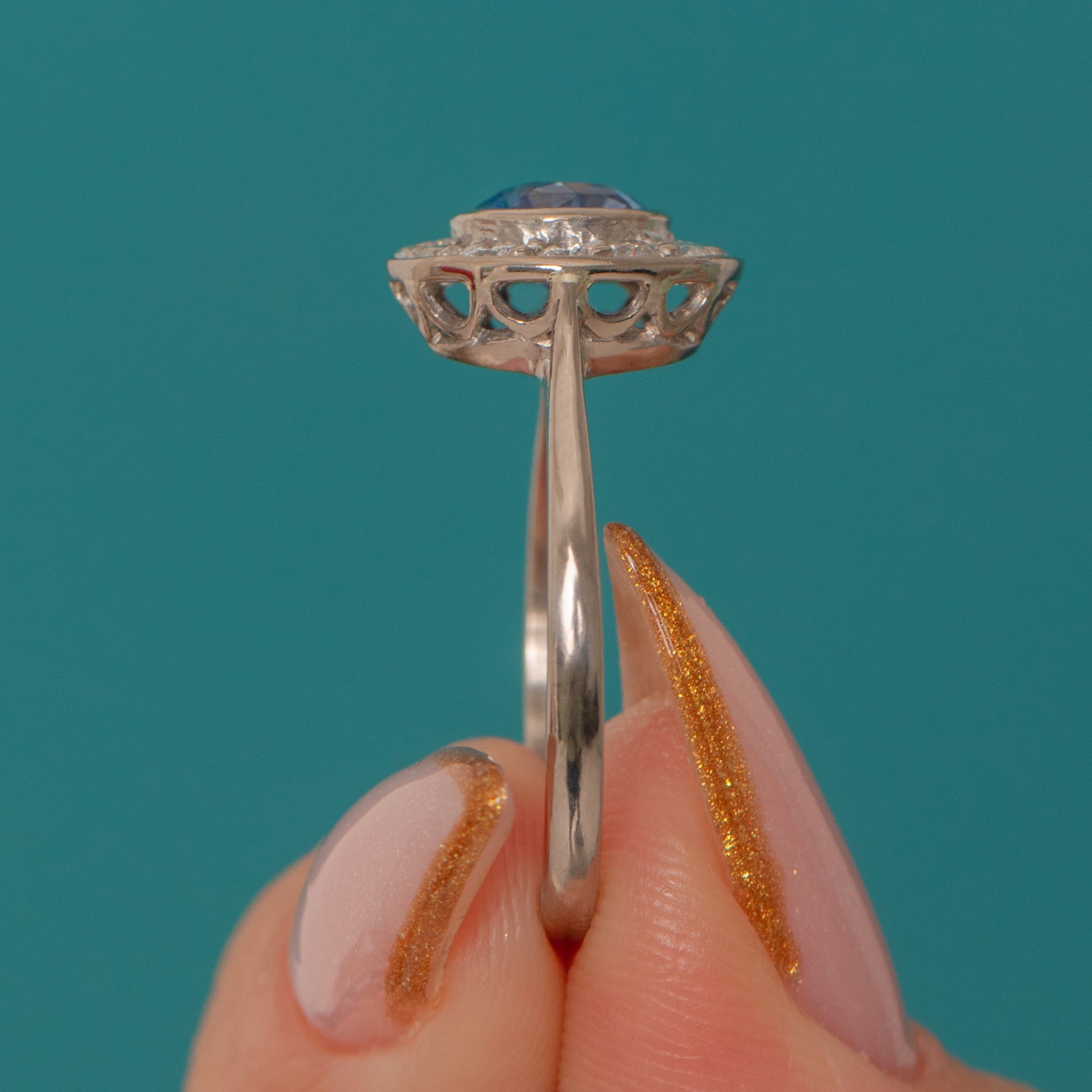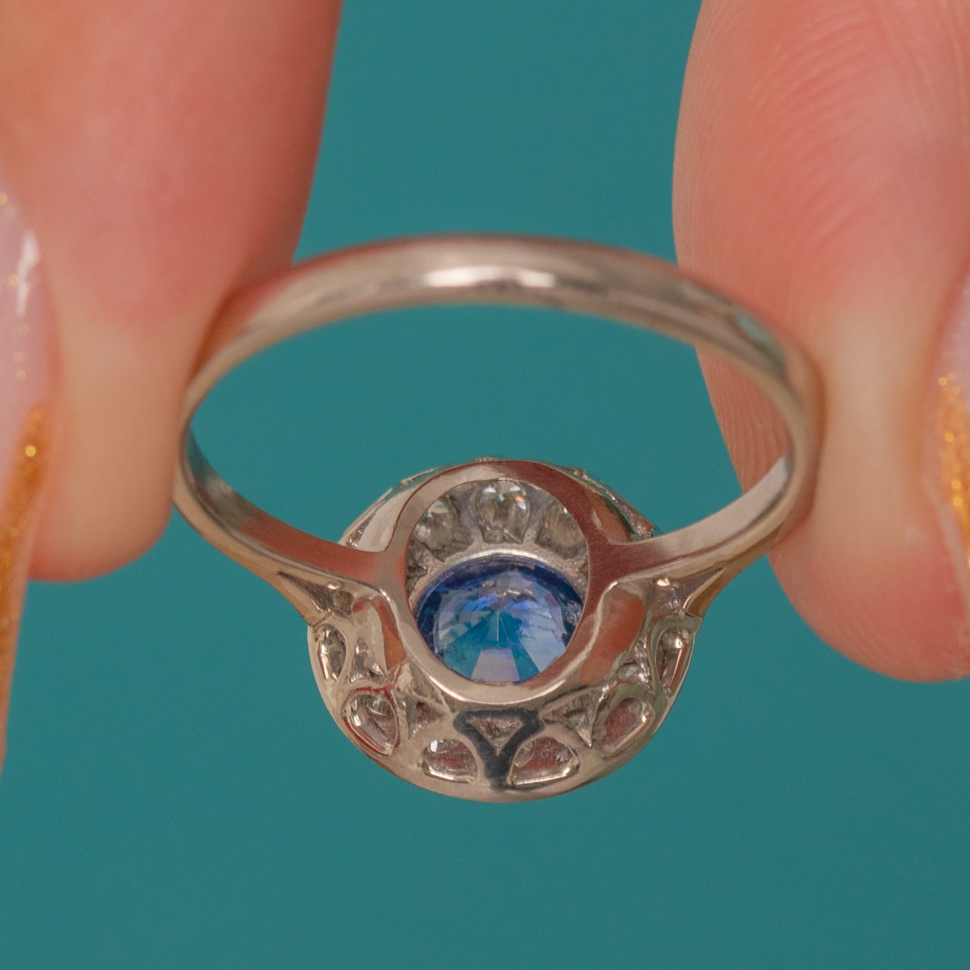 A classic Art Deco target ring showcasing a vivid Cornflower Sapphire in a neat Diamond halo. The Sapphire’s bright, even colour pops against the crisp white sparkle of the Diamonds, delivering that clean geometric glamour the 1920s–30s are loved for.