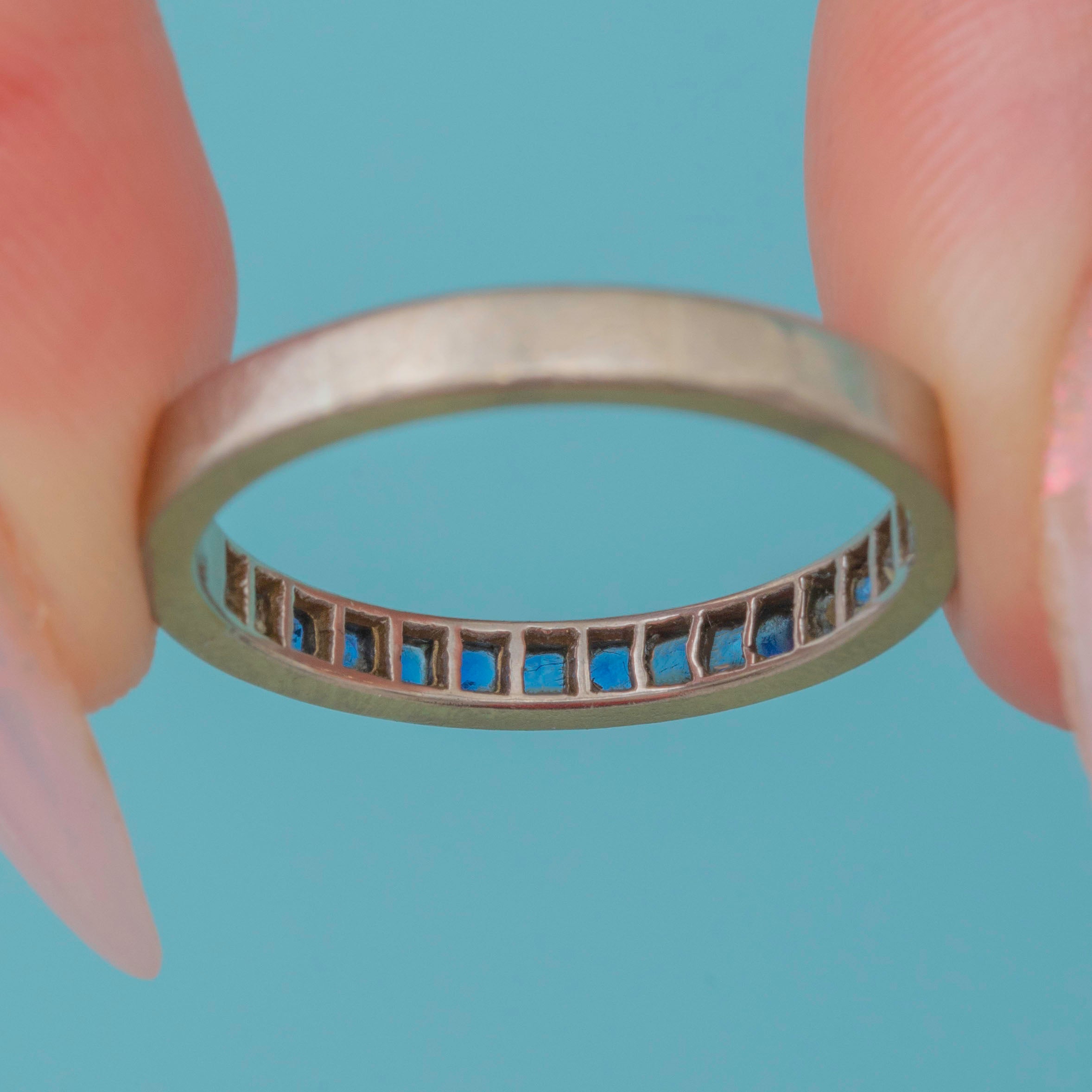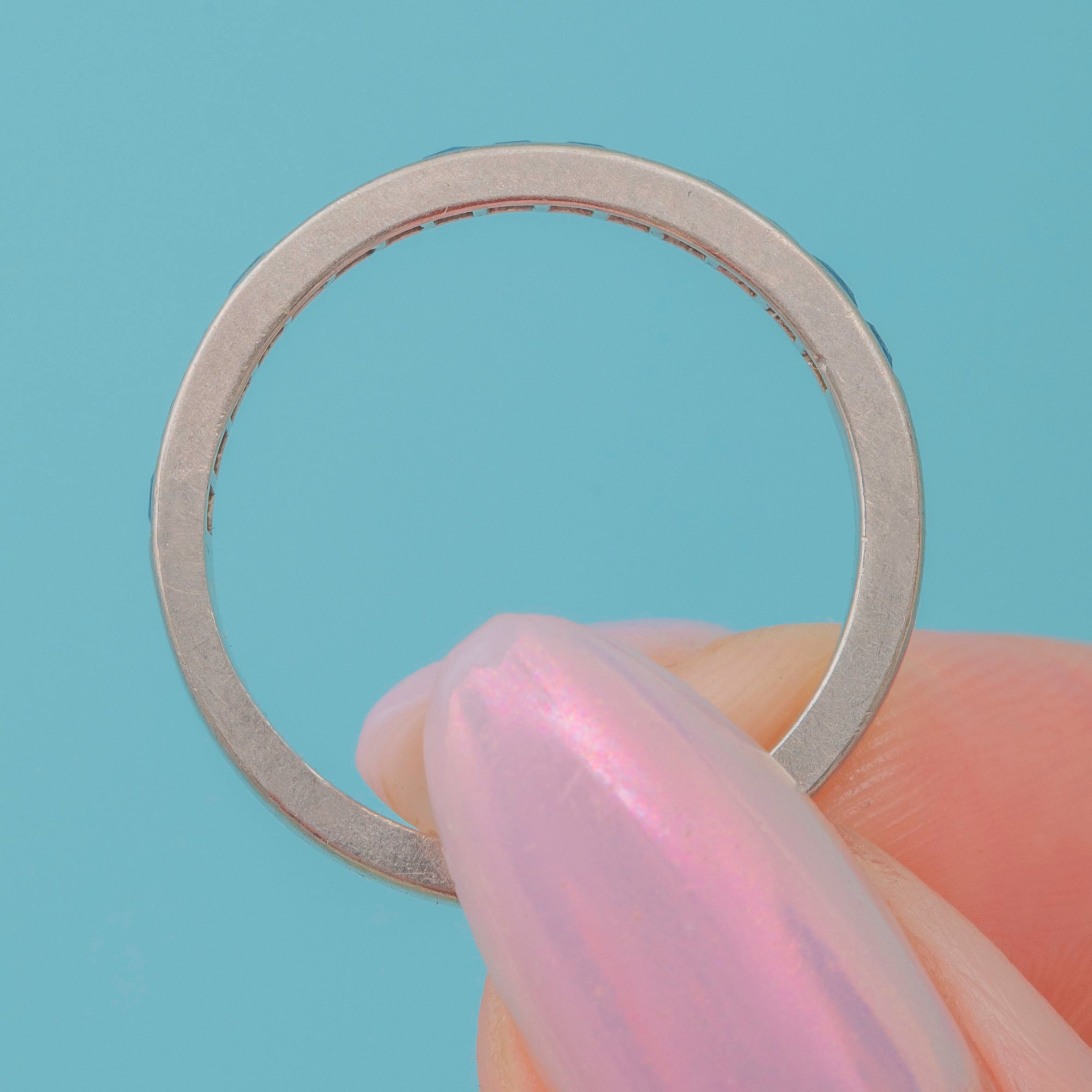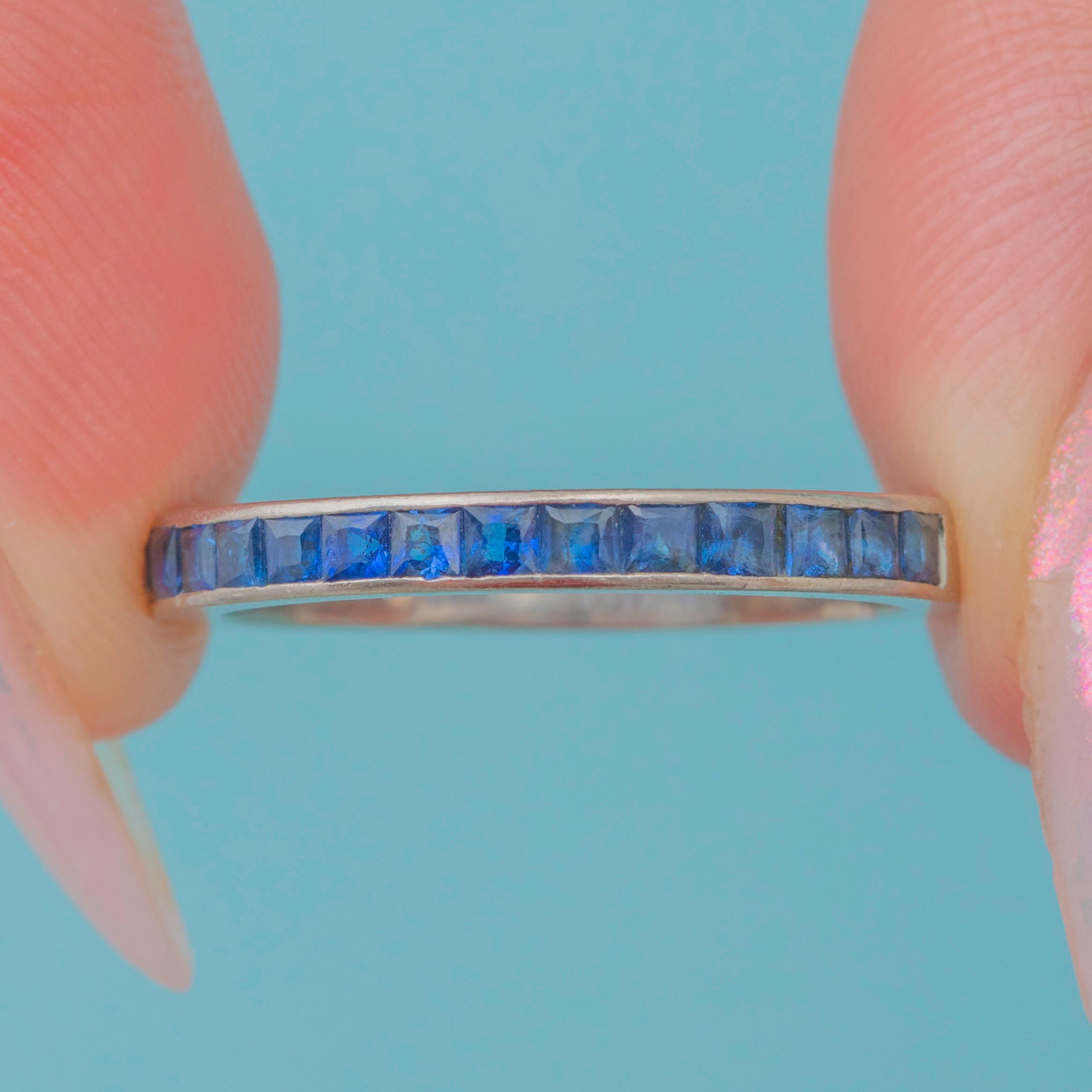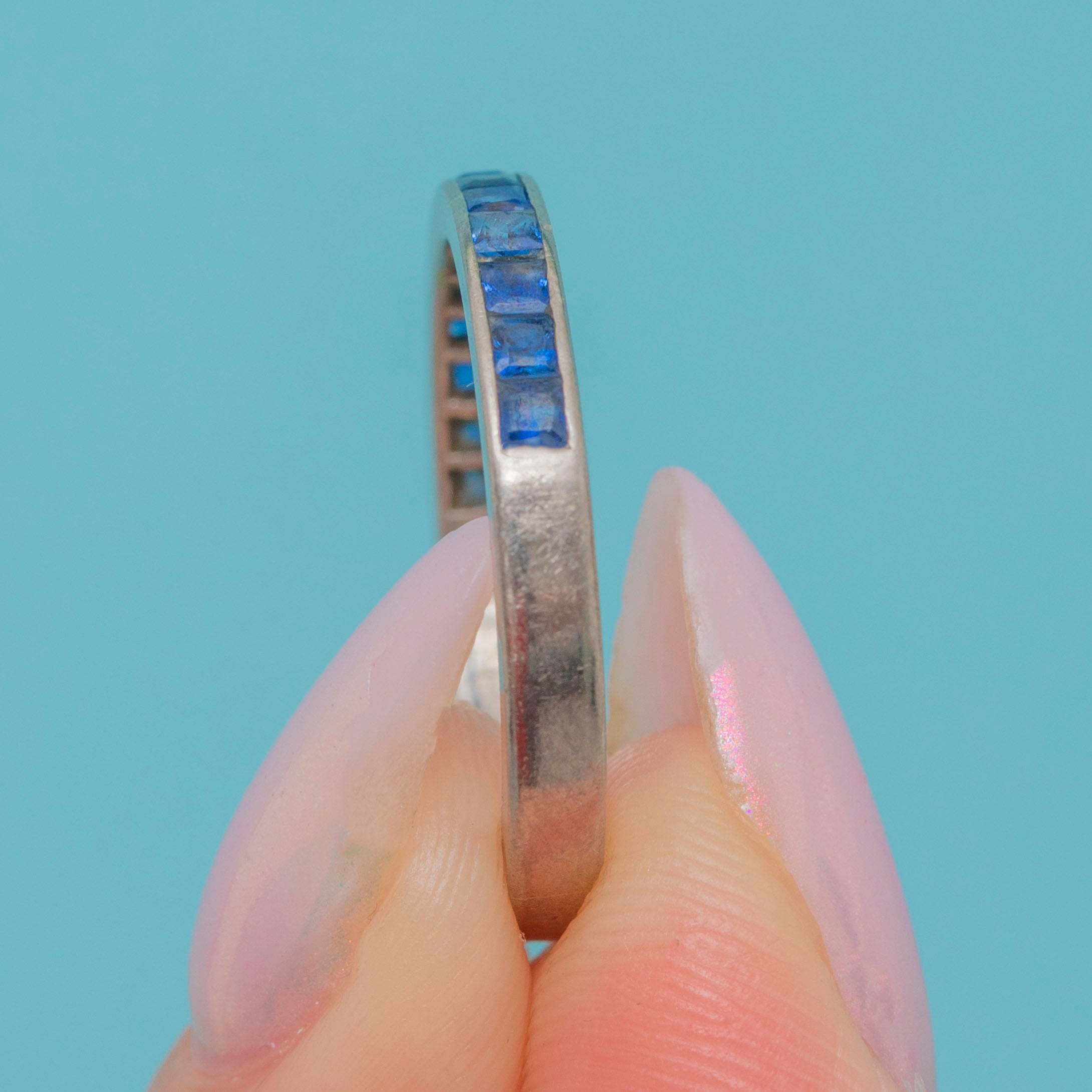 This Art Deco ring is crafted from glossy 18ct White Gold, its cool tone complementing the square Sapphires wonderfully. It's half eternity design provides excellent coverage, with the refined blue band adorning the width of your finger comfortably.