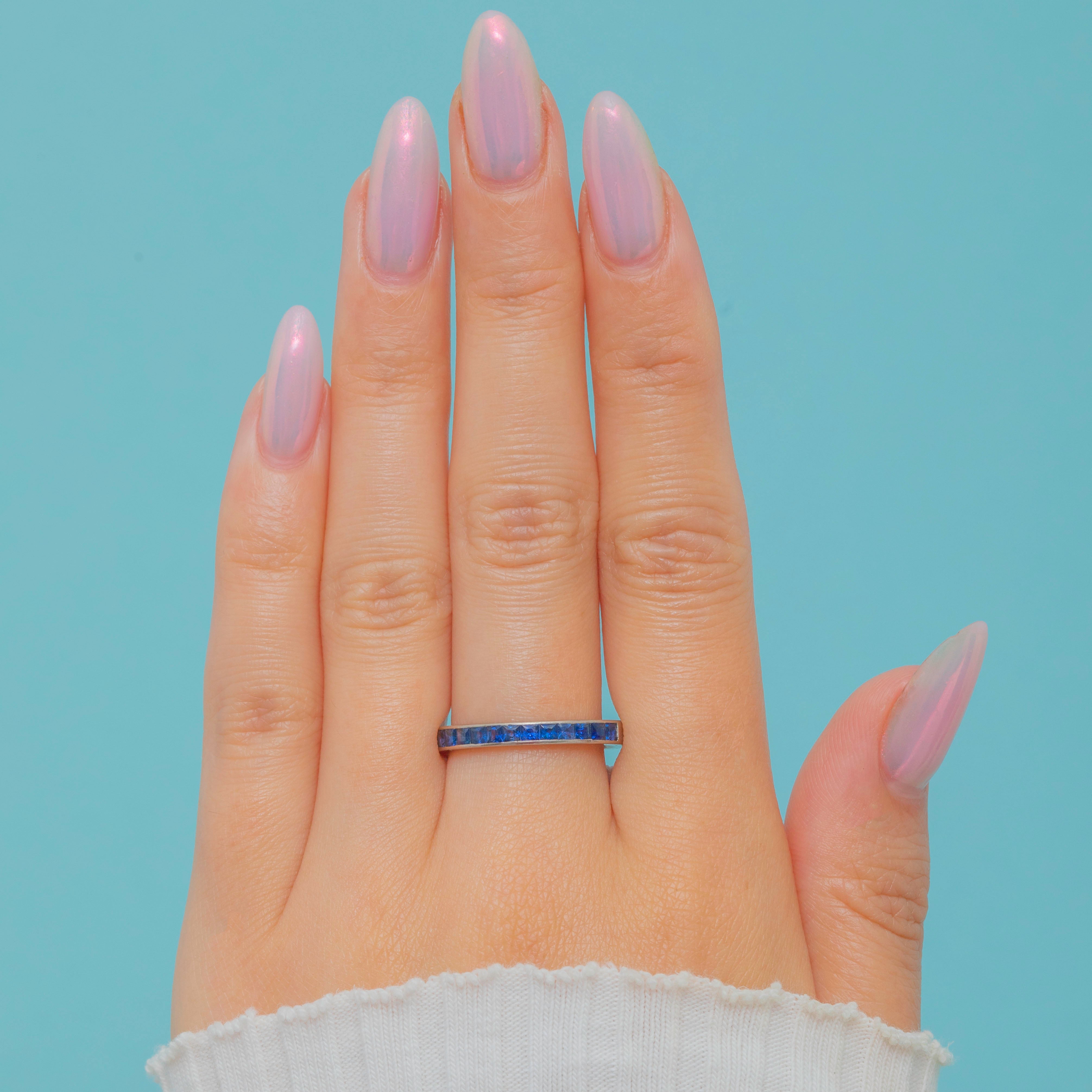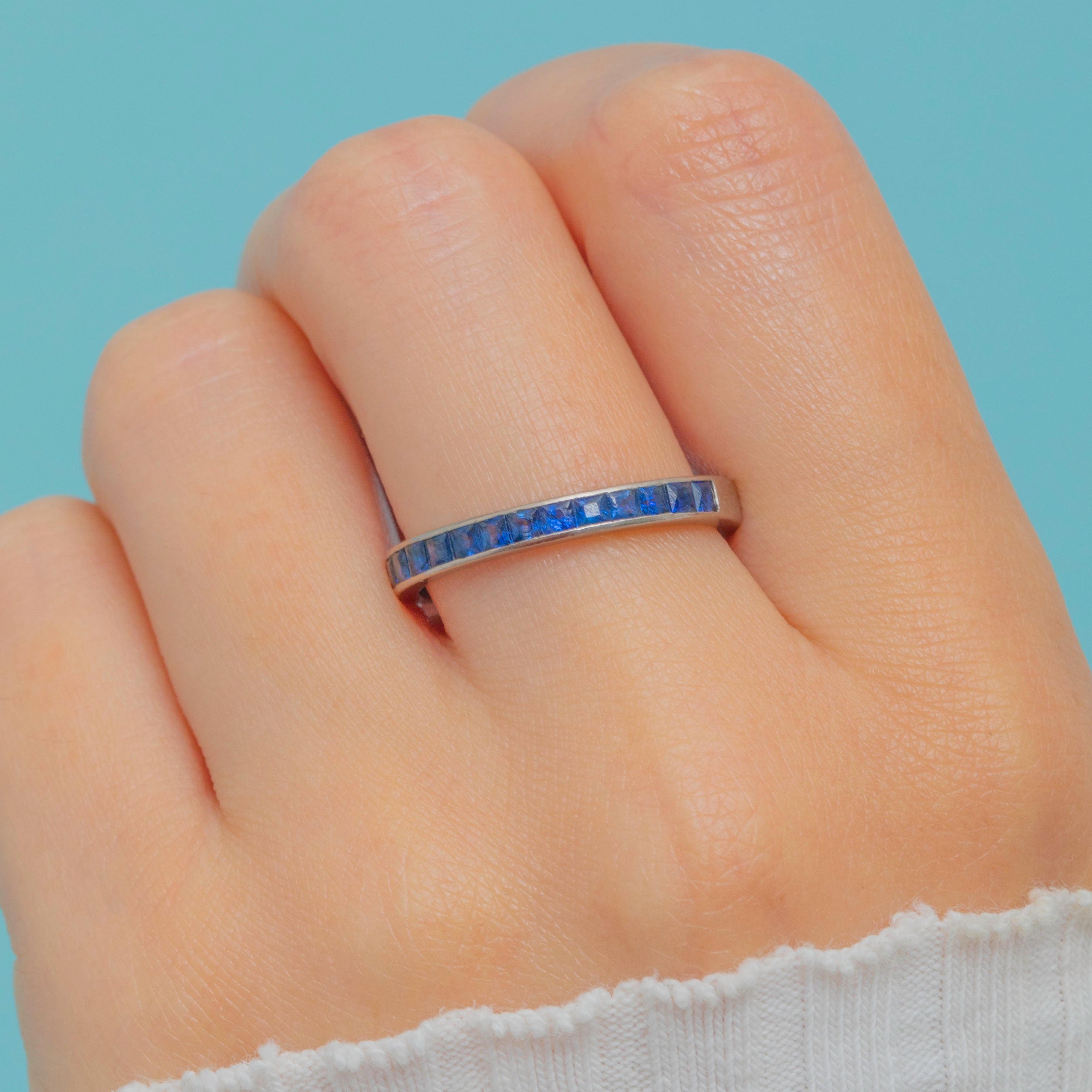 Crafted with meticulous attention to detail, this timeless half eternity ring features a dazzling array of royal blue Sapphires, with a gorgeous twinkle that radiates from every angle.