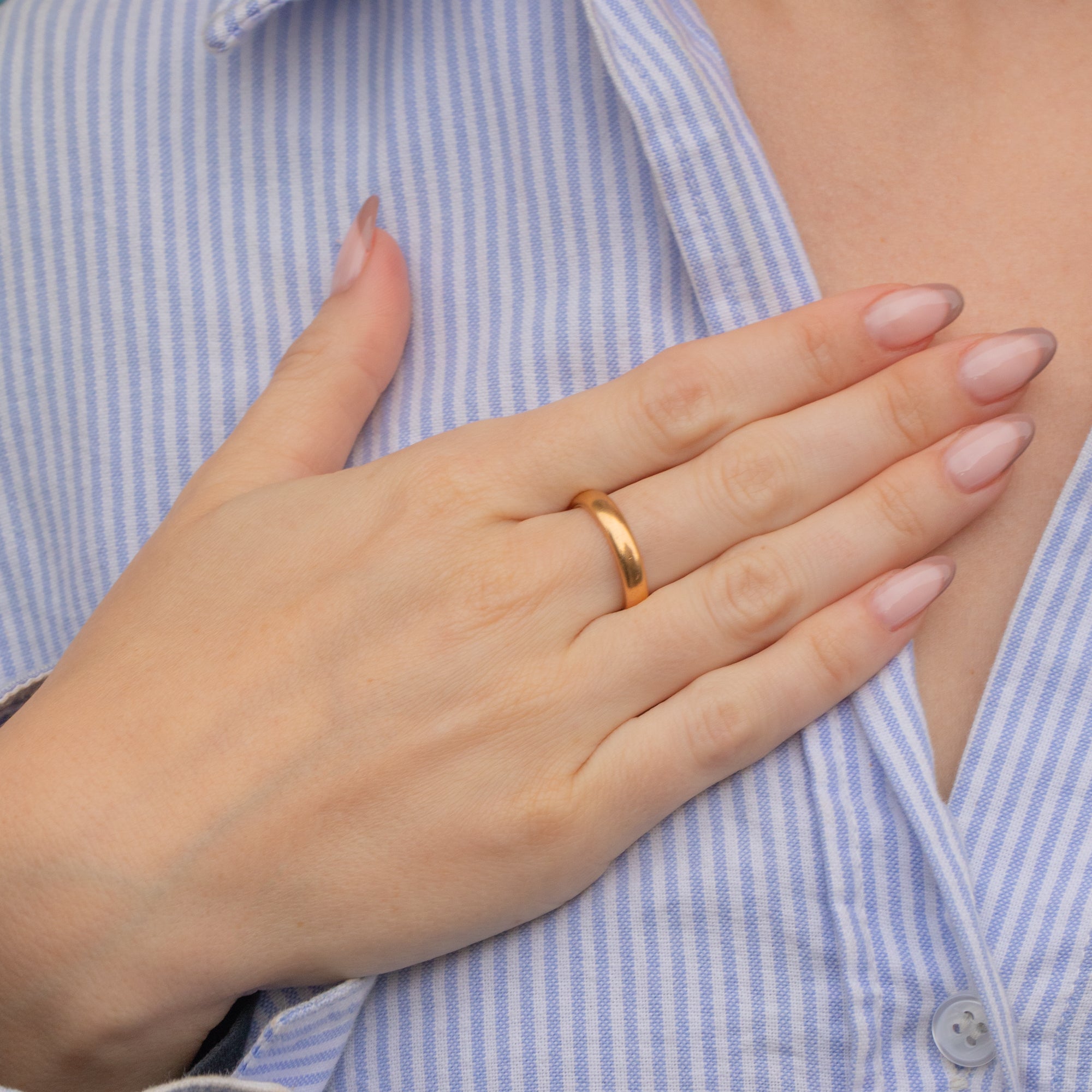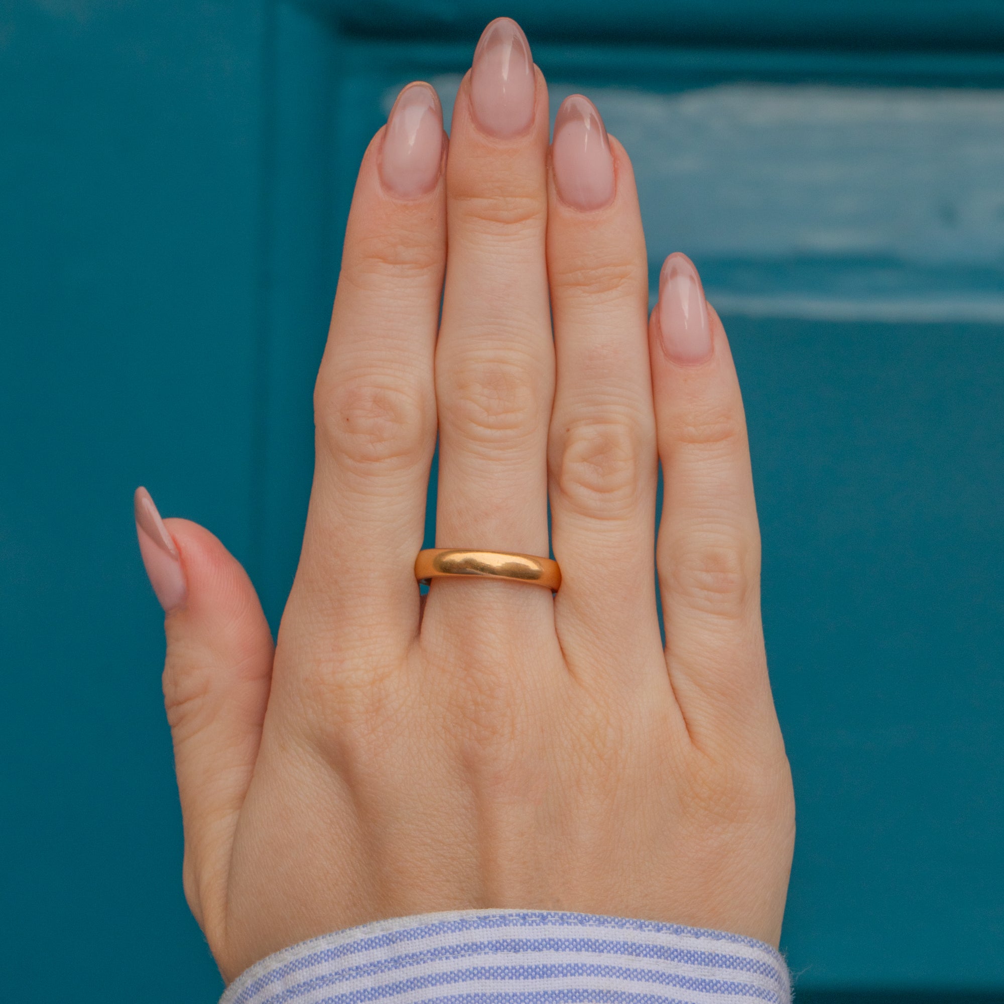 EXCELLENT. This Art Deco 22ct Gold wedding band is in excellent condition. The ring is fully hallmarked on the inside, and the band has a gorgeous saturated hue. She glides smoothly onto the finger and has a nice, weighty thickness and rounded profile for comfortable wear.