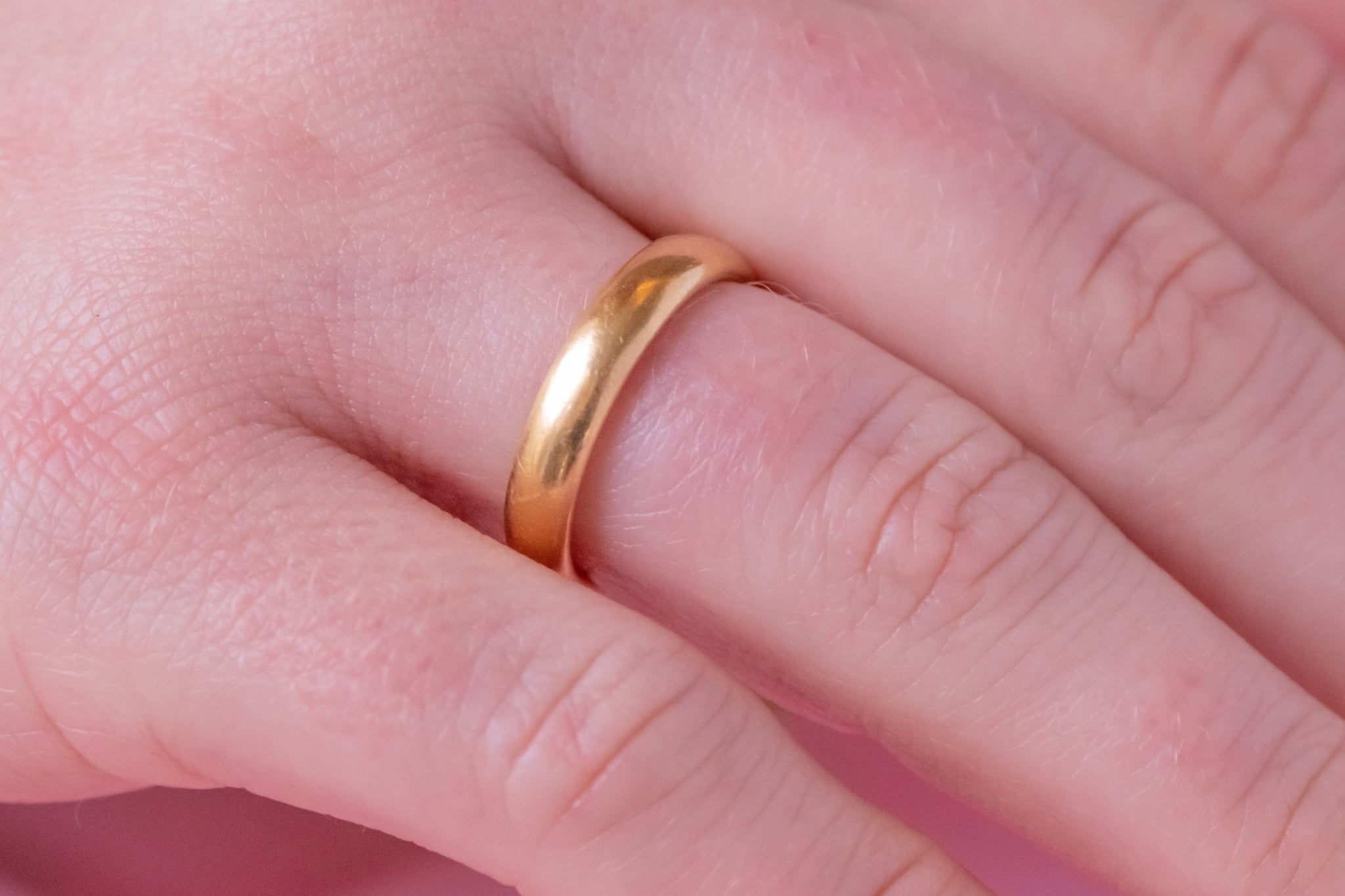 VERY GOOD. This Art Deco 22ct Gold wedding band is in very good condition throughout. The Gold is bright and the hallmarks are visible dating her back to 1925! There are a few dings around the band, but overall she's remained gorgeously intact. A wonderful heirloom piece, she's the perfect choice of ring.