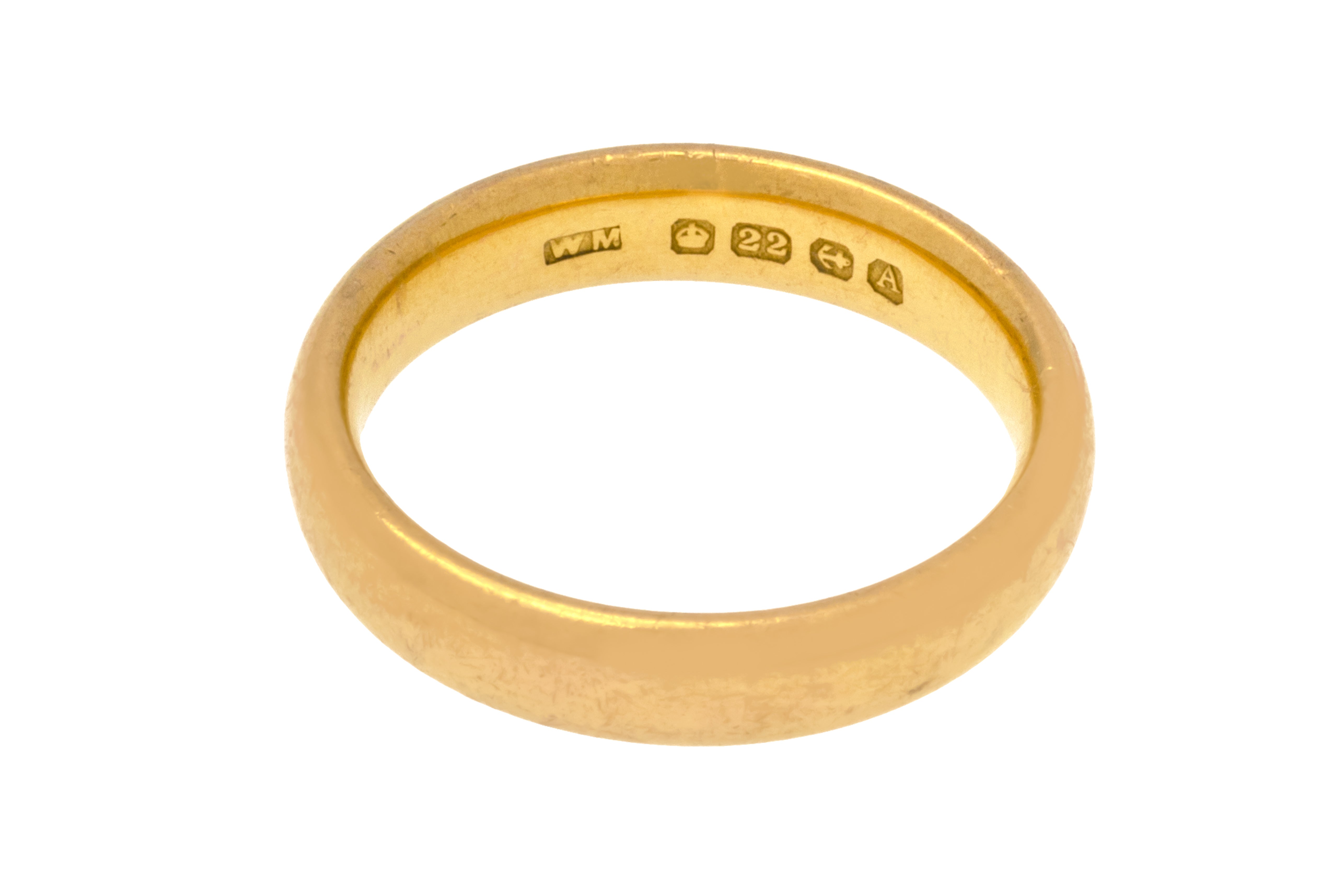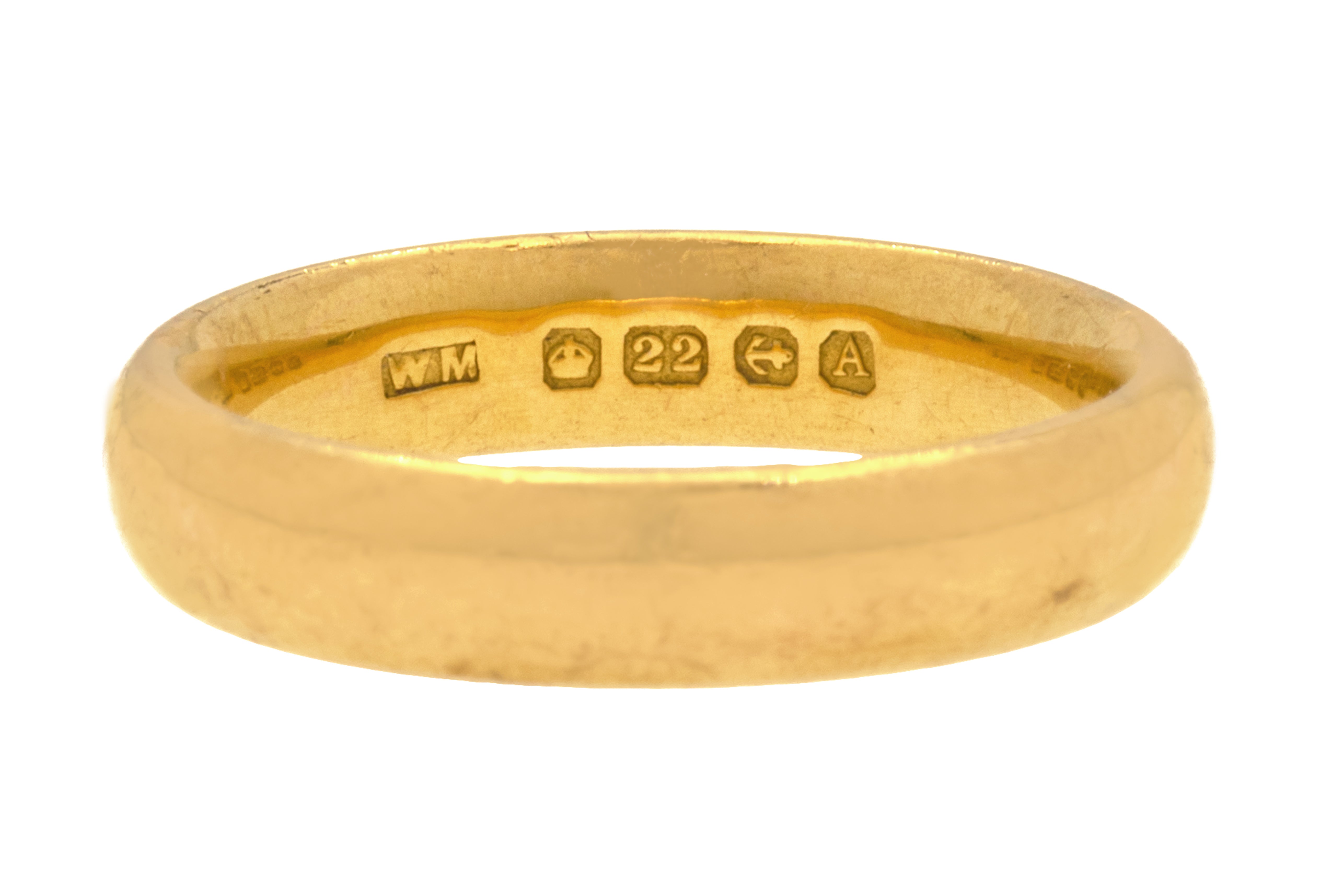 STAMPS & HALLMARKS: 'WM' makers mark, Crown, '22', Birmingham Anchor, Date Letter A for the year 1925 inside band.