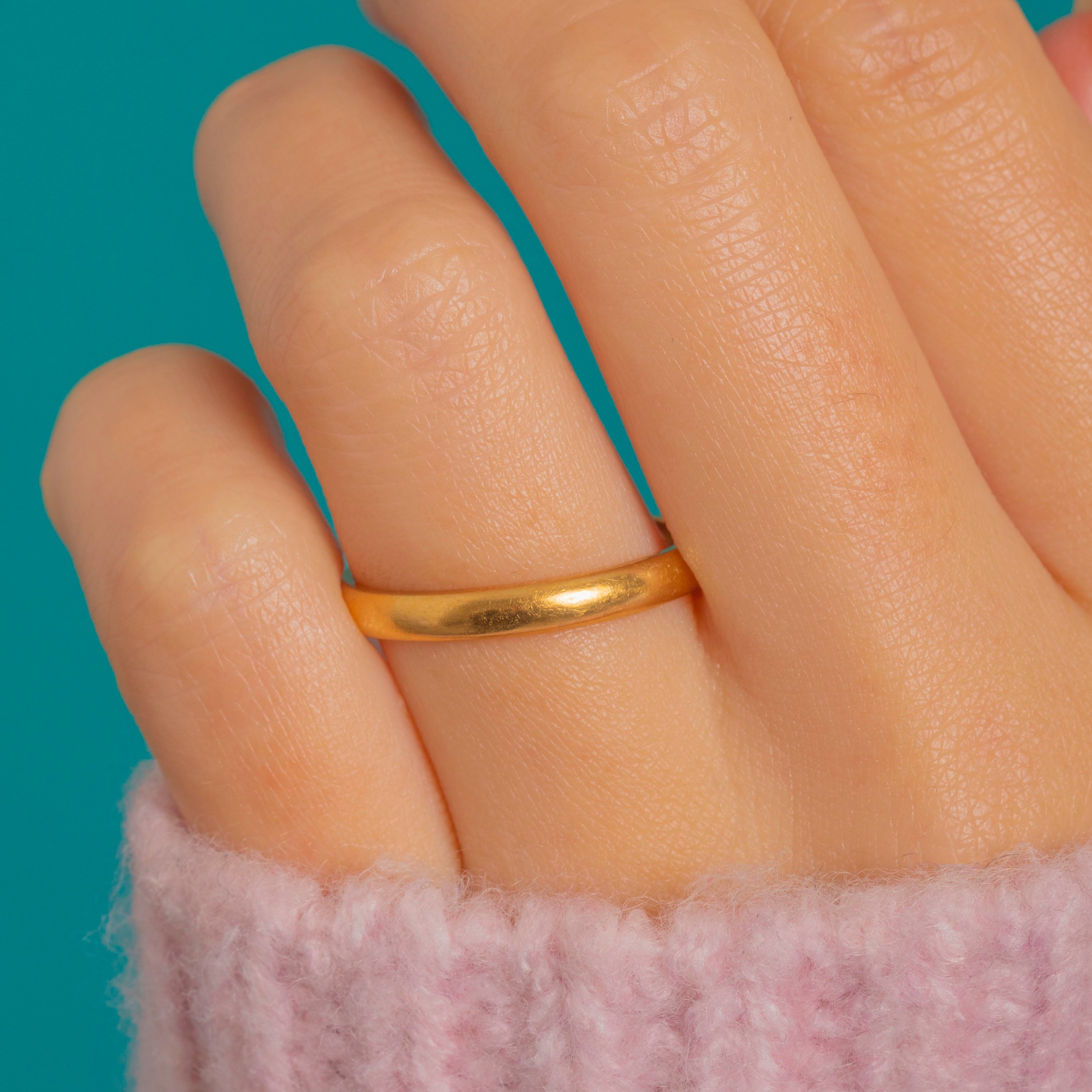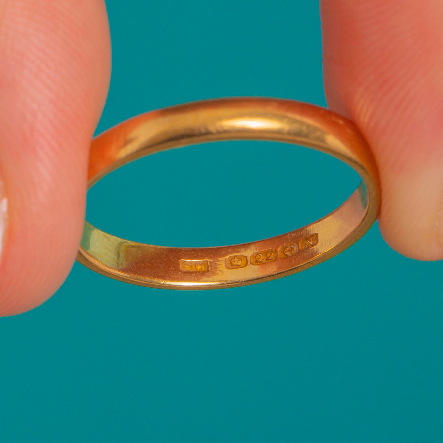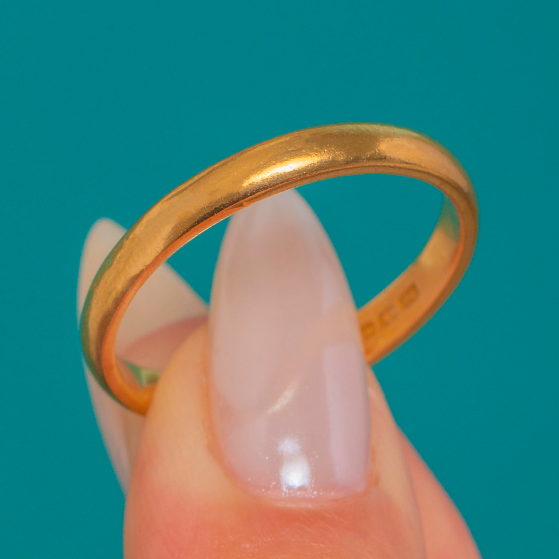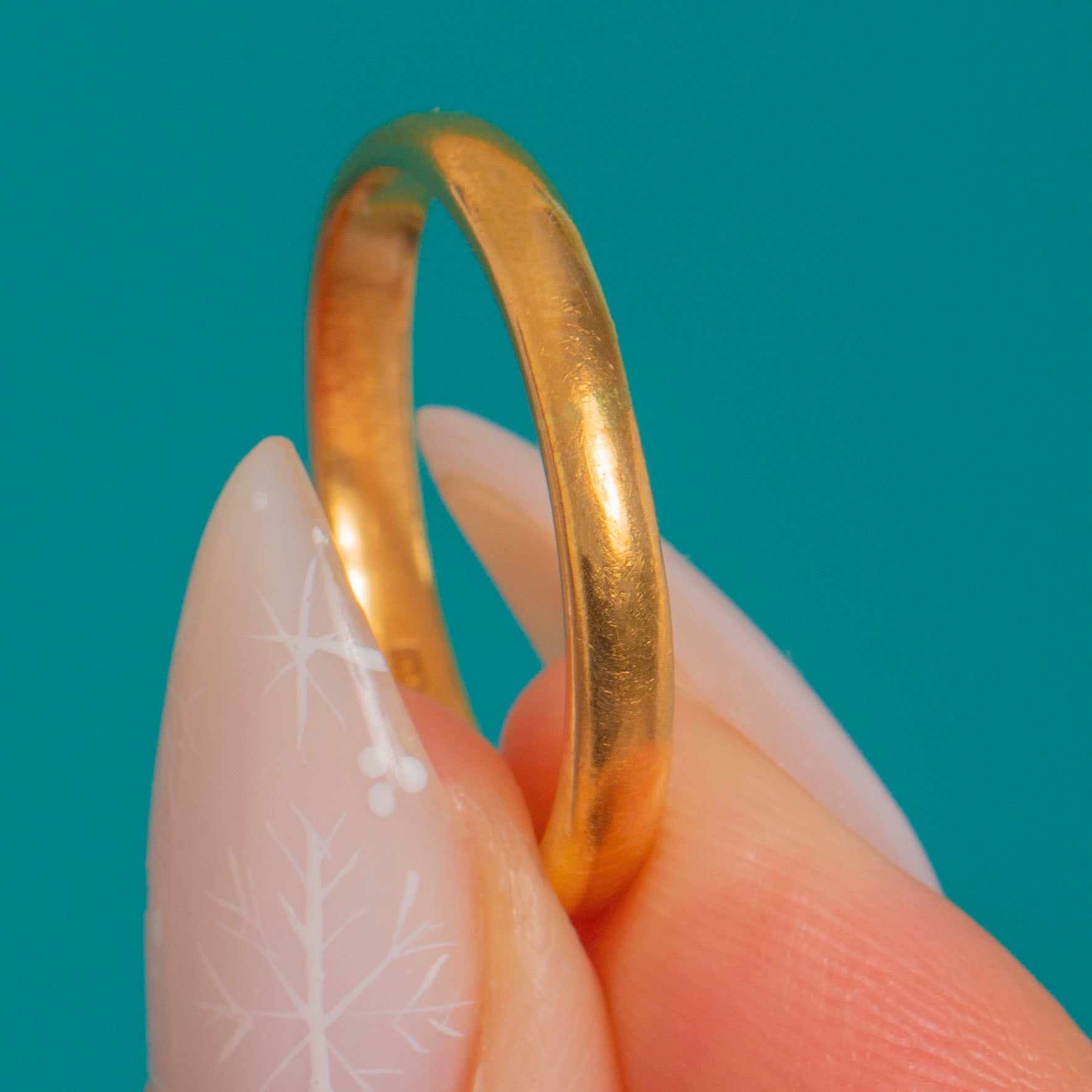Understated and beautifully classic, this Art Deco 22ct Gold wedding band is dated 1937. Hand-crafted with a softly domed court profile and a bright, mirror-like polish, it has that rich, buttery glow unique to high-carat Gold. Sleek, low-profile and effortlessly elegant, it’s a timeless ring that pairs seamlessly with an engagement ring or stacks with ease.