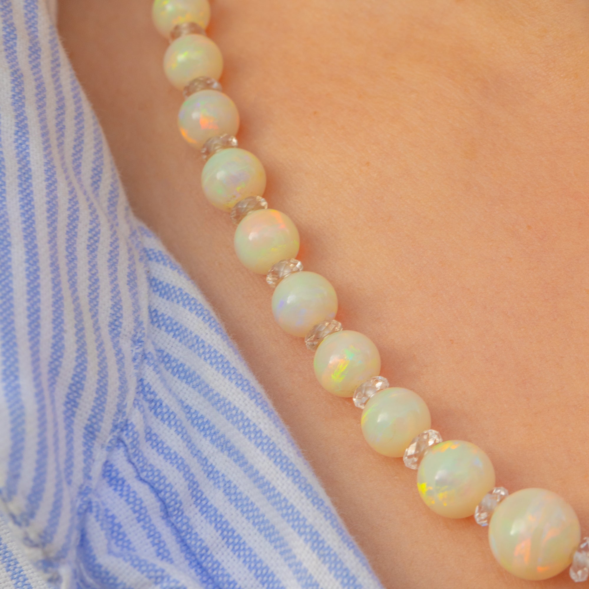A spectacular Art Deco necklace strung with vivid natural Opal beads interspersed with luminous Rock Crystal, closed by a refined 18ct White Gold safety clasp set with twinkling Diamonds.