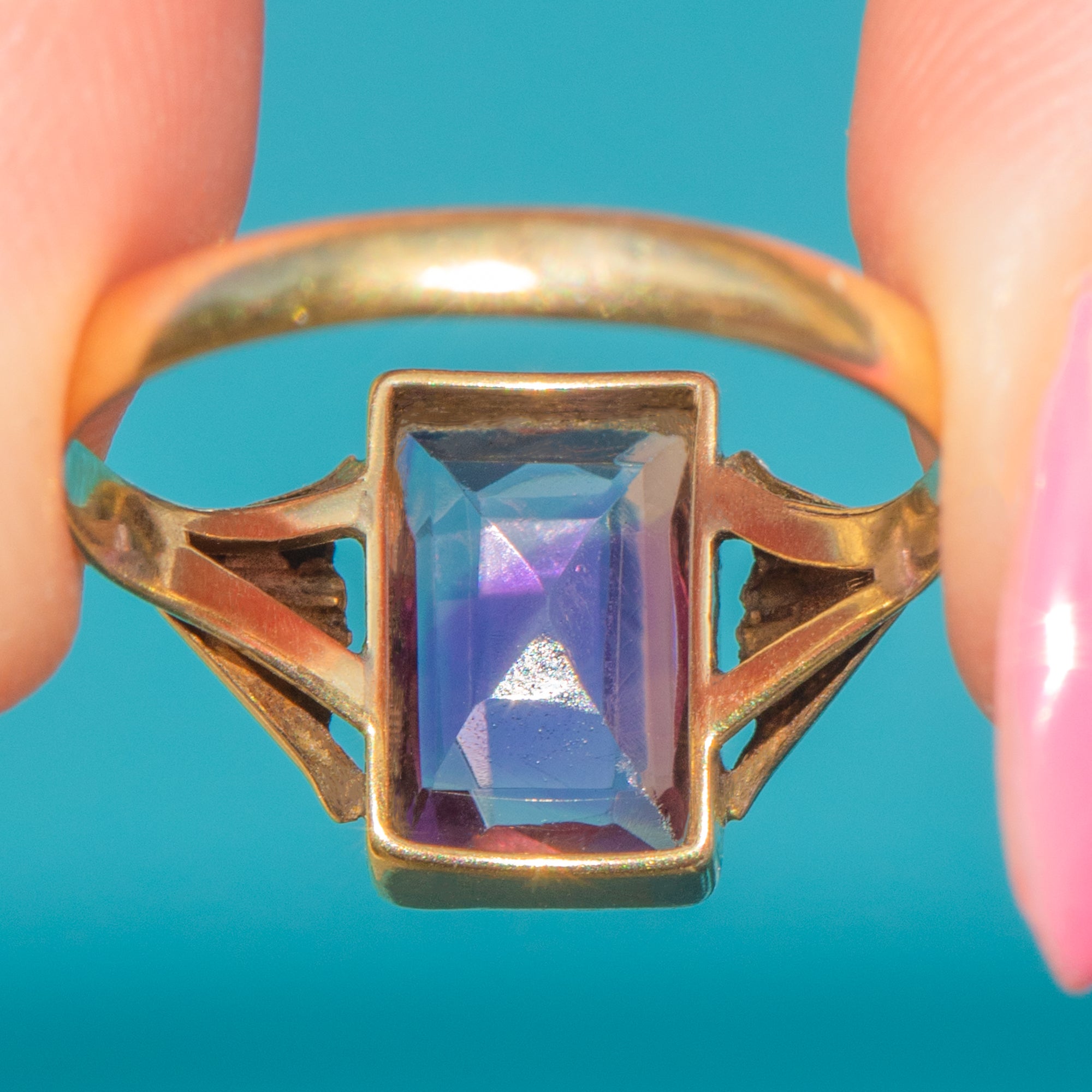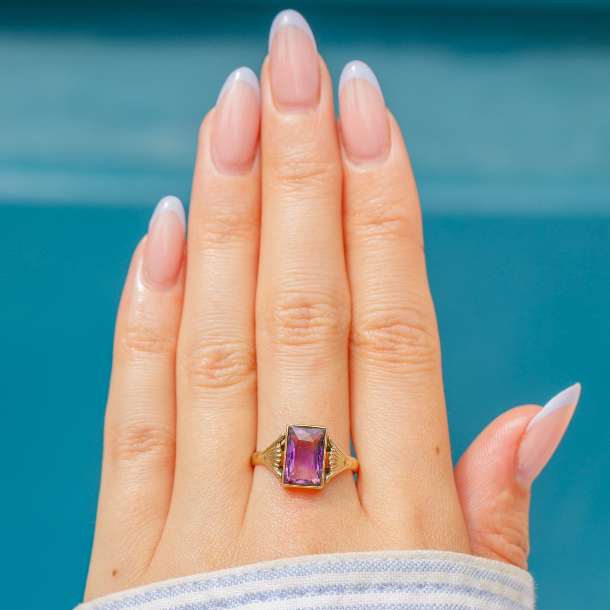 A true gem, this Art Deco 9ct Gold Amethyst ring is a striking piece. The rectangular-cut 2.40ct Amethyst is absolutely gorgeous, flanked by undeniably telling Art Deco shoulders!
