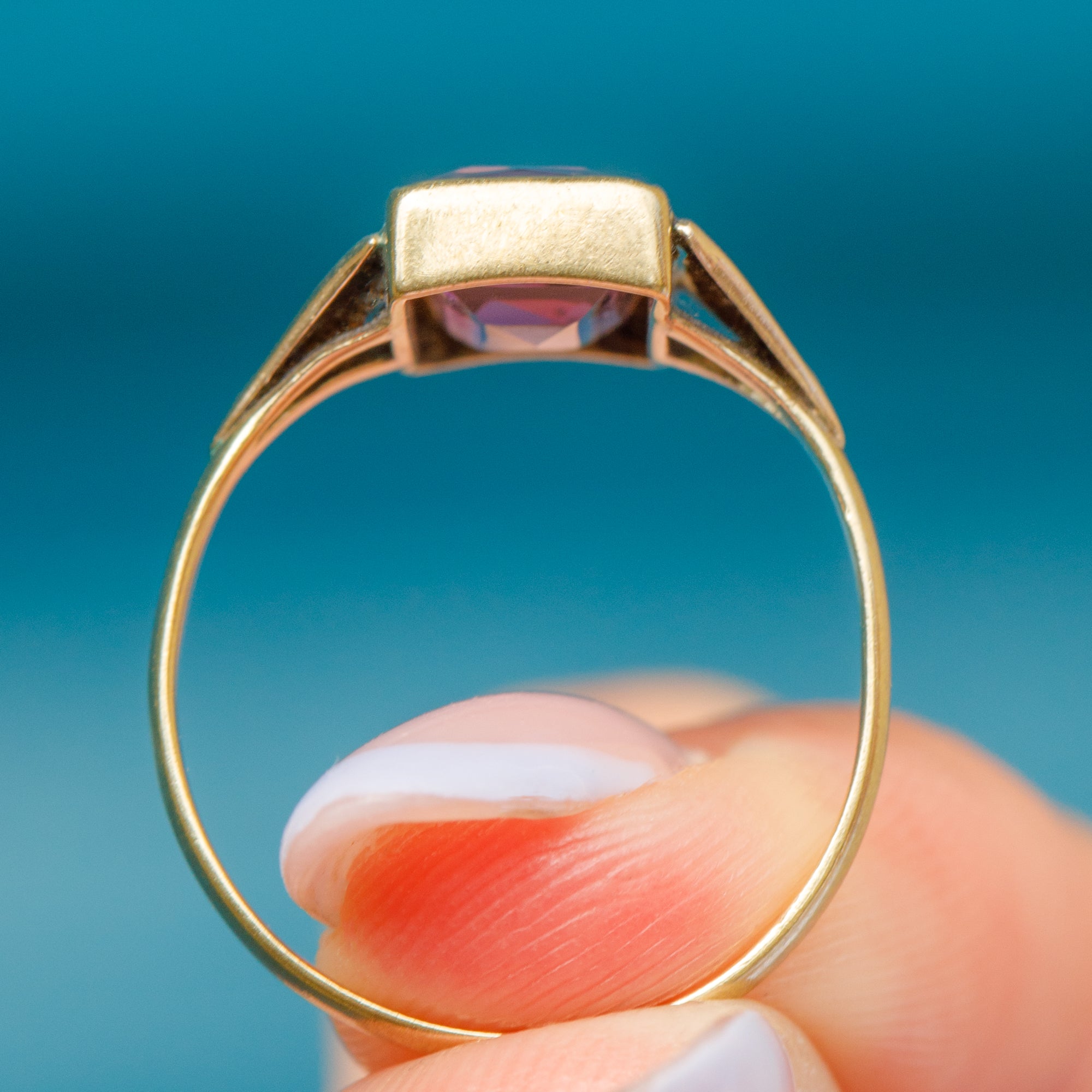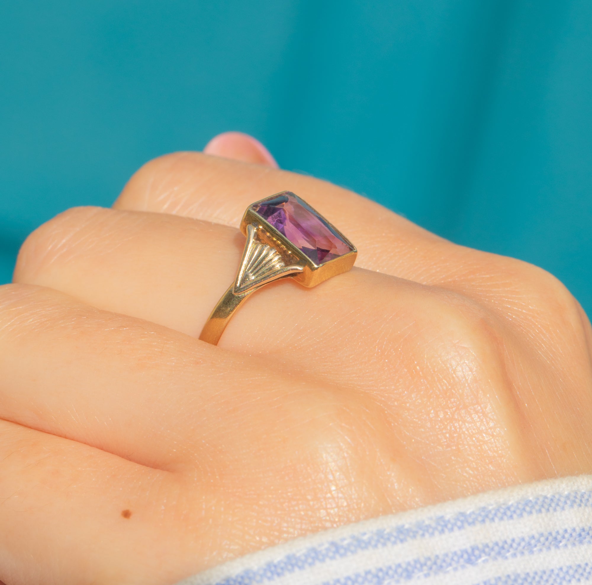 VERY GOOD: This Art Deco 9ct Gold Amethyst ring is in very good condition. The Amethyst is securely set and is free from any chips or damage to note. The shoulders are beautifully crisp, and the ring shank allows you to wear this piece comfortably. While there is a little bit of wear at the back of the band, this is of course not visible during wear. A striking piece of Art Deco jewellery ready to be enjoyed for many more years to come!