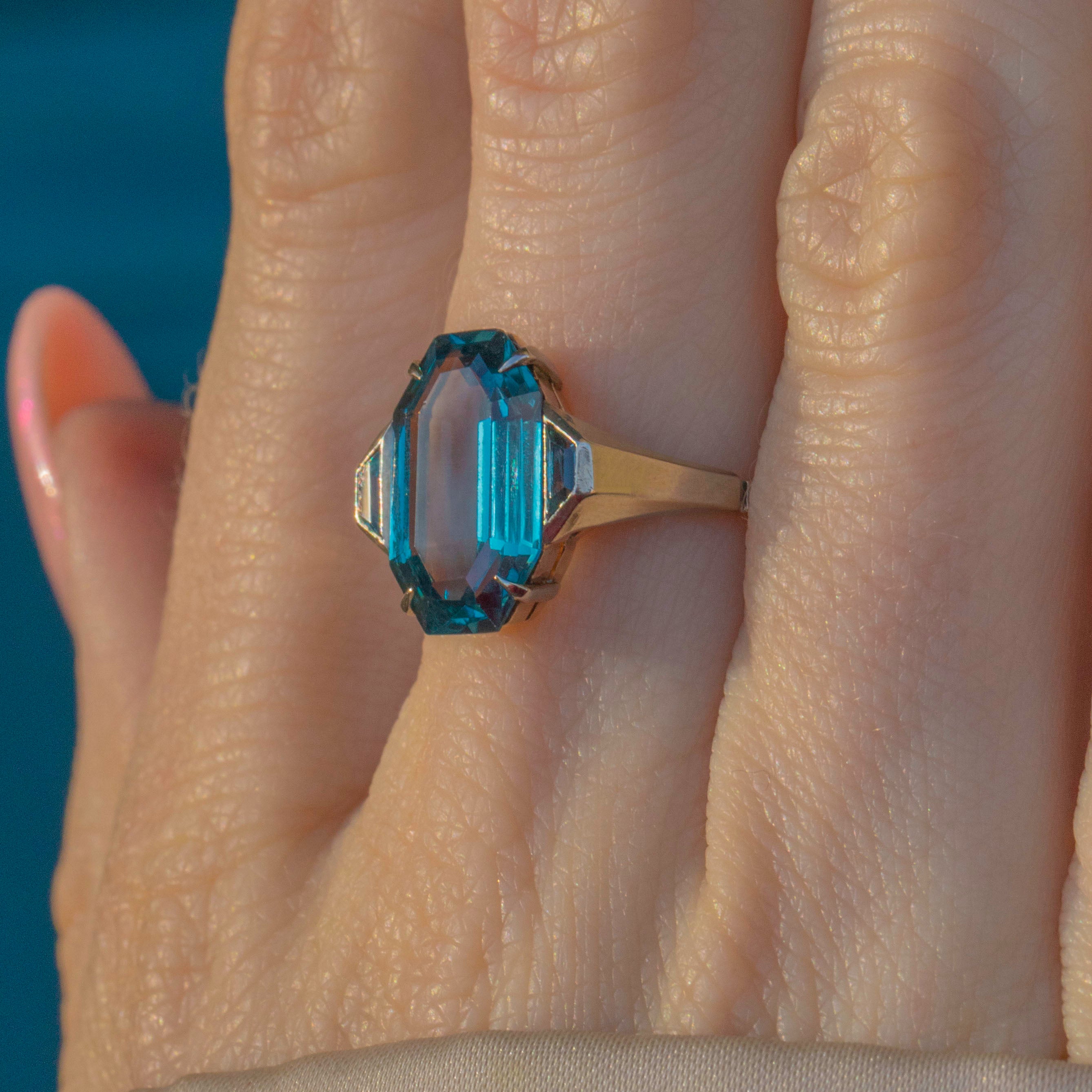 Step back into the most glamorous era with this exquisite Art Deco 9ct Gold Blue Topaz ring! The large 3.75ct octagon-cut Topaz boasts a stunning sea-blue hue and is flanked by topaz-set shoulders set in glowing White Gold, creating a show-stopping piece.