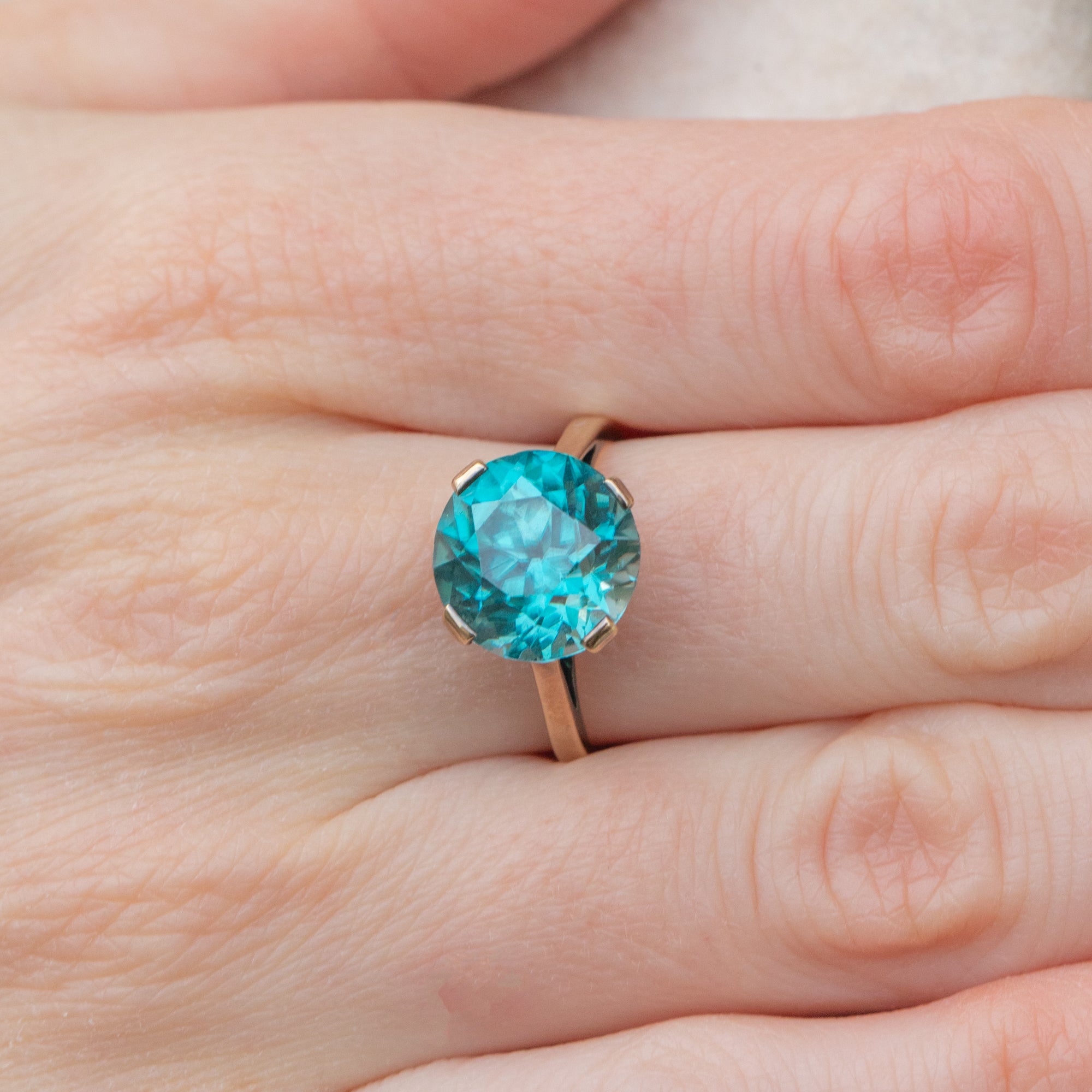 This 9ct Gold Art Deco blue Zircon solitaire ring is simply stunning! She boasts a luminous 7.80ct sky blue Zircon that glistens from every angle as she moves in the light.