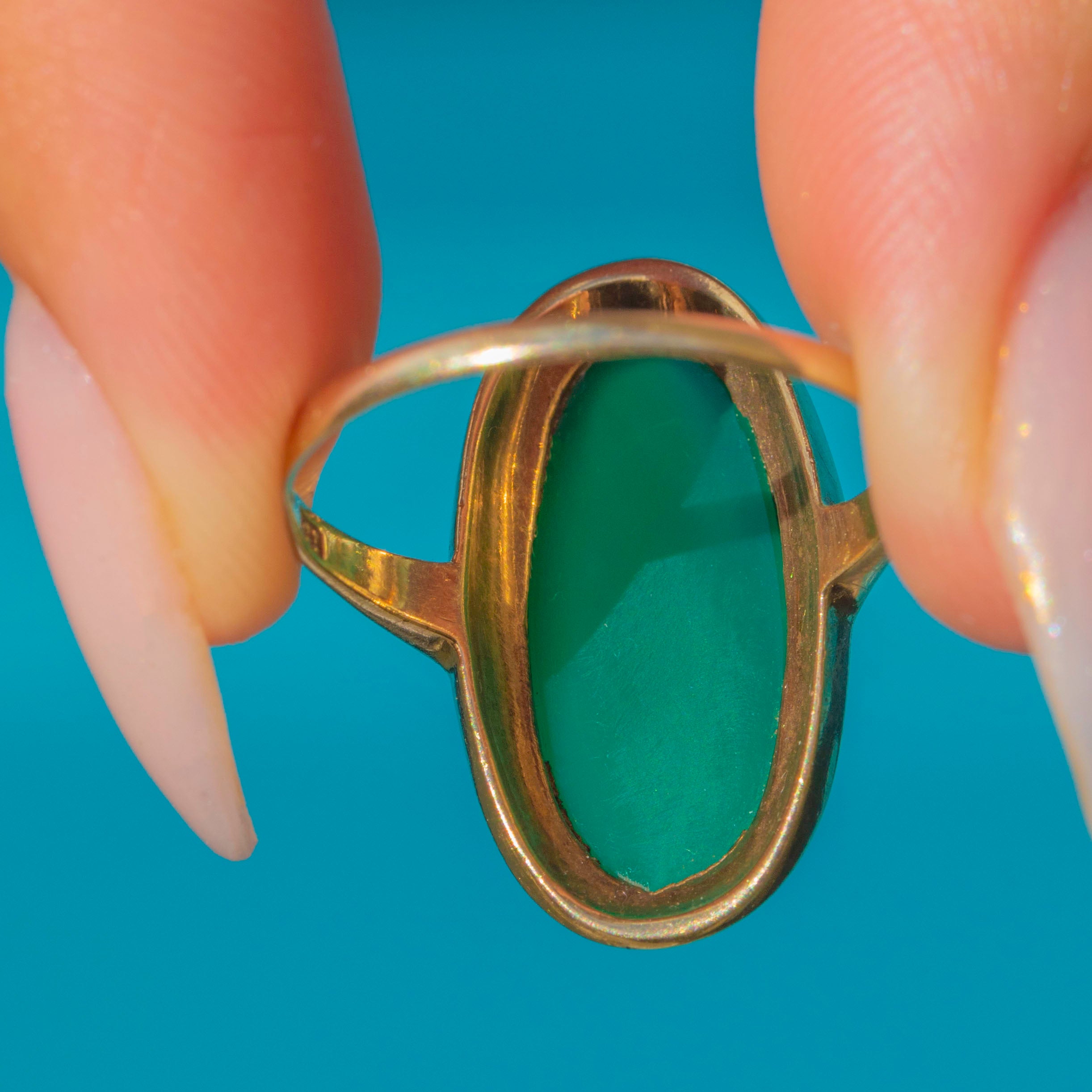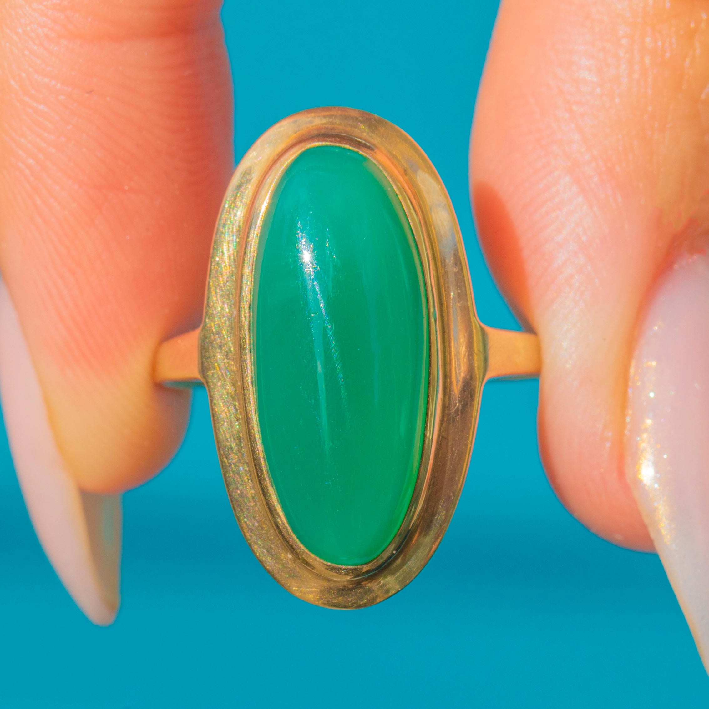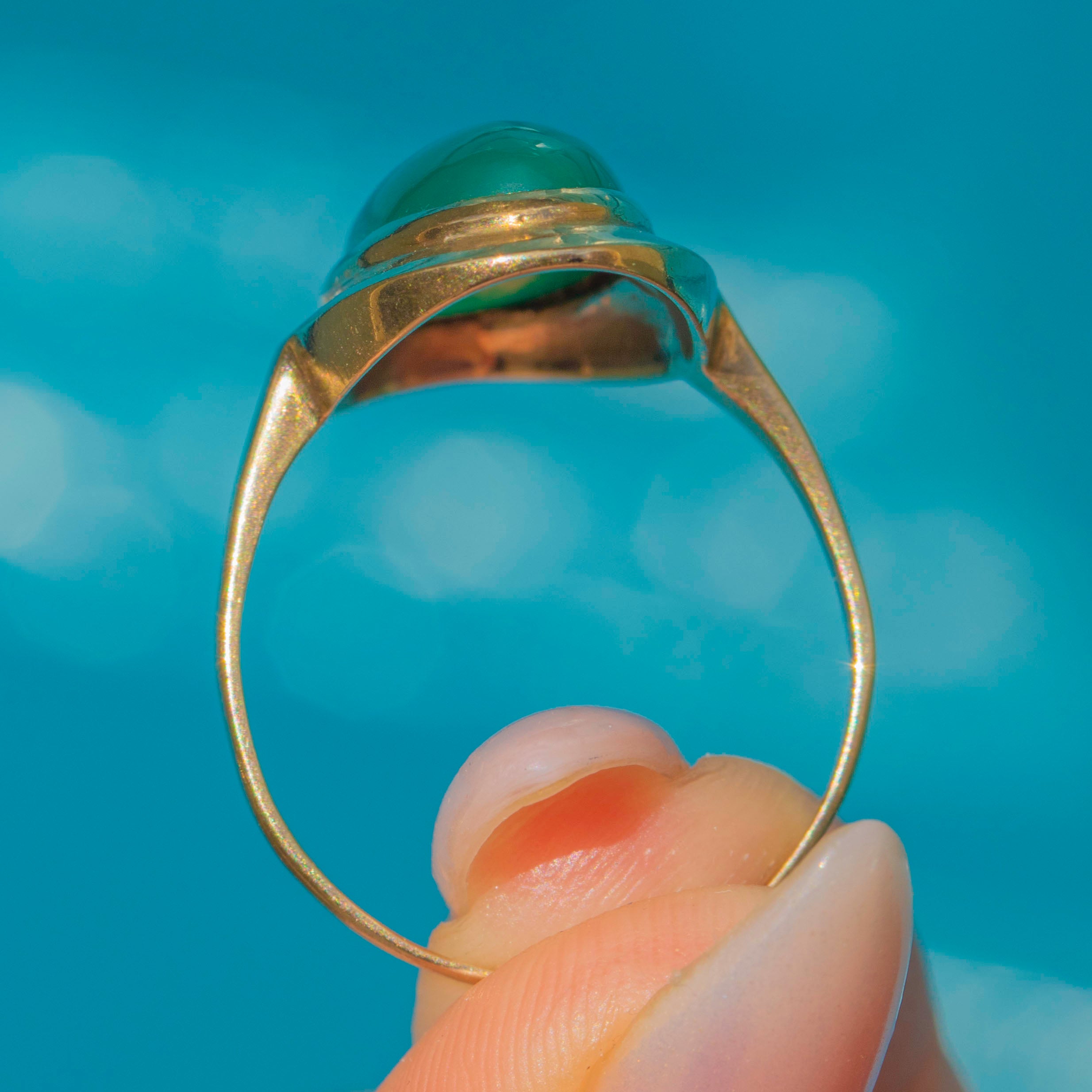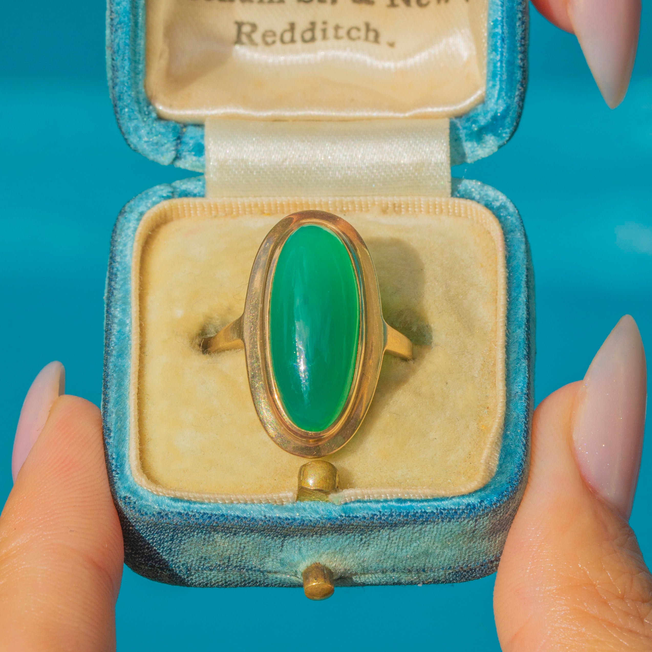 A luminous Art Deco chrysoprase ring in warm 9ct Gold, c.1920. The glossy green cabochon has that coveted inner glow, sitting low and smooth on the finger for effortless, everyday elegance.