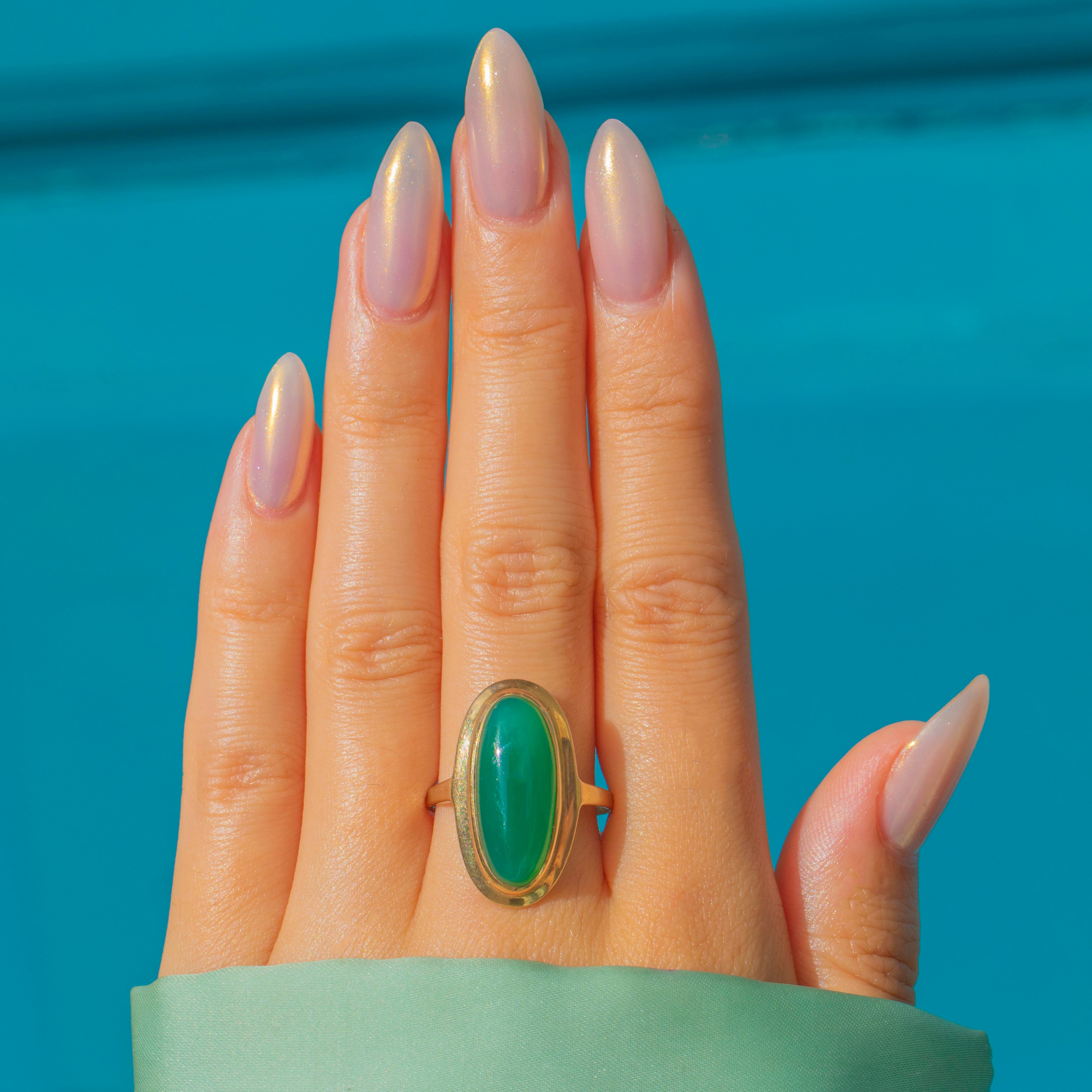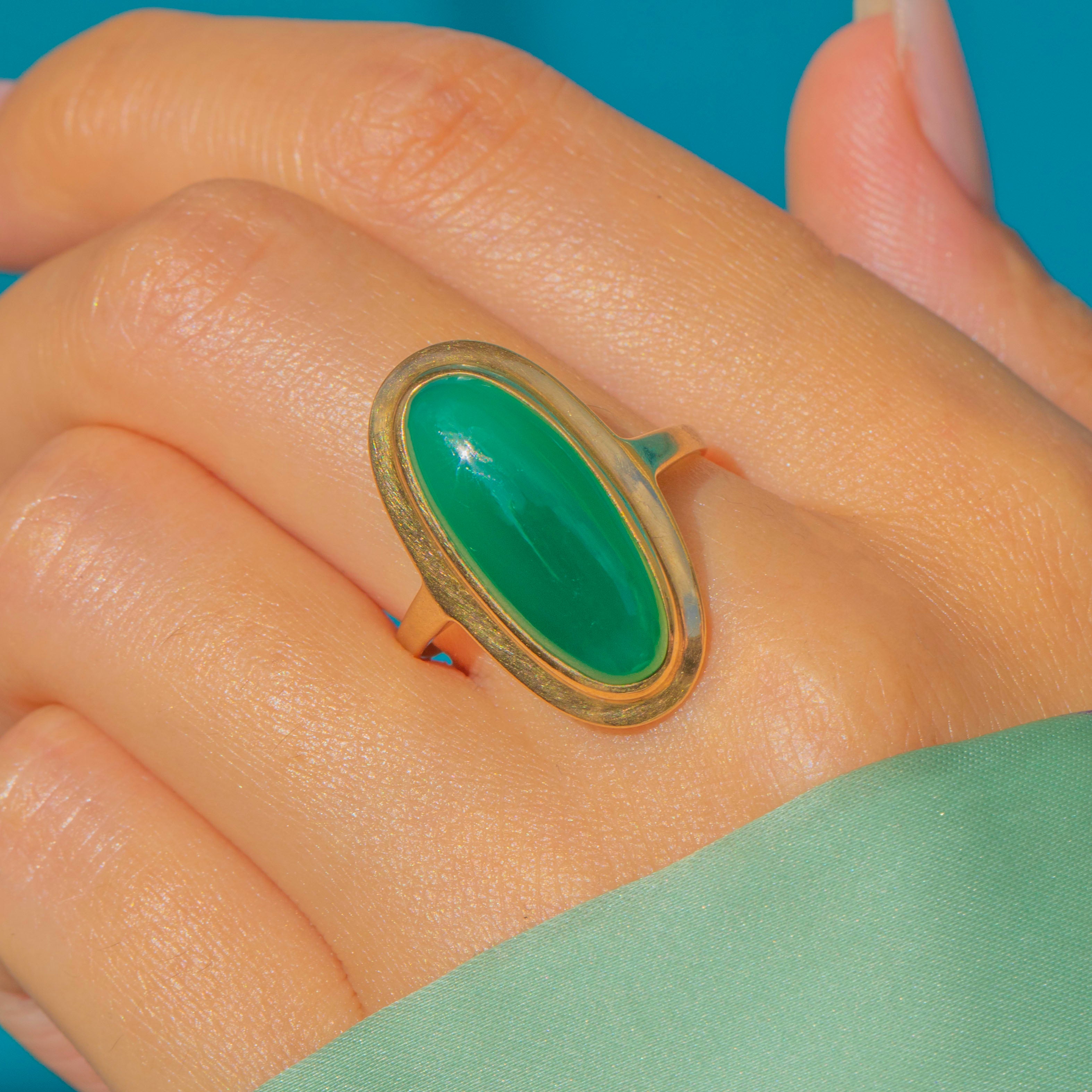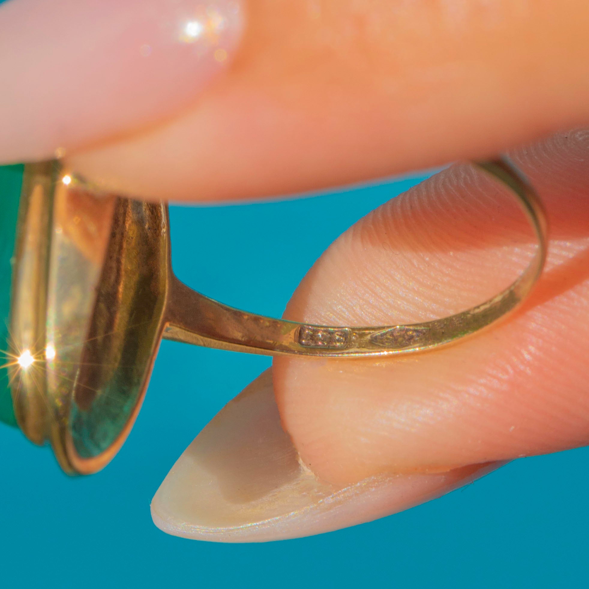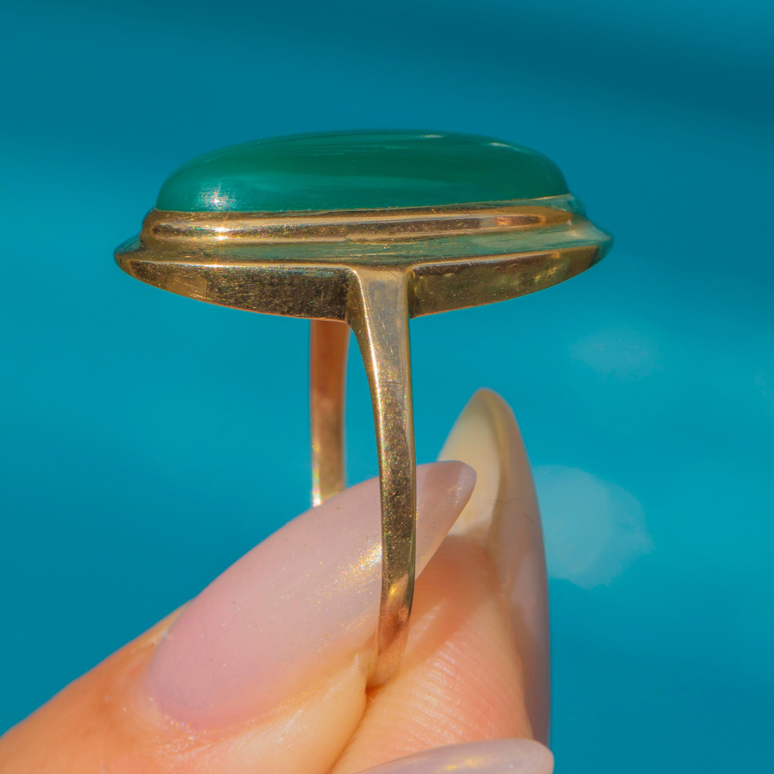 A luminous Art Deco chrysoprase ring in warm 9ct Gold, c.1920. The glossy green cabochon has that coveted inner glow, sitting low and smooth on the finger for effortless, everyday elegance.