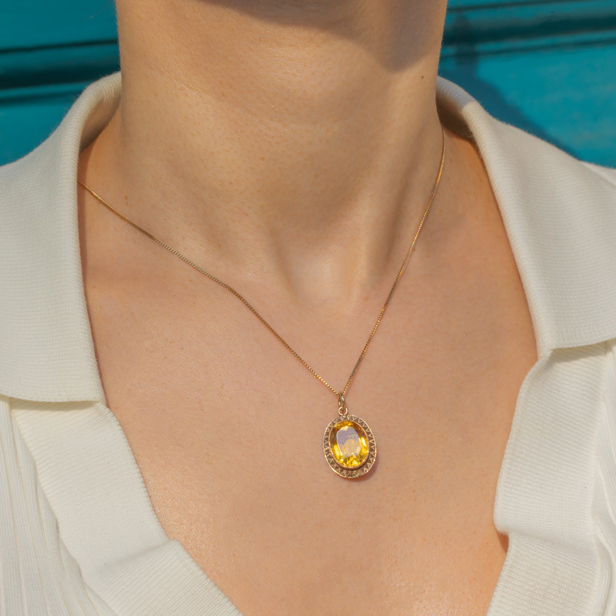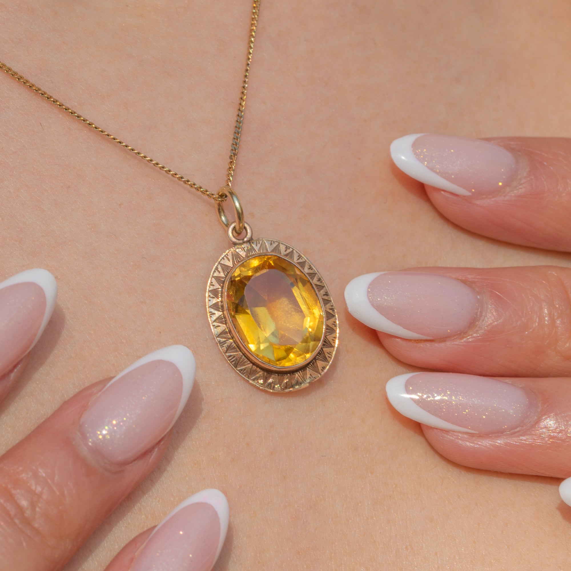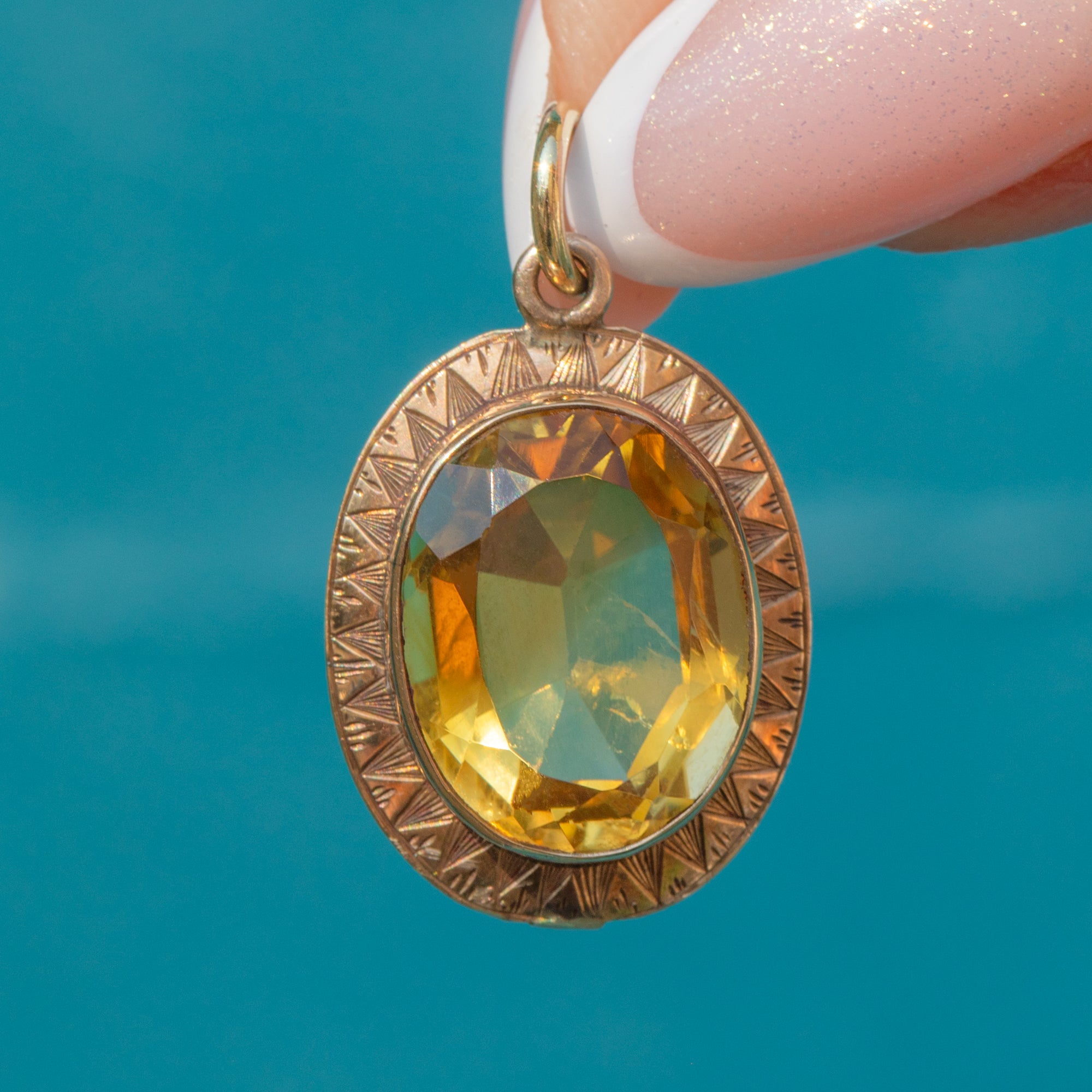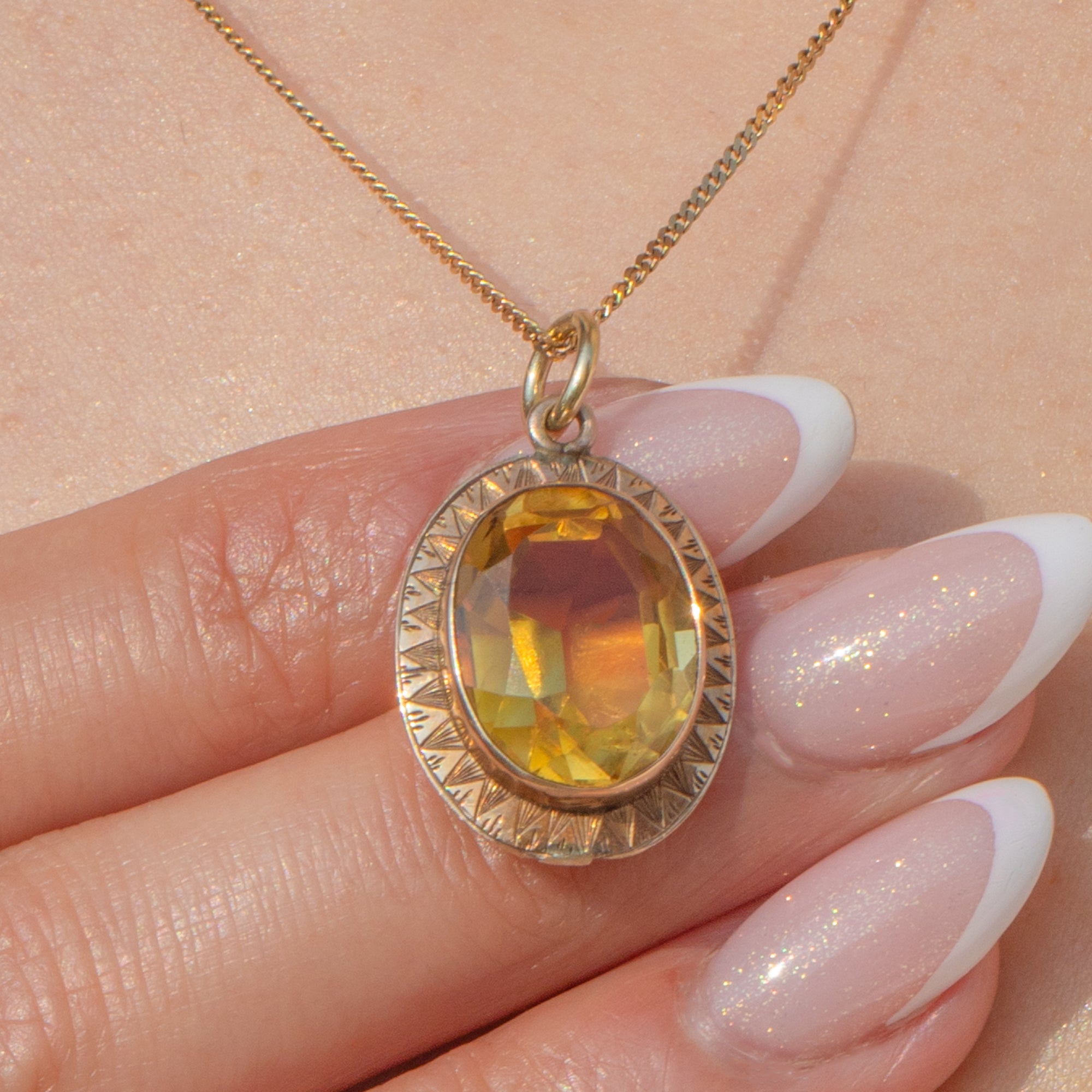 Faceted to perfection, the 4.50ct Citrine glimmers magnificently when she catches the light, haloed by geometric engravings that showcase the exquisite craftsmanship of the Art Deco era. This honey-hued pendant will add a luxurious accent of colour to your attire!