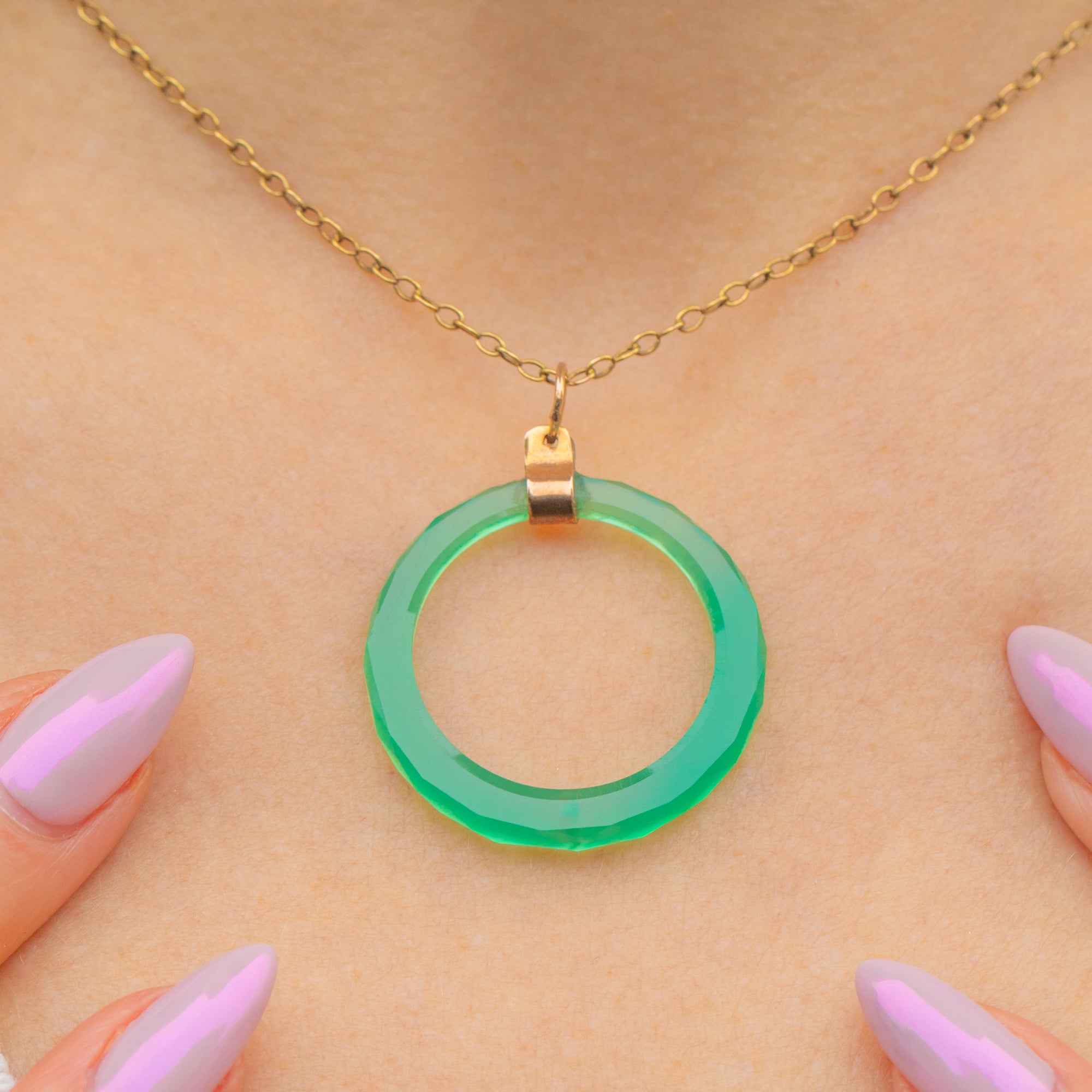 A sleek Art Deco pendant fashioned from vivid green glass, cut with crisp faceted edges for fabulous geometric sparkle. The clean circular form is finished with a polished 9ct Gold bale for a refined contrast of colour and texture.
