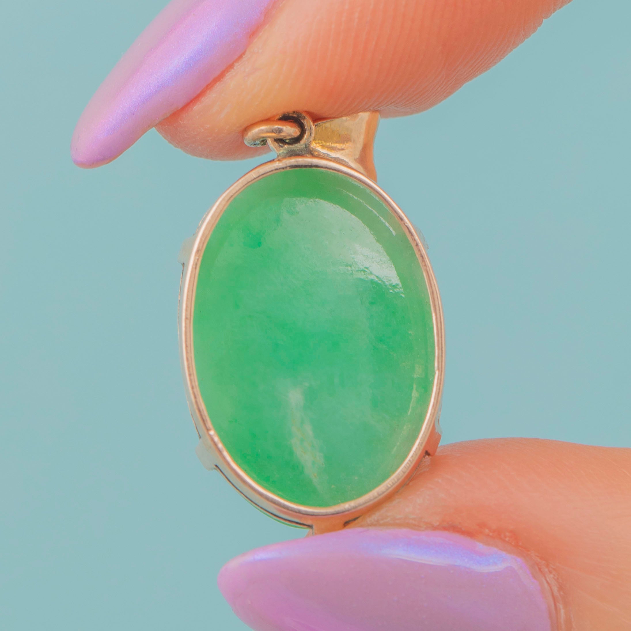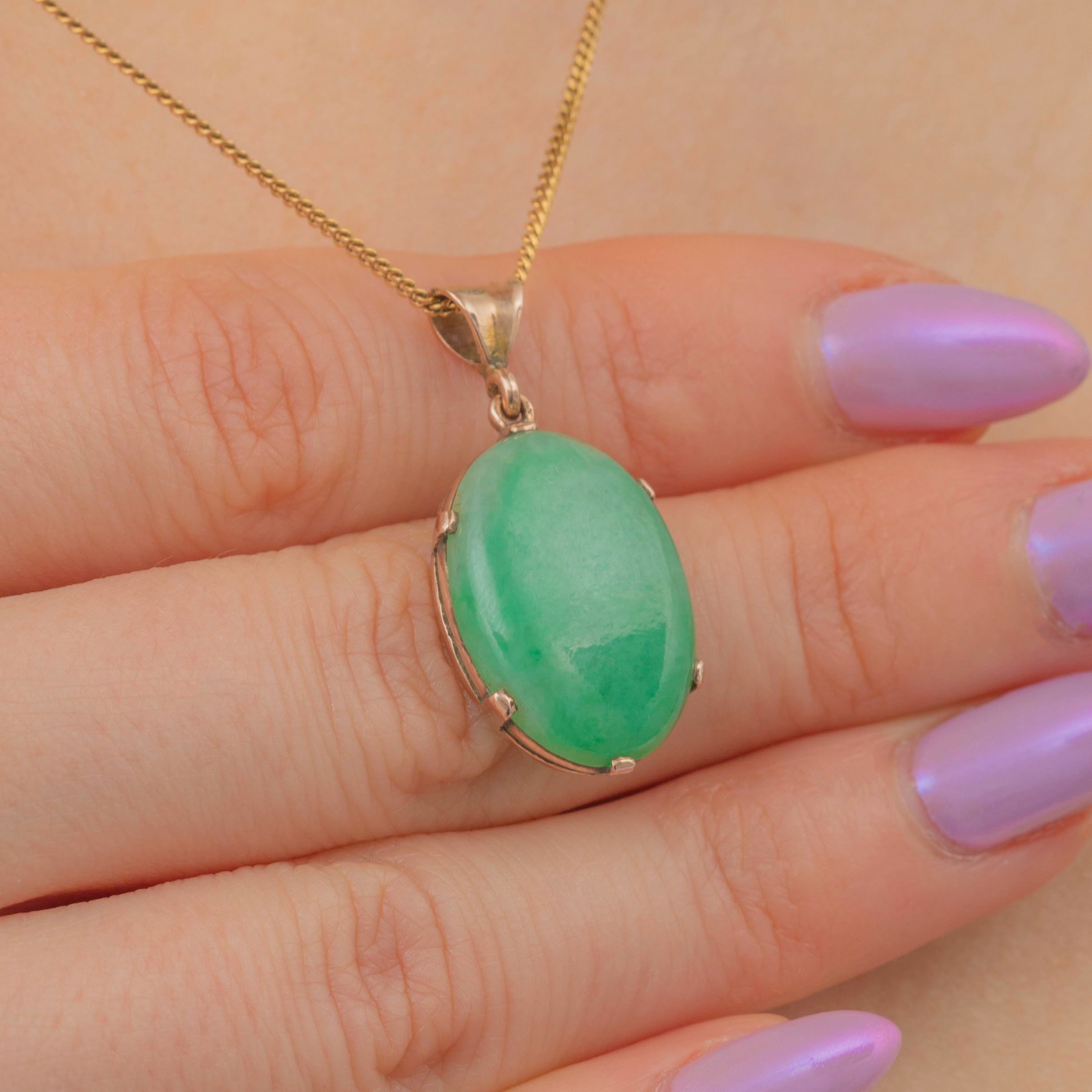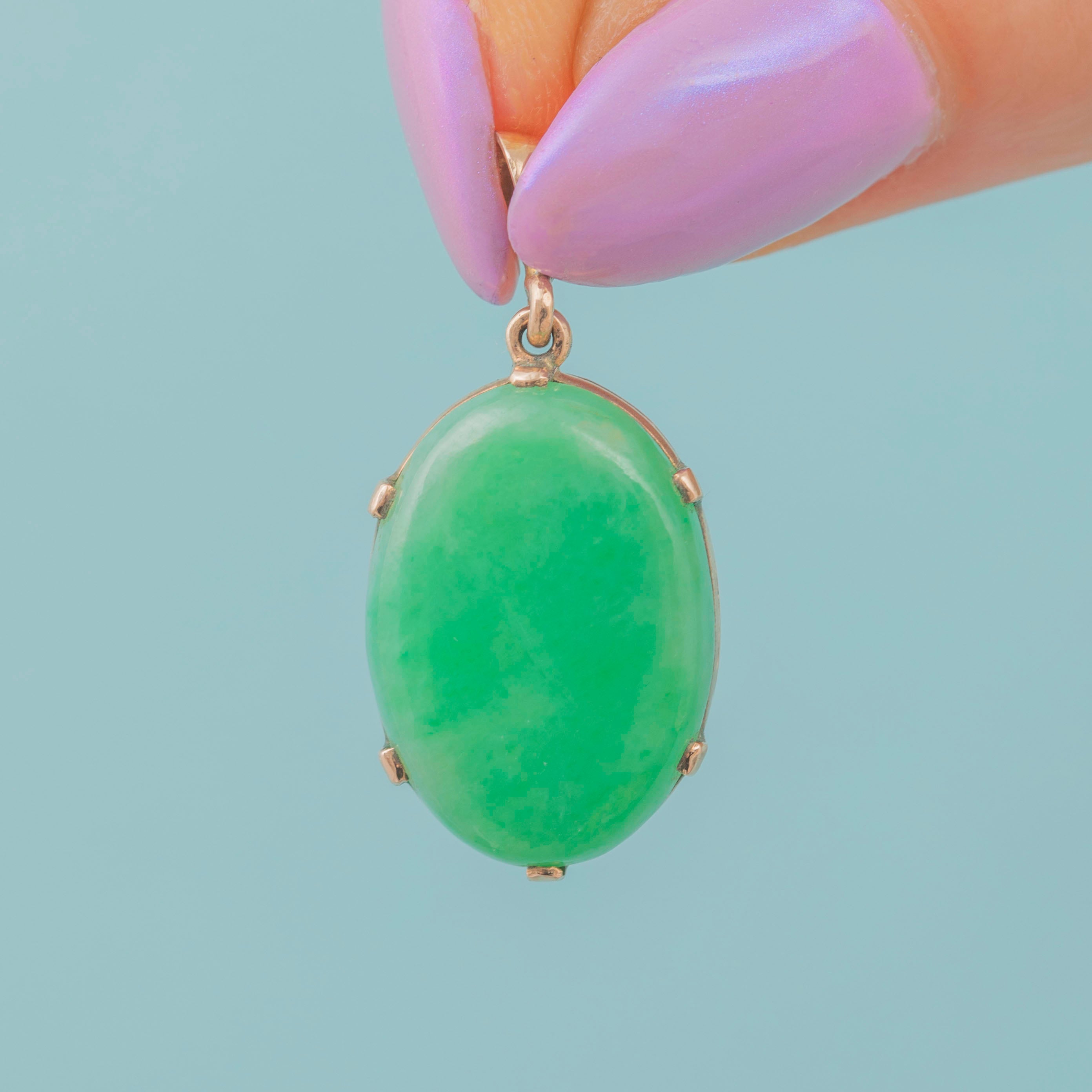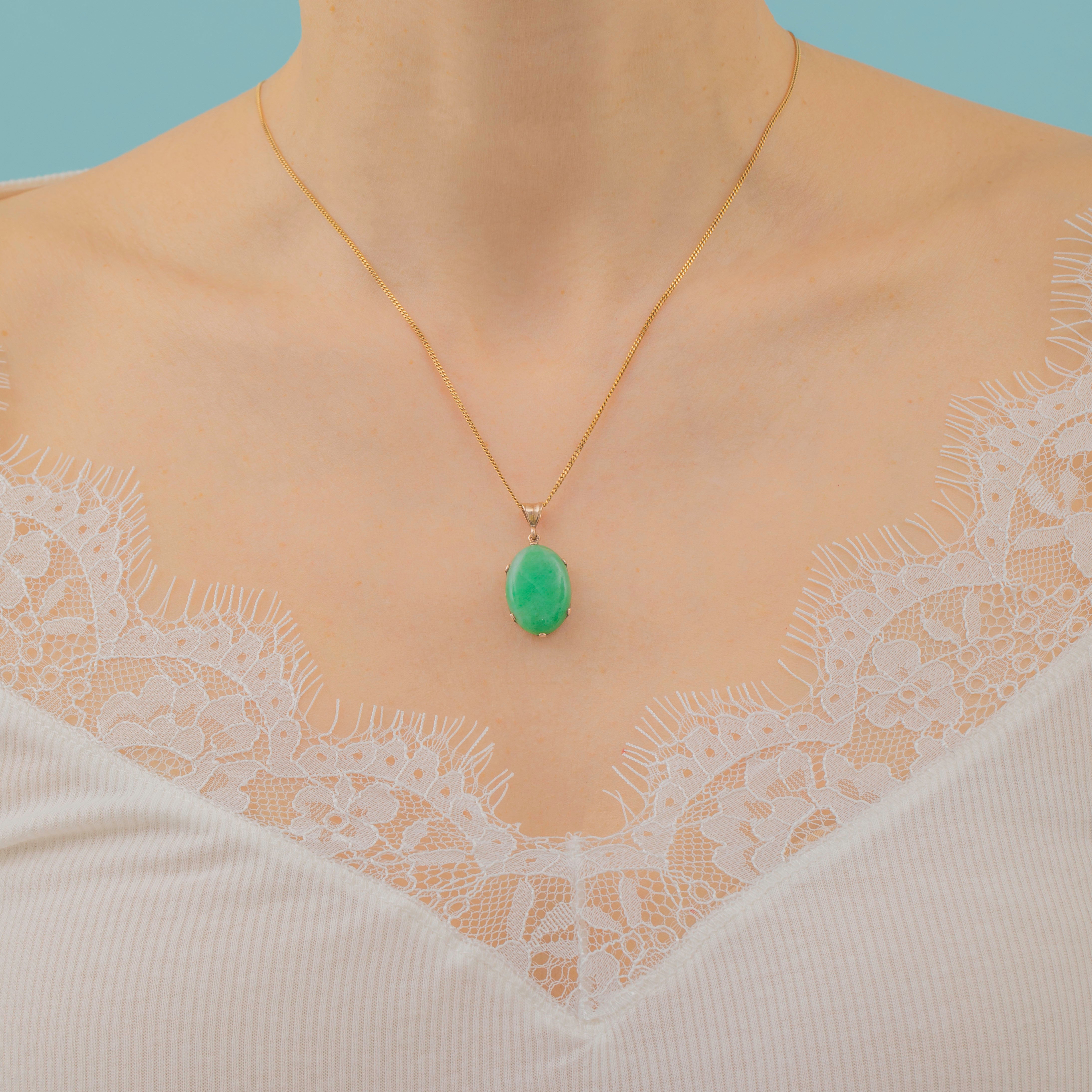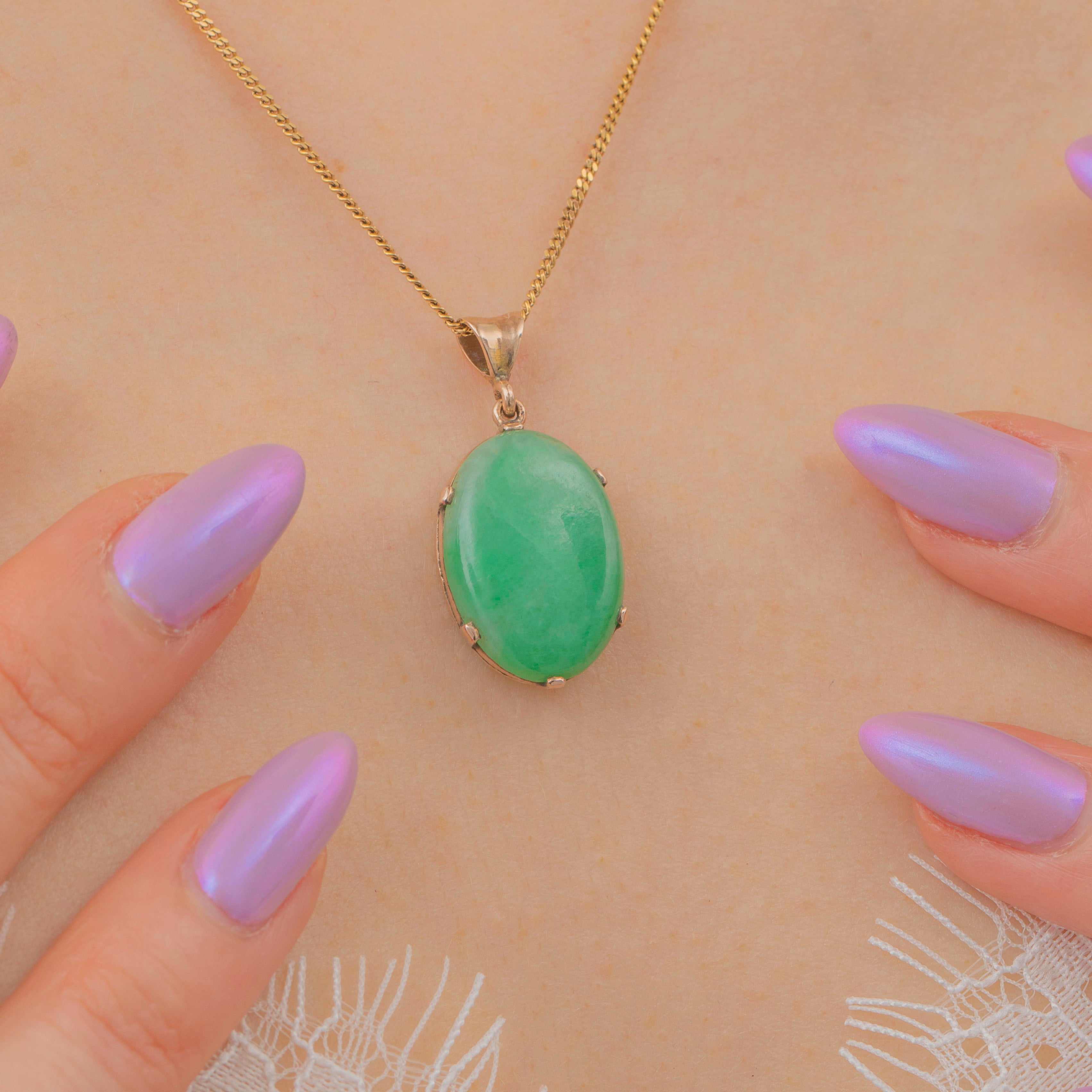 Add a vibrant pop of colour to your décolletage with this Art Deco 9ct Gold Jade cabochon pendant!
