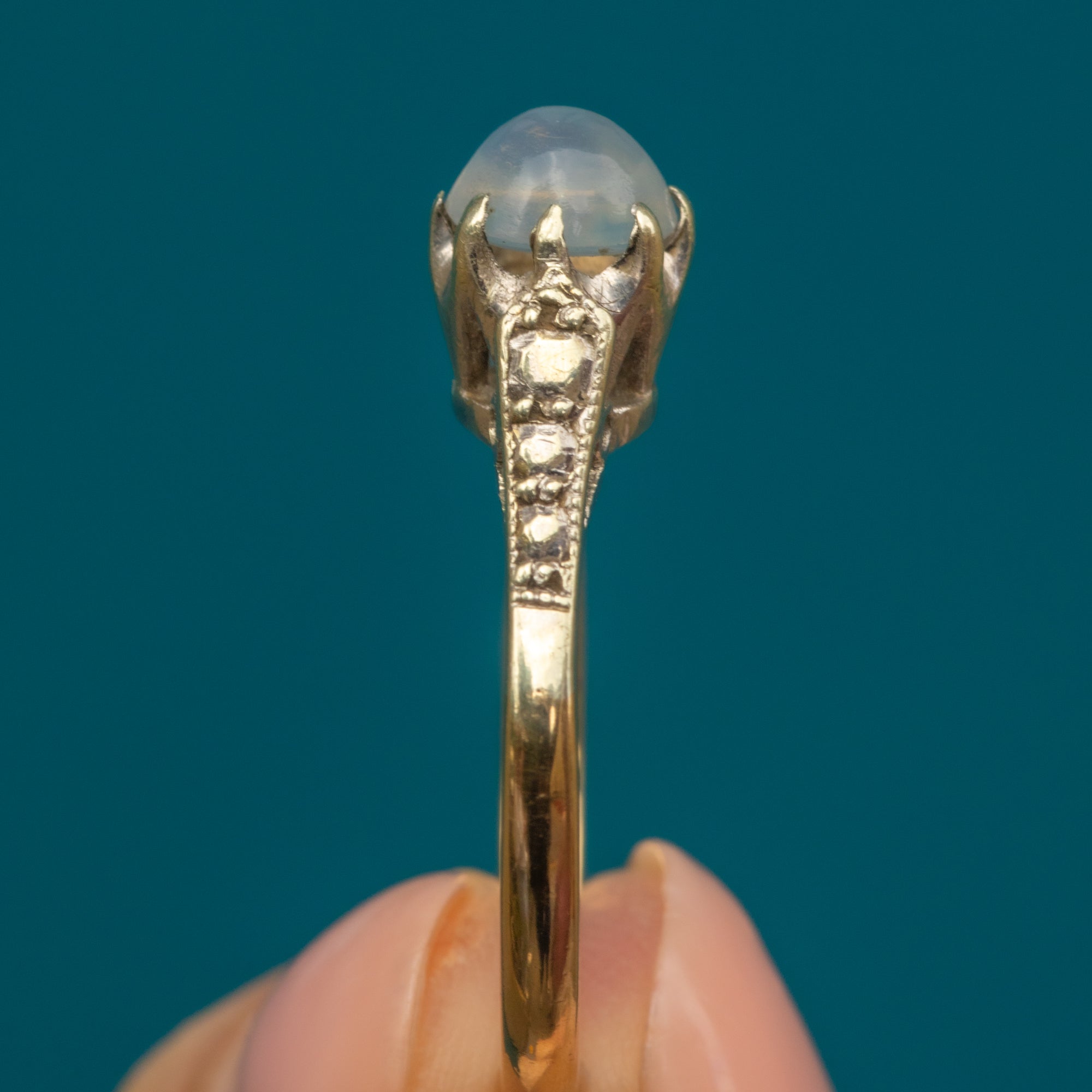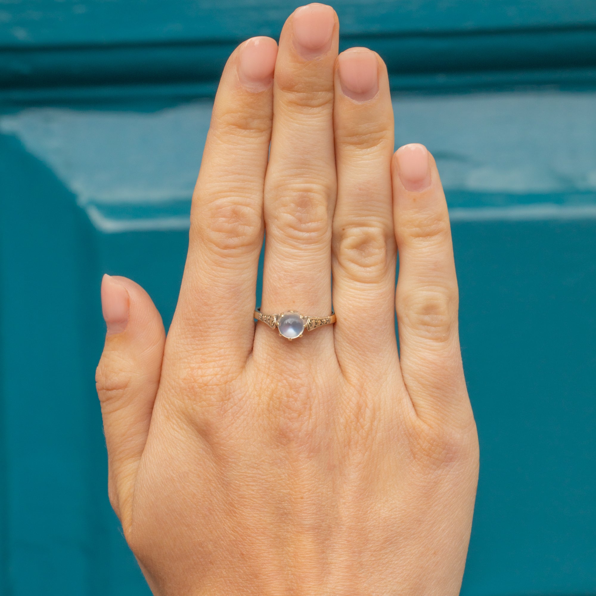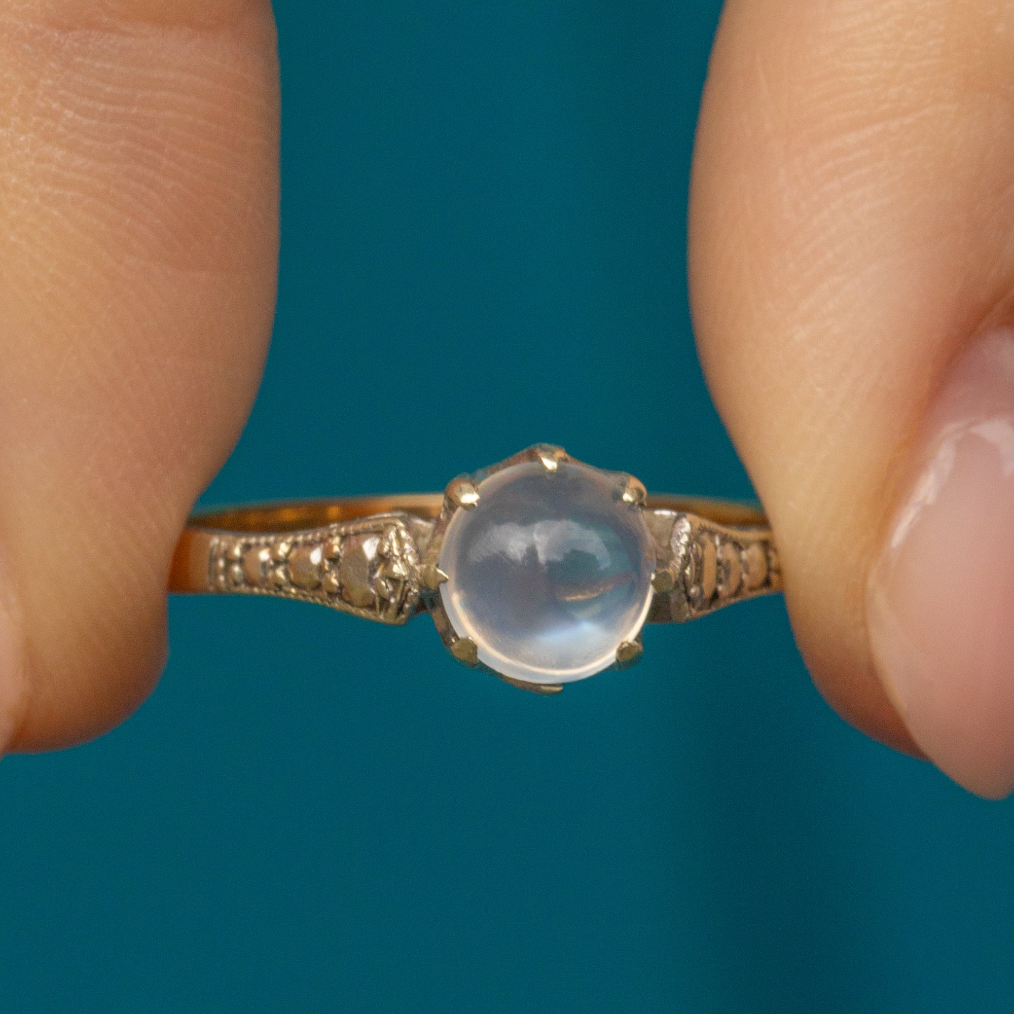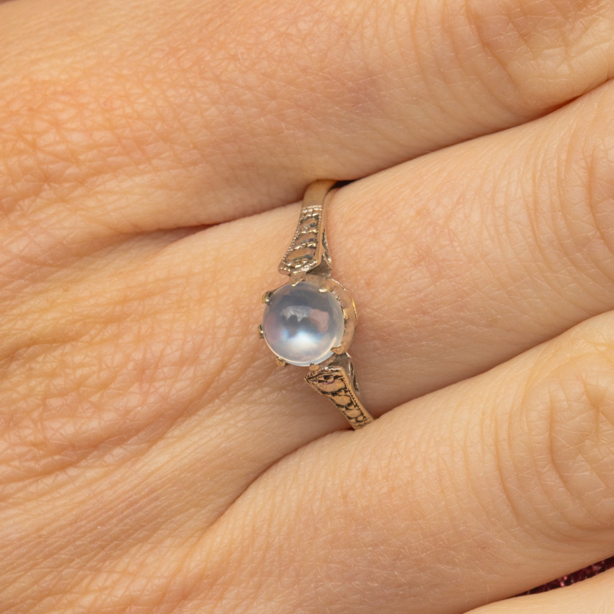 This Art Deco 9ct Gold Moonstone solitaire ring is such a treat! Her plump Moonstone cabochon takes centre stage, nestled within enchanting shoulders akin to illusion set Diamonds.