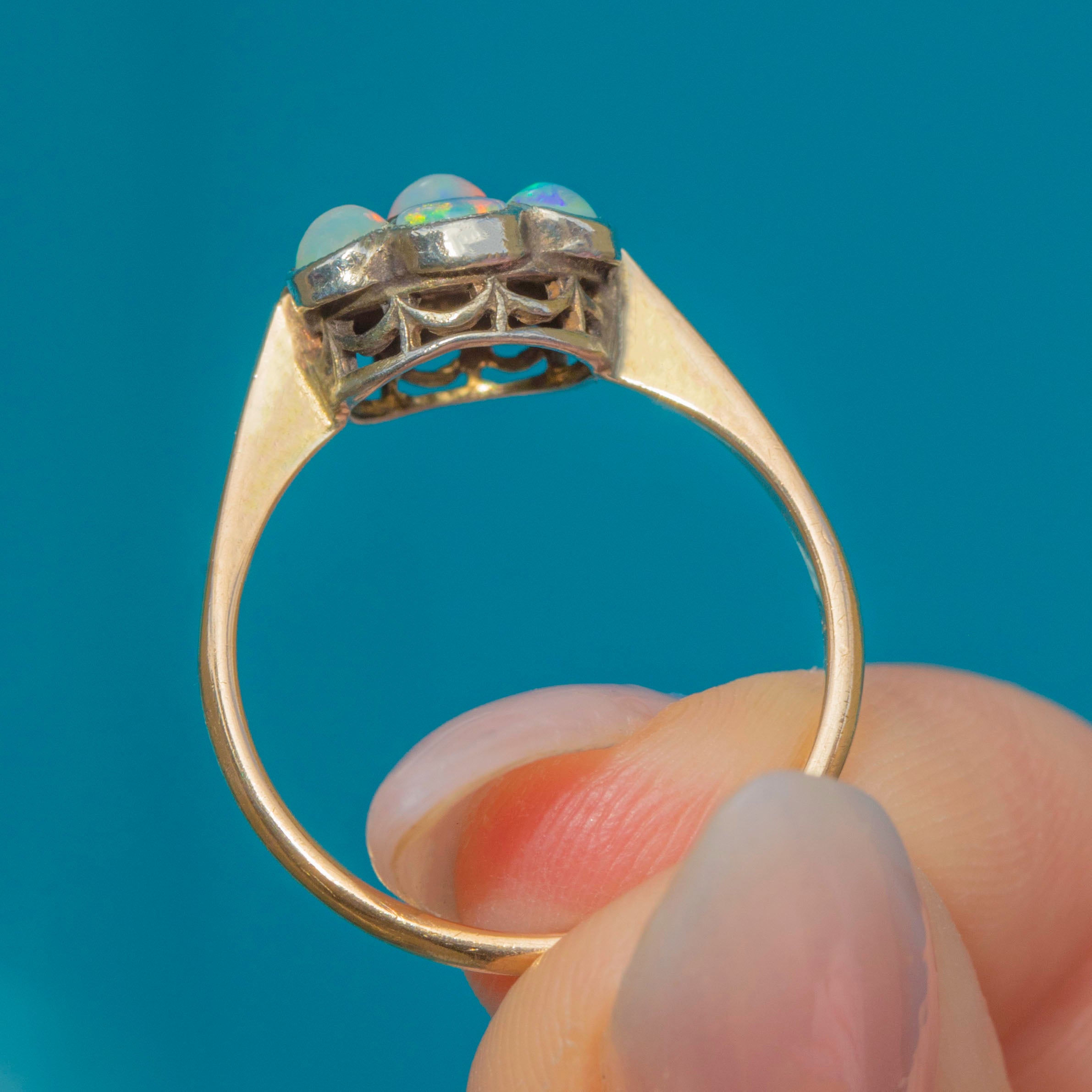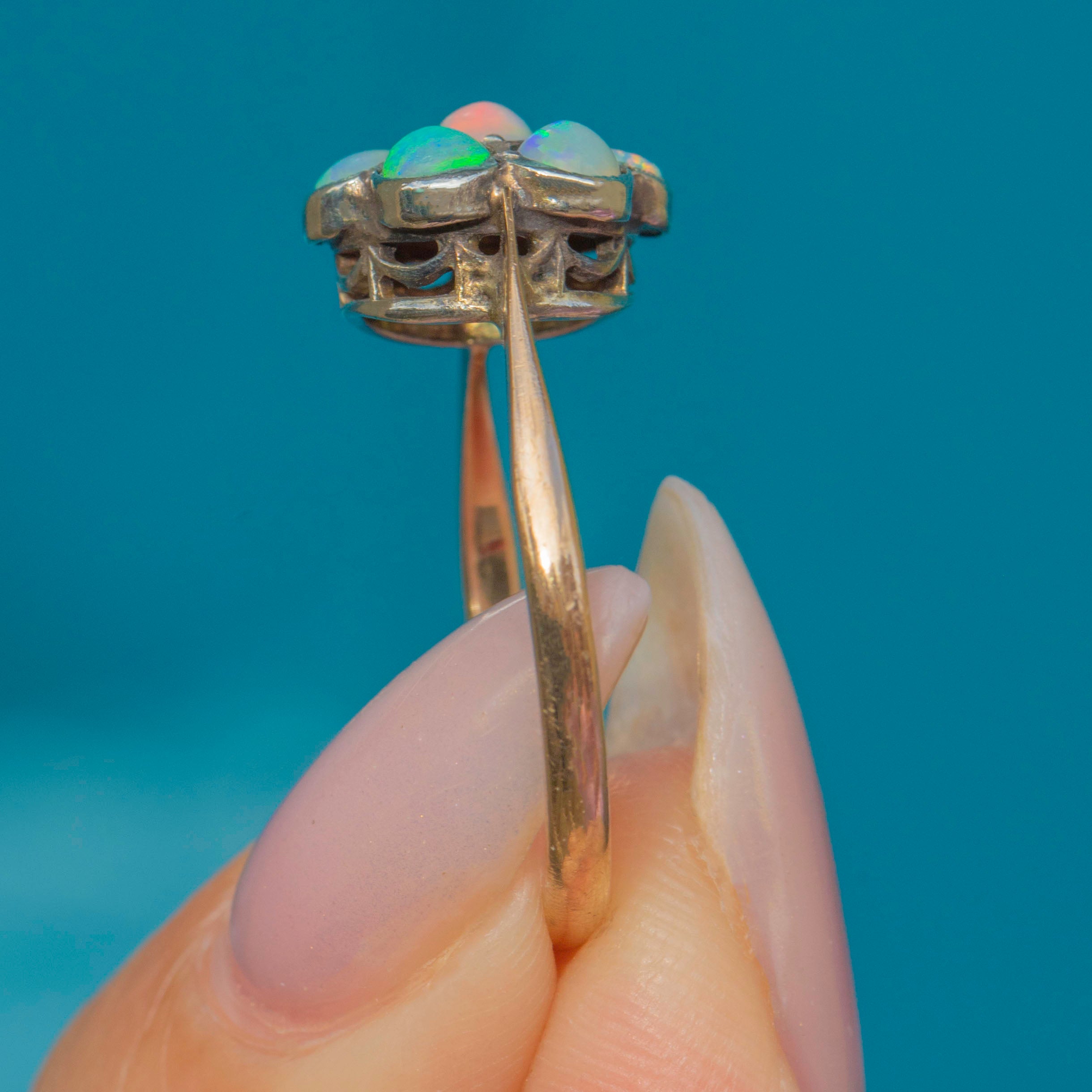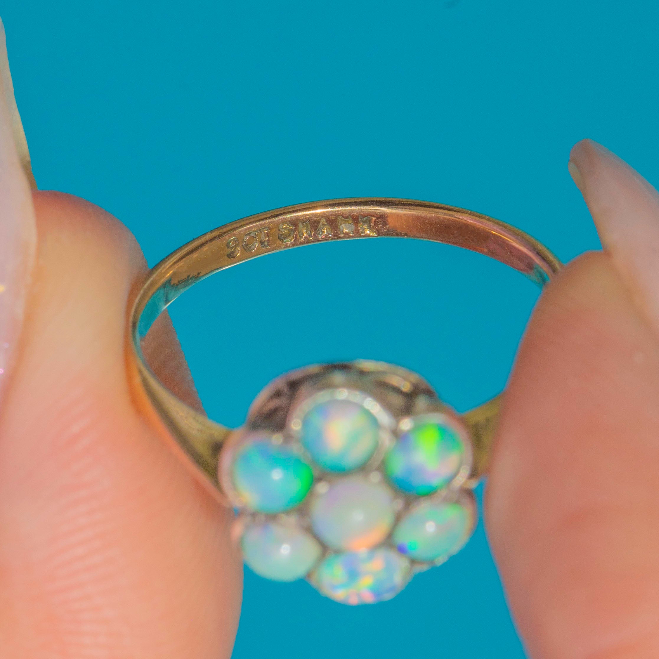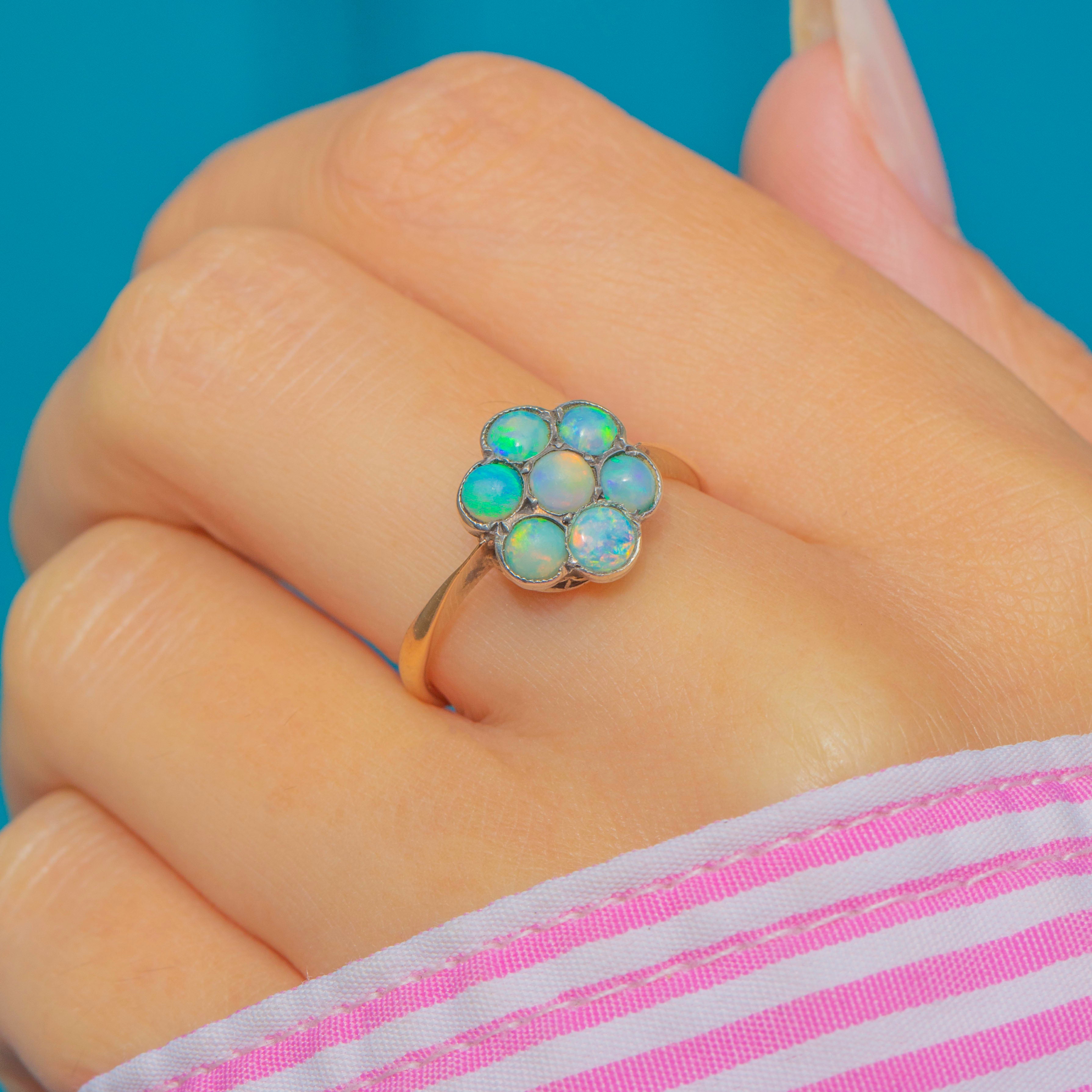 An exquisite Art Deco ring from the 1920s, crafted in 9ct Gold and featuring a cluster of seven dainty natural Opals. Each Opal displays vivid rainbow play-of-colour, arranged in a charming flower cluster.