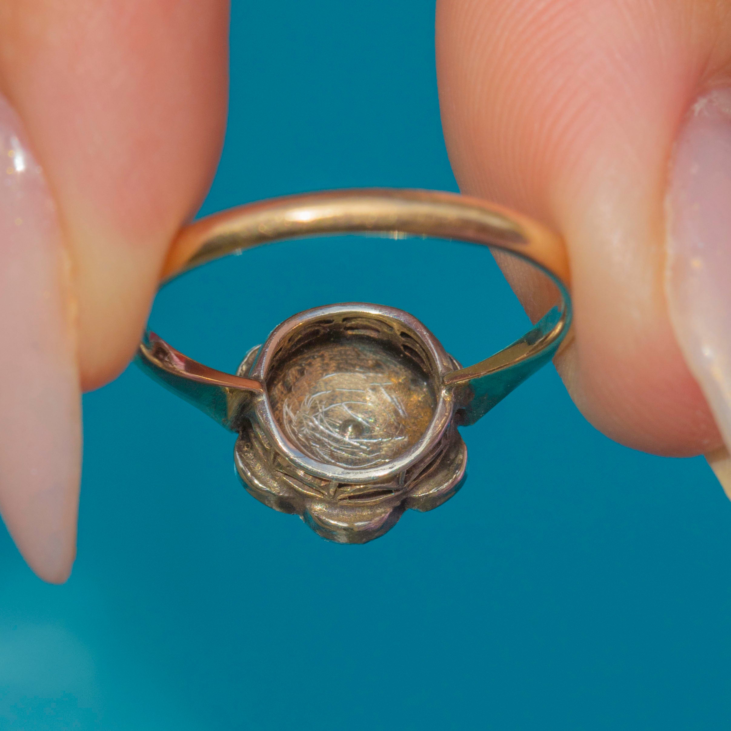 The Silver settings and delicate web-like gallery reflect the period’s elegant craftsmanship, adding depth and detail to this timeless design. This ring is both graceful and comfortable to wear.
