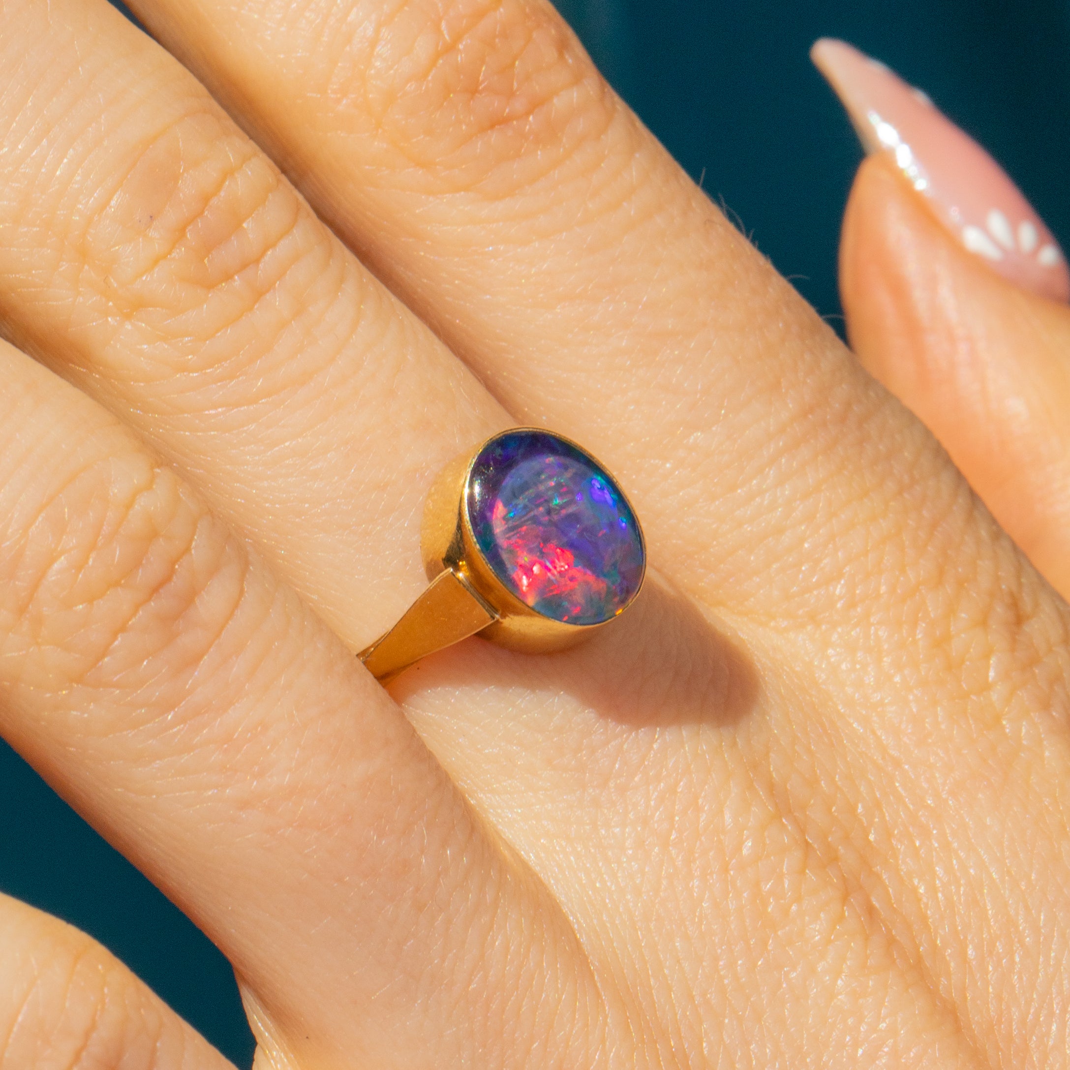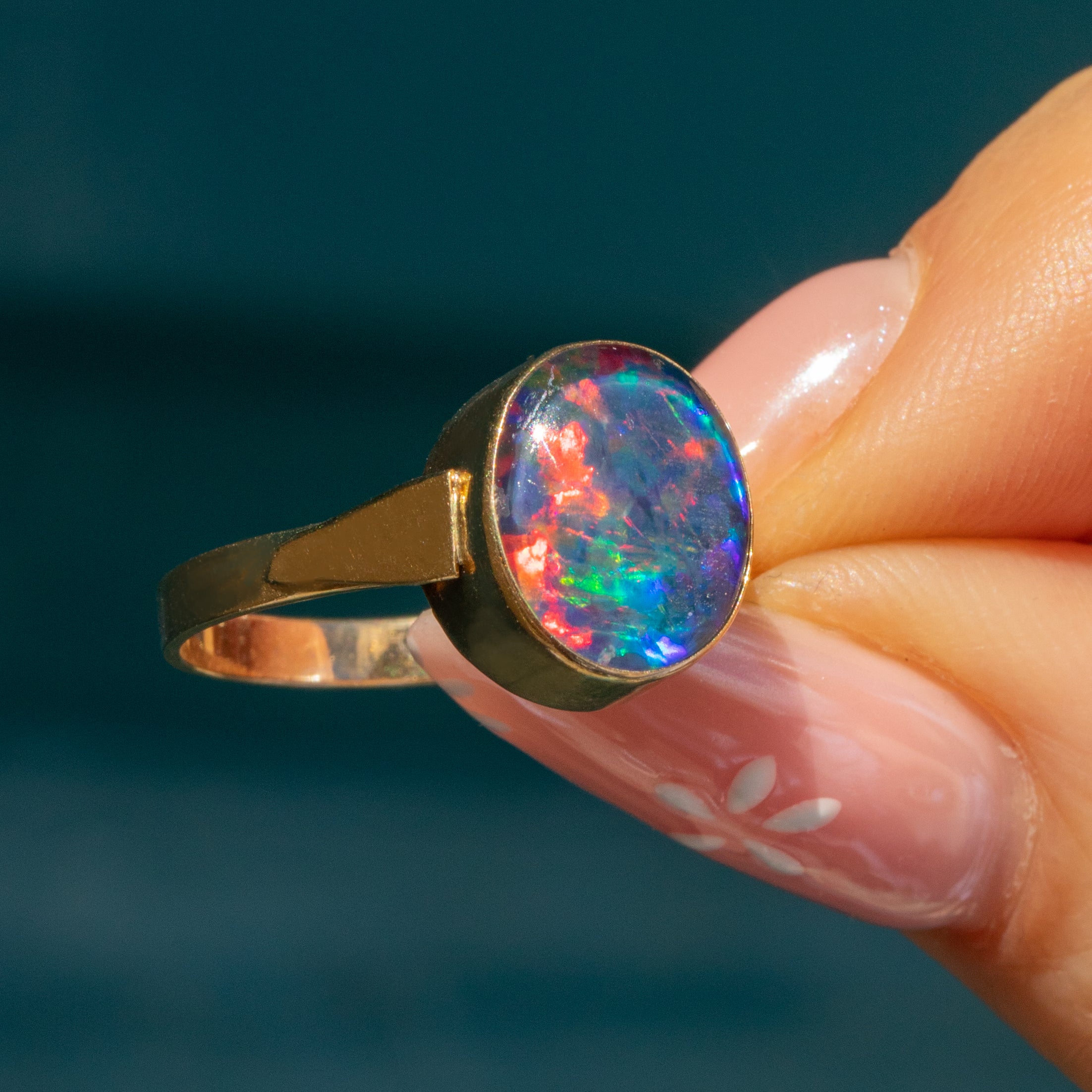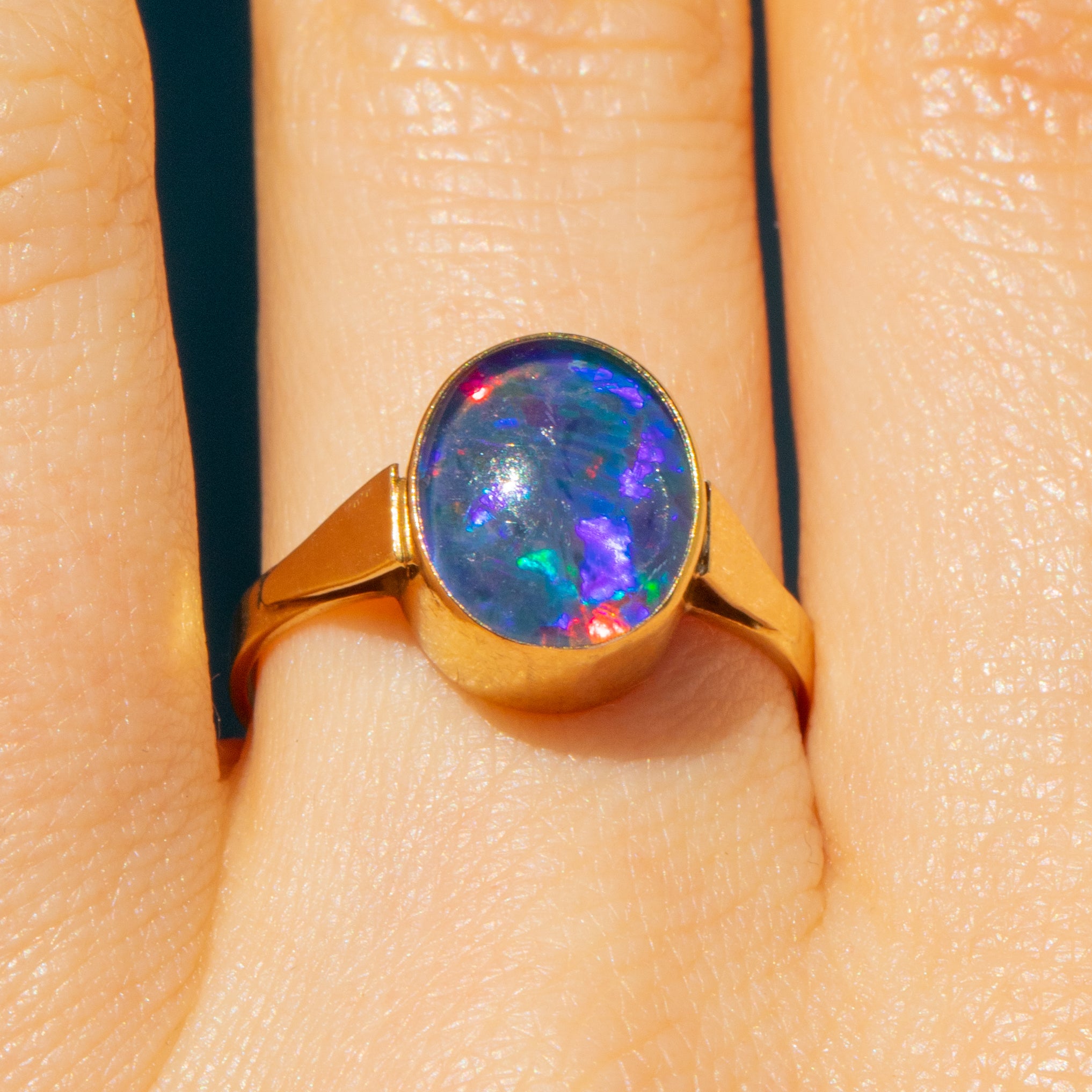 This Art Deco 9ct Gold Opal triplet ring is a wonderful find! Made from solid 9ct Gold, this Opal triplet ring draws you in with midnight blues, flashes of fuchsia and touches of chartreuse.
