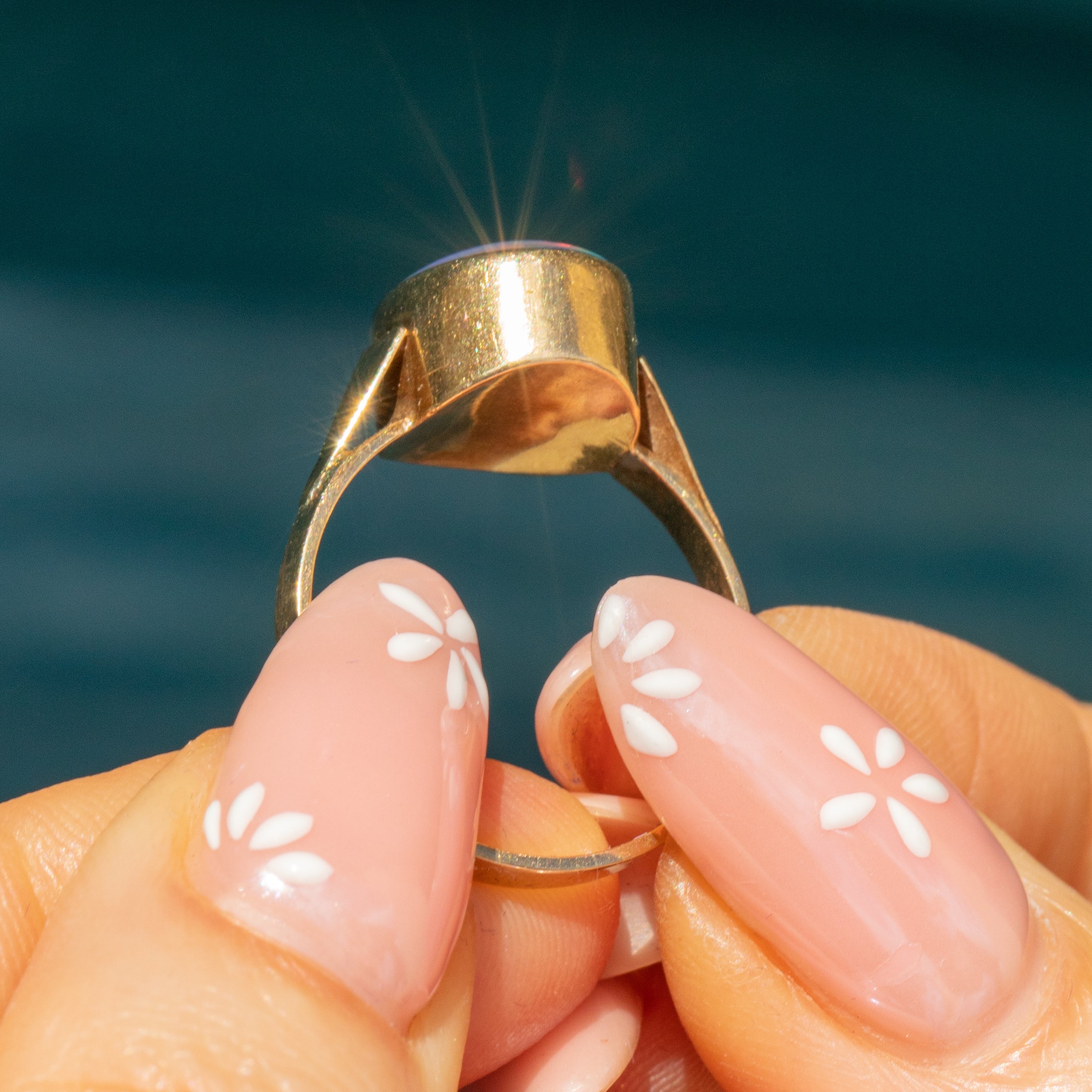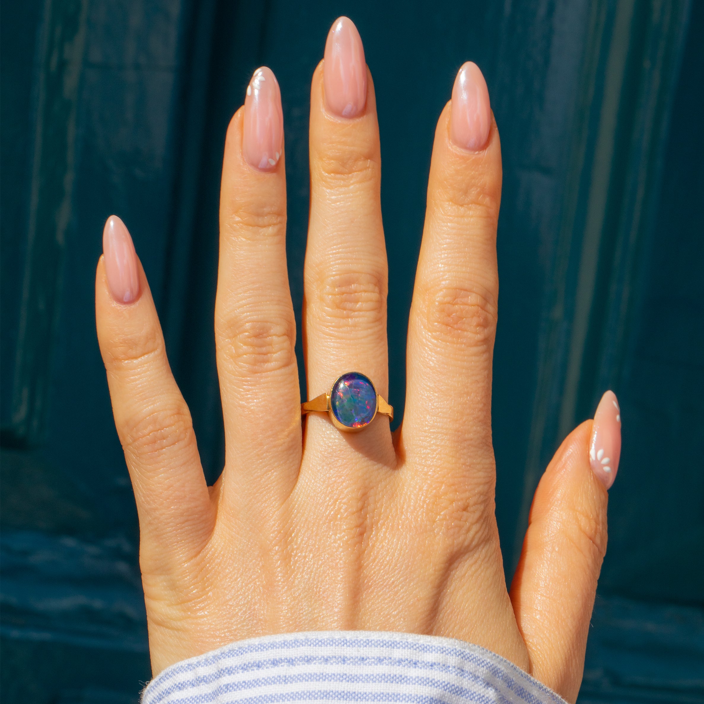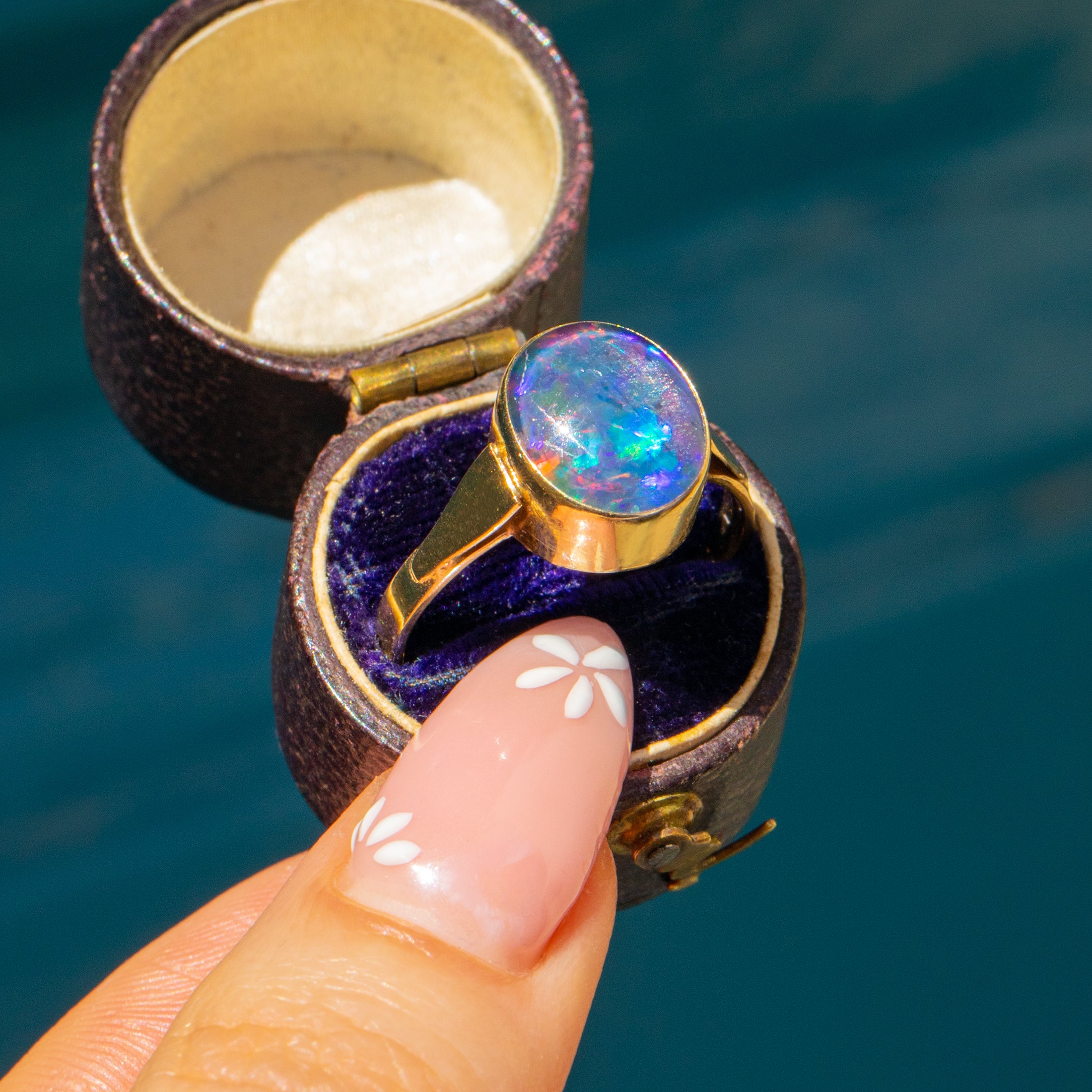 This Art Deco 9ct Gold Opal triplet ring is a wonderful find! Made from solid 9ct Gold, this Opal triplet ring draws you in with midnight blues, flashes of fuchsia and touches of chartreuse.