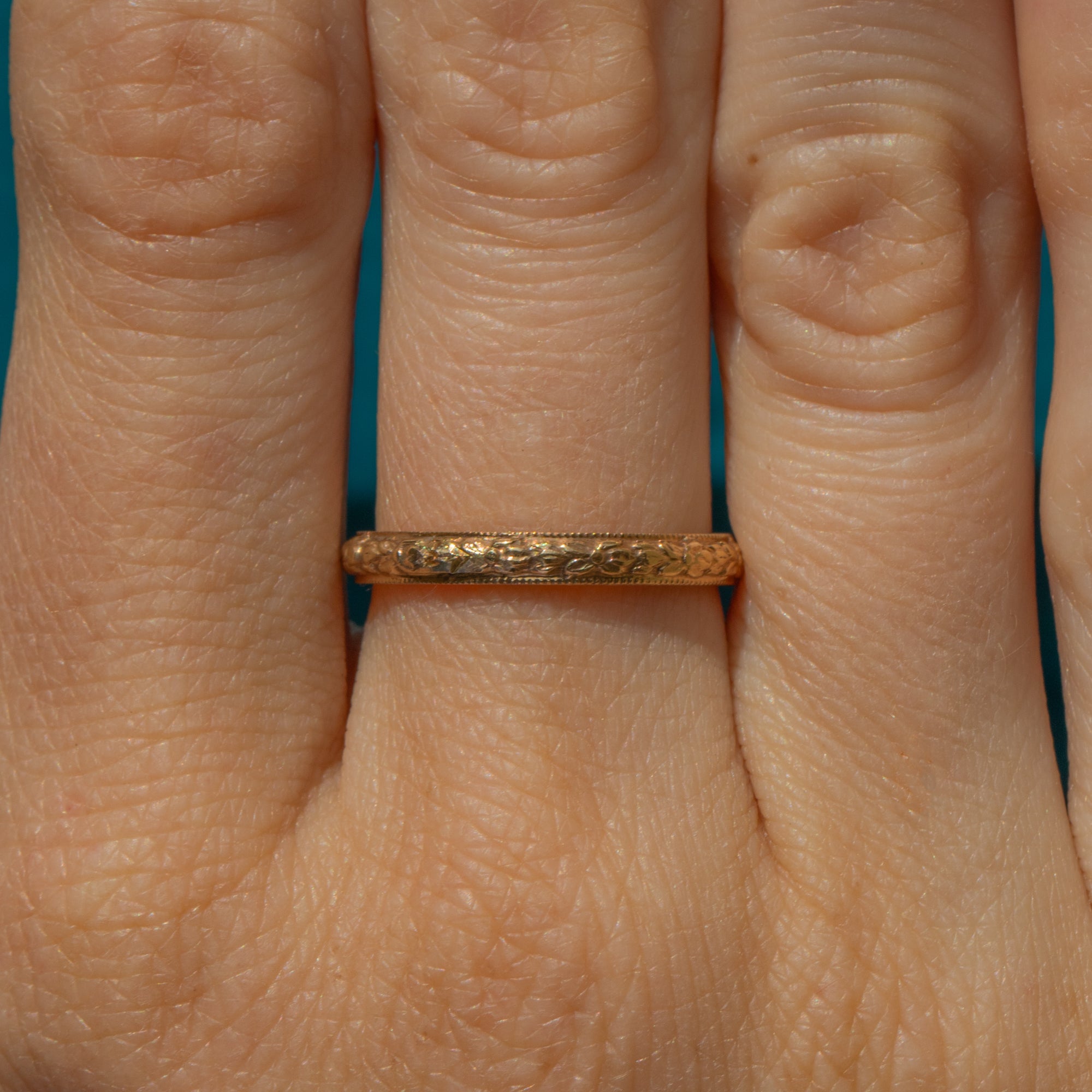 Whether you're looking the perfect ring for your upcoming nuptials or to add a decadent slice of Gold to your curated ring stack, this Art Deco 9ct Gold orange blossom engraved wedding band has got you covered!