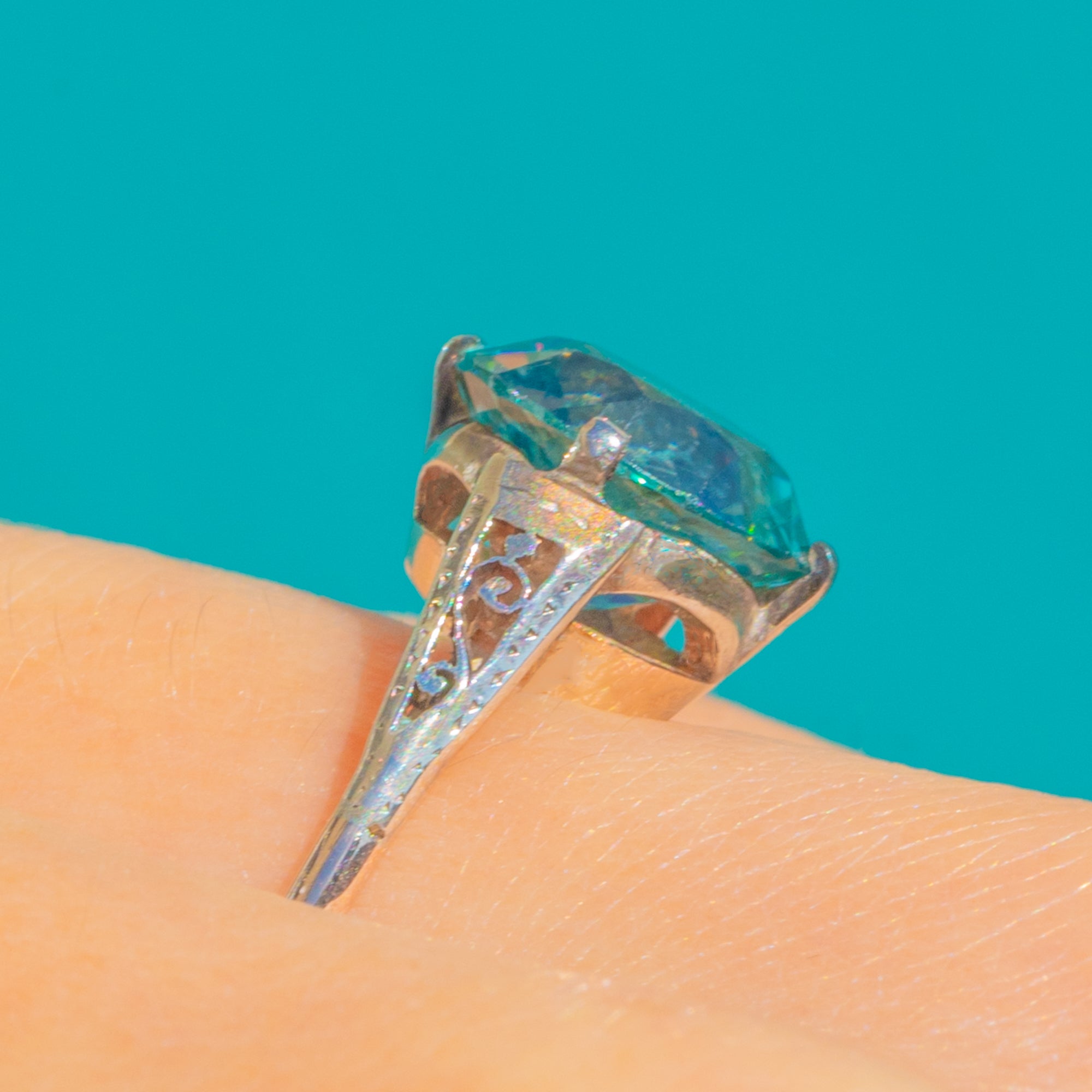 A luminous Art Deco solitaire, this ring showcases a vivid Starlite Blue Zircon in an elegant four-claw setting. The cool Silver mount is crafted with an elevated open gallery and delicate pierced scrollwork along the shoulders, all flowing into a tapered 9ct Gold band for a refined two-tone finish.