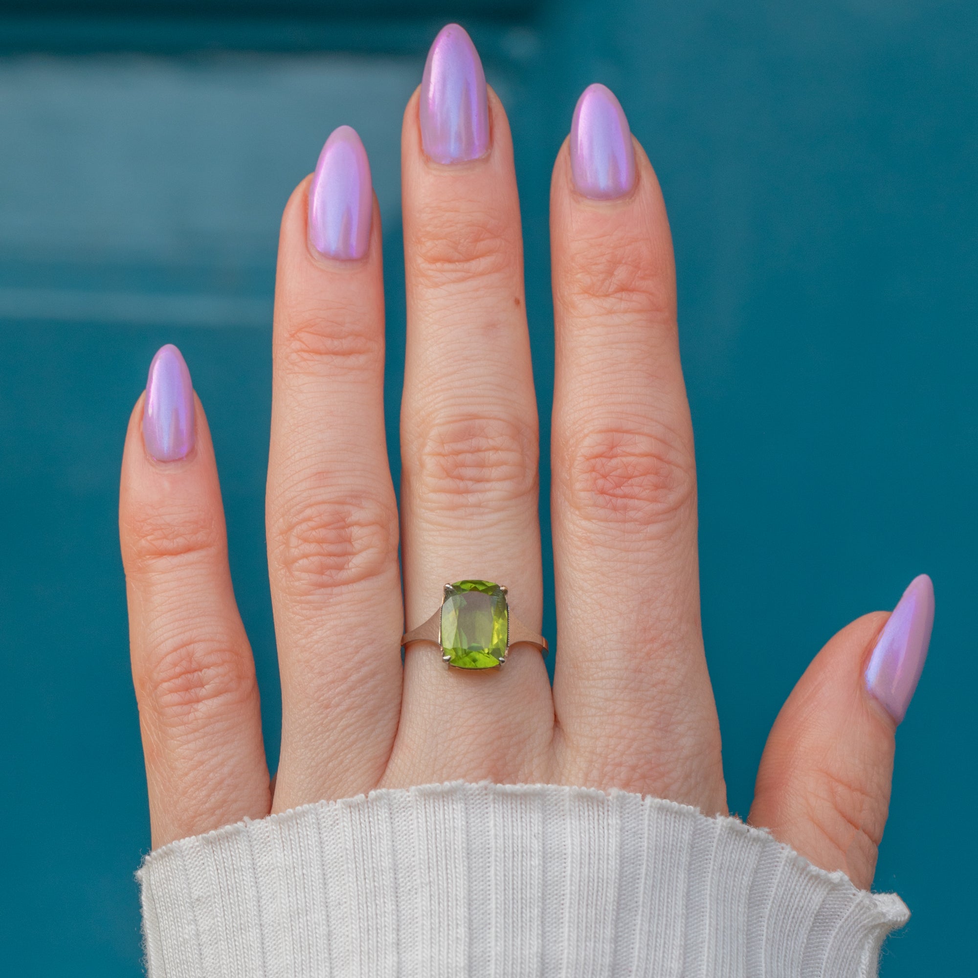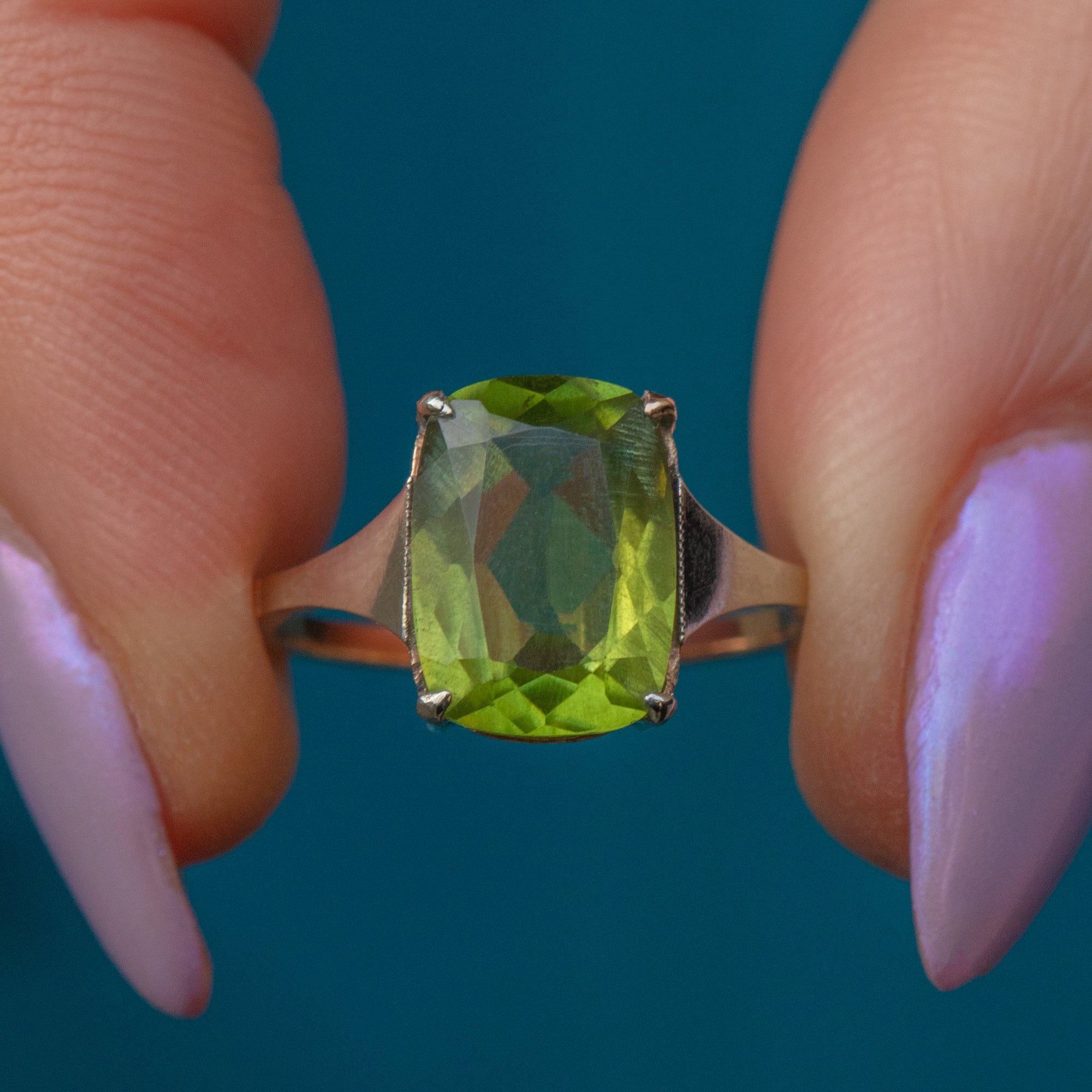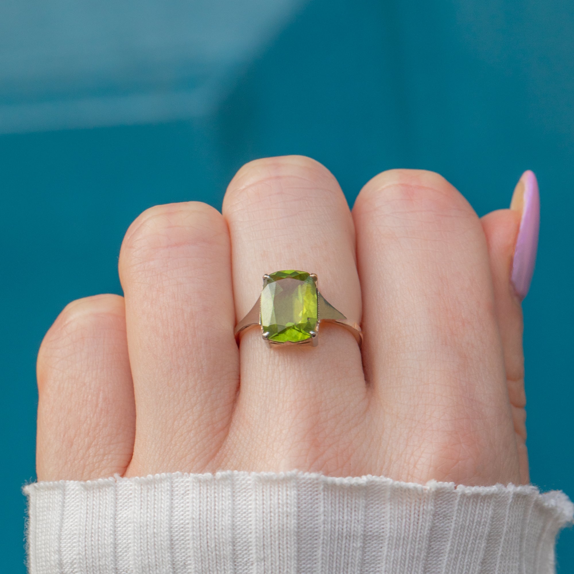 Boasting a 5.45ct Peridot, this ring is steeped in antique charm. Her rectangular Peridot is faceted wonderfully in quintessential Art Deco style, radiating striking verdant hues. The Peridot is set securely within 9ct Gold claw settings, their hues effortlessly complementing one another to create an elegant colour palette.