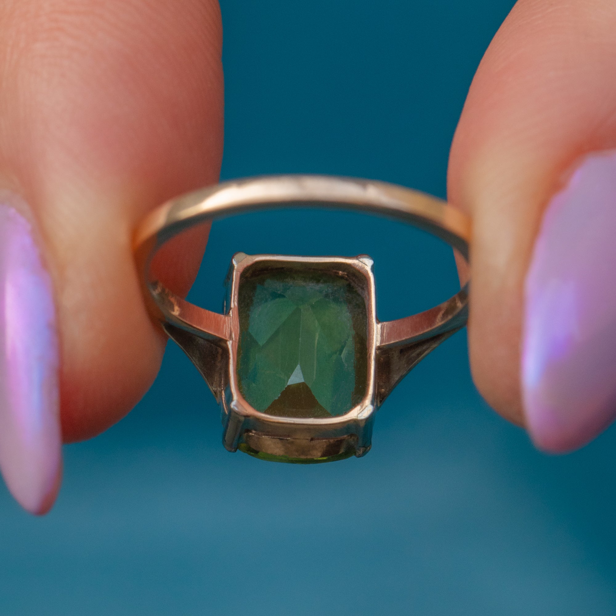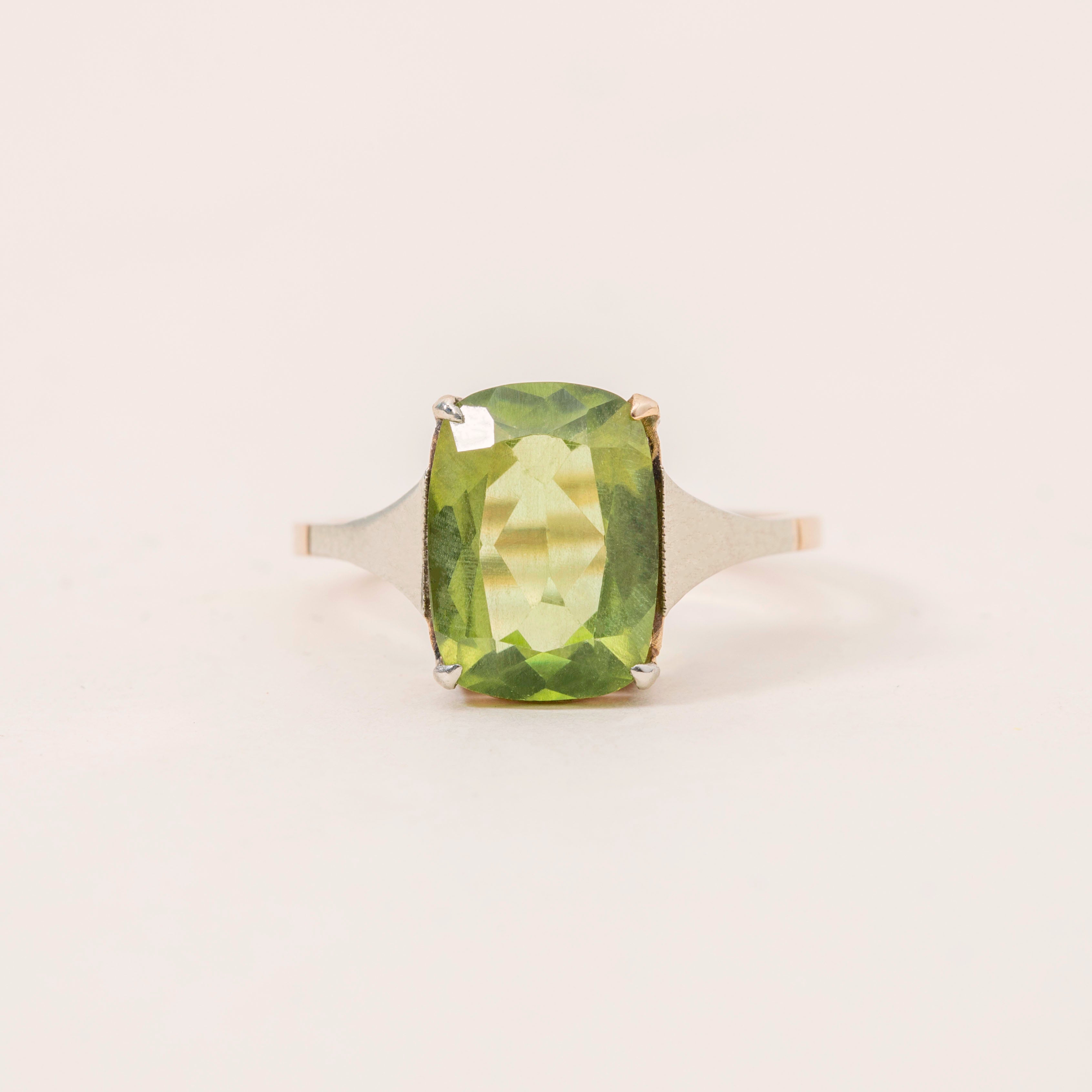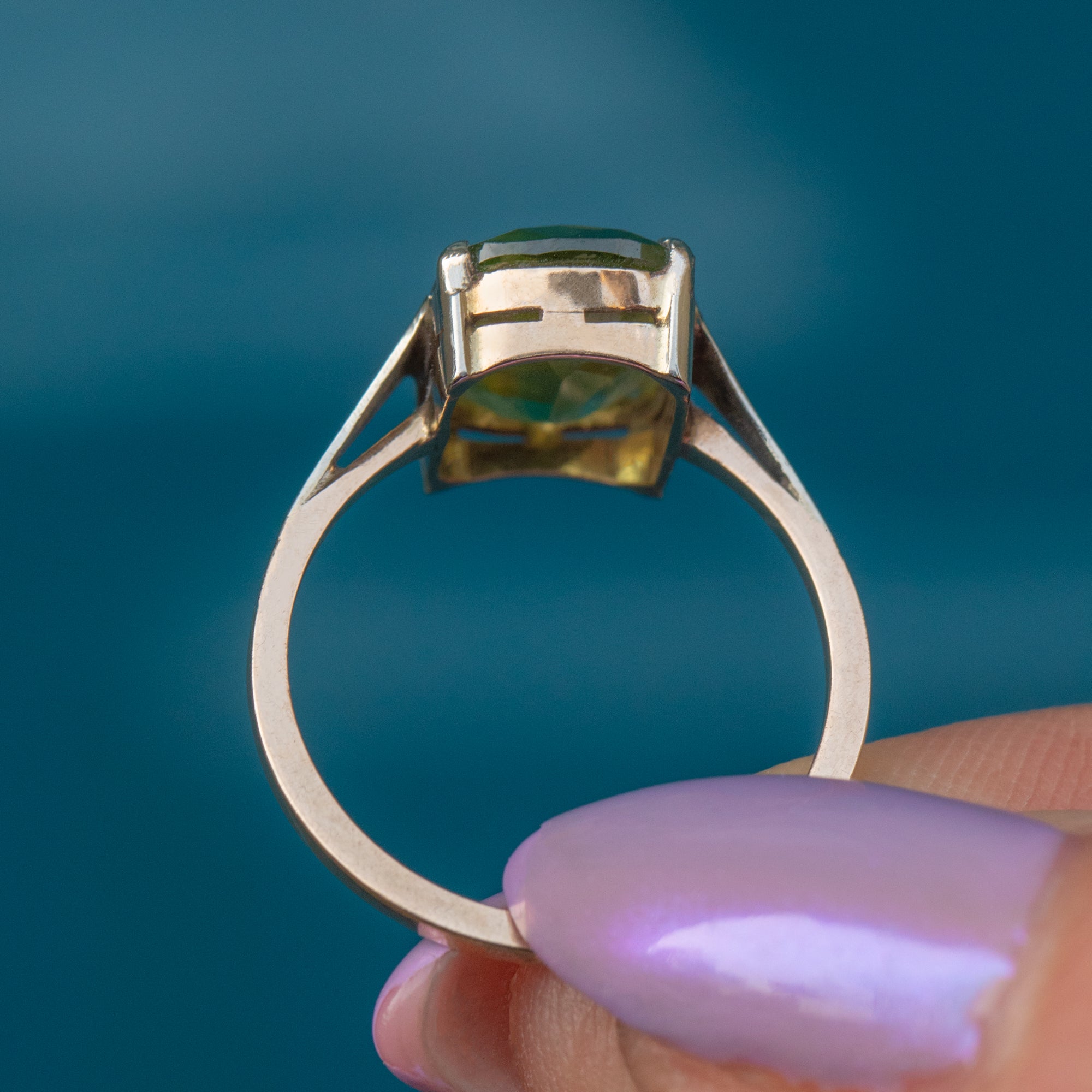 Boasting a 5.45ct Peridot, this ring is steeped in antique charm. Her rectangular Peridot is faceted wonderfully in quintessential Art Deco style, radiating striking verdant hues. The Peridot is set securely within 9ct Gold claw settings, their hues effortlessly complementing one another to create an elegant colour palette.