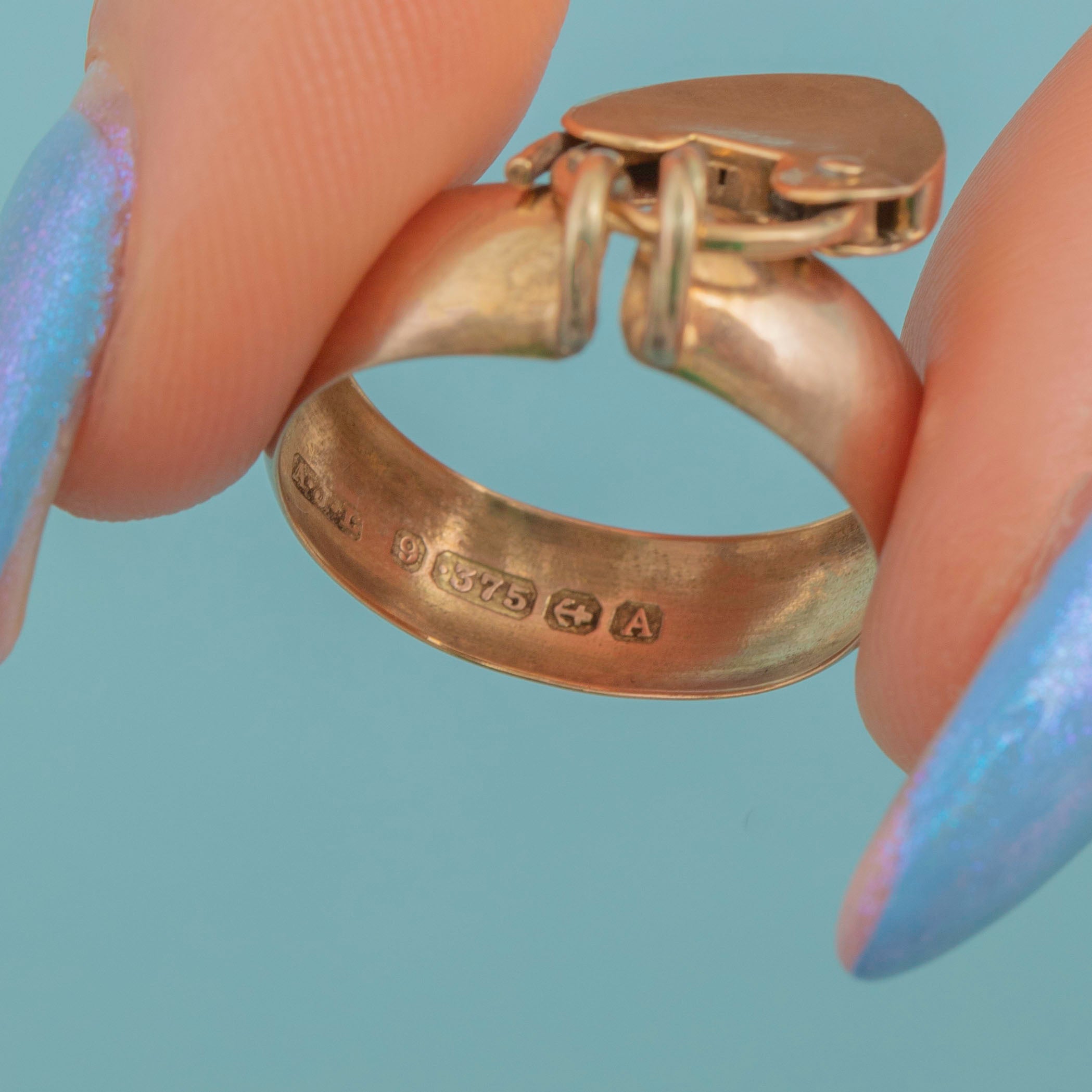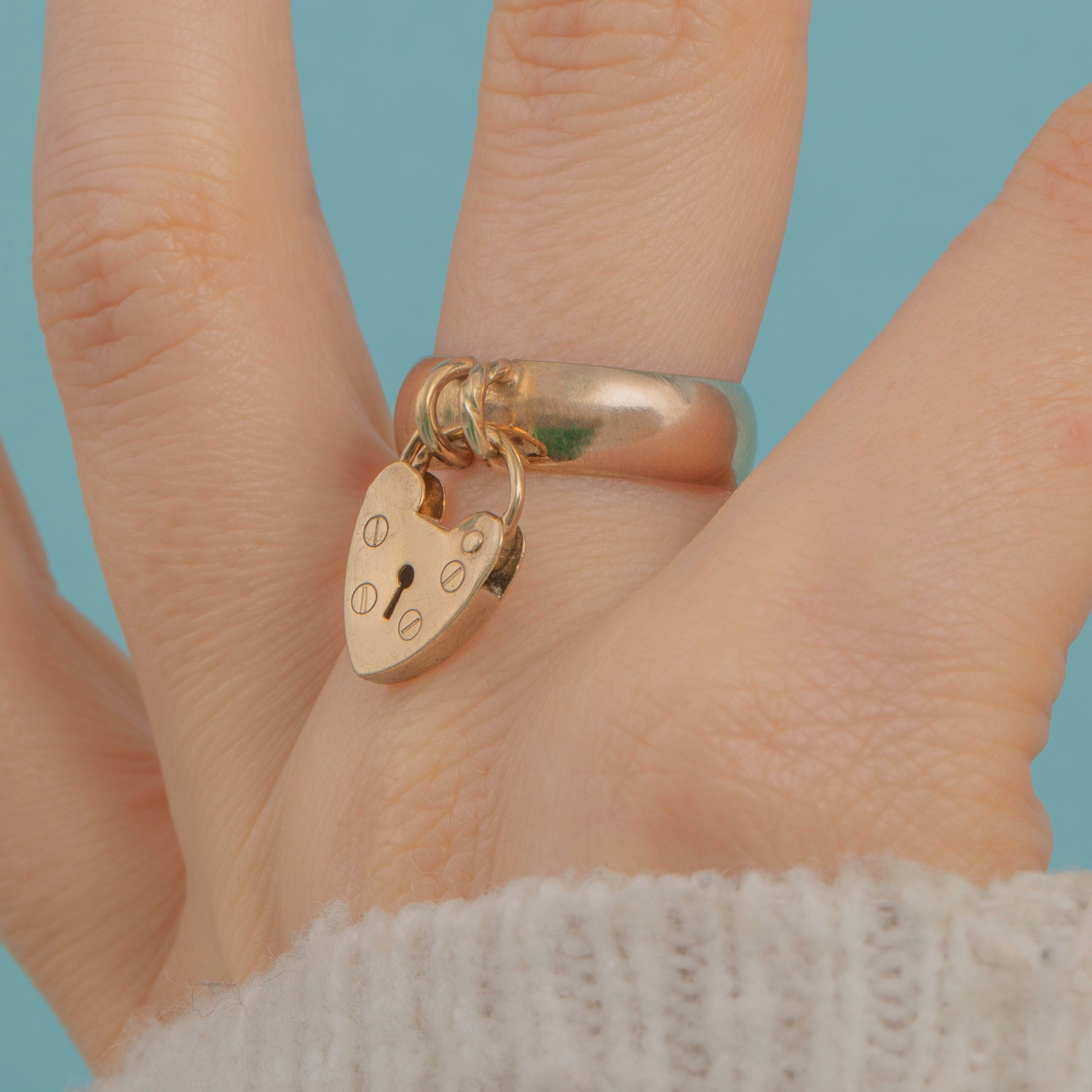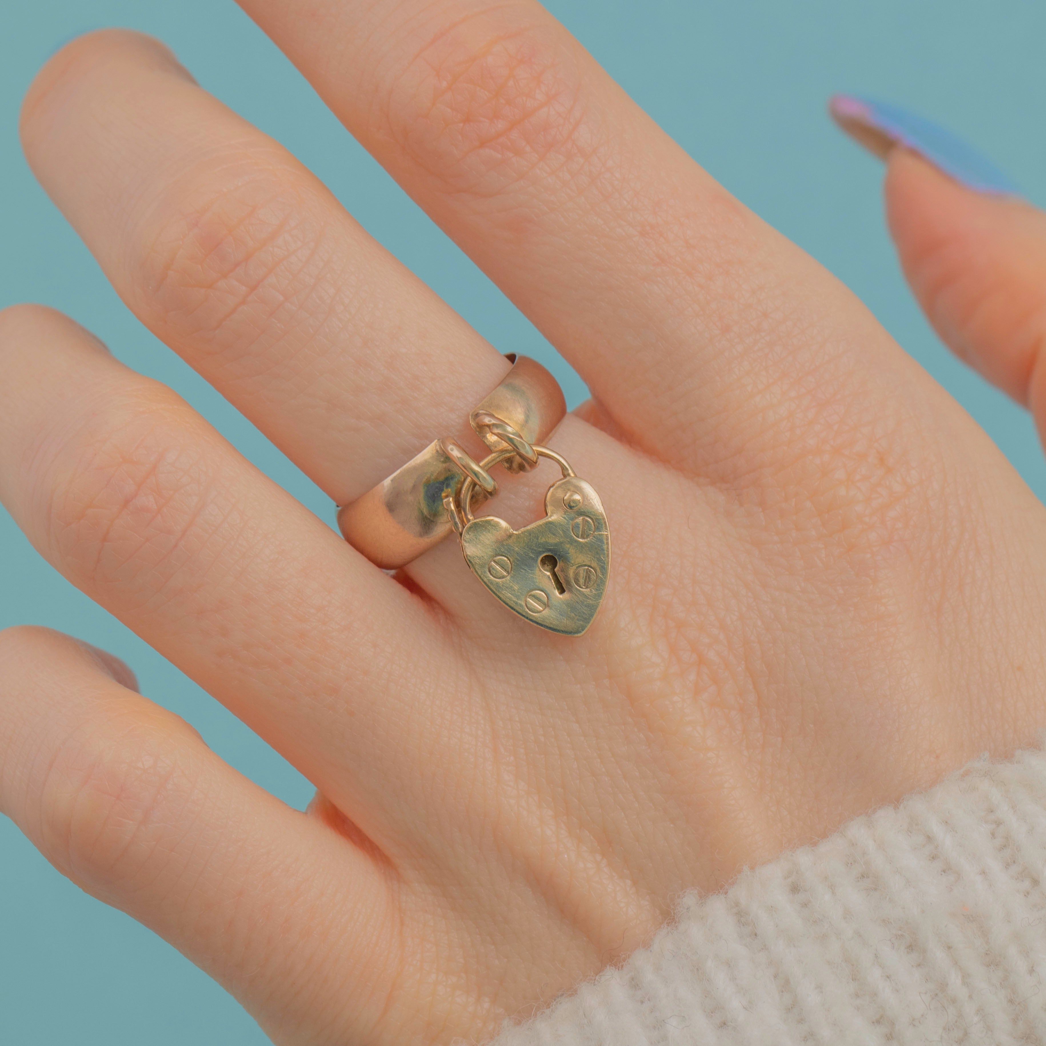 This adorable Art Deco 9ct Gold engraved ring, complete with a heart padlock charm, is a timeless statement piece! Meticulously crafted from buttery 9ct Gold, this ring features a charming heart padlock suspended from her chunky curvaceous band, which is fully hallmarked to