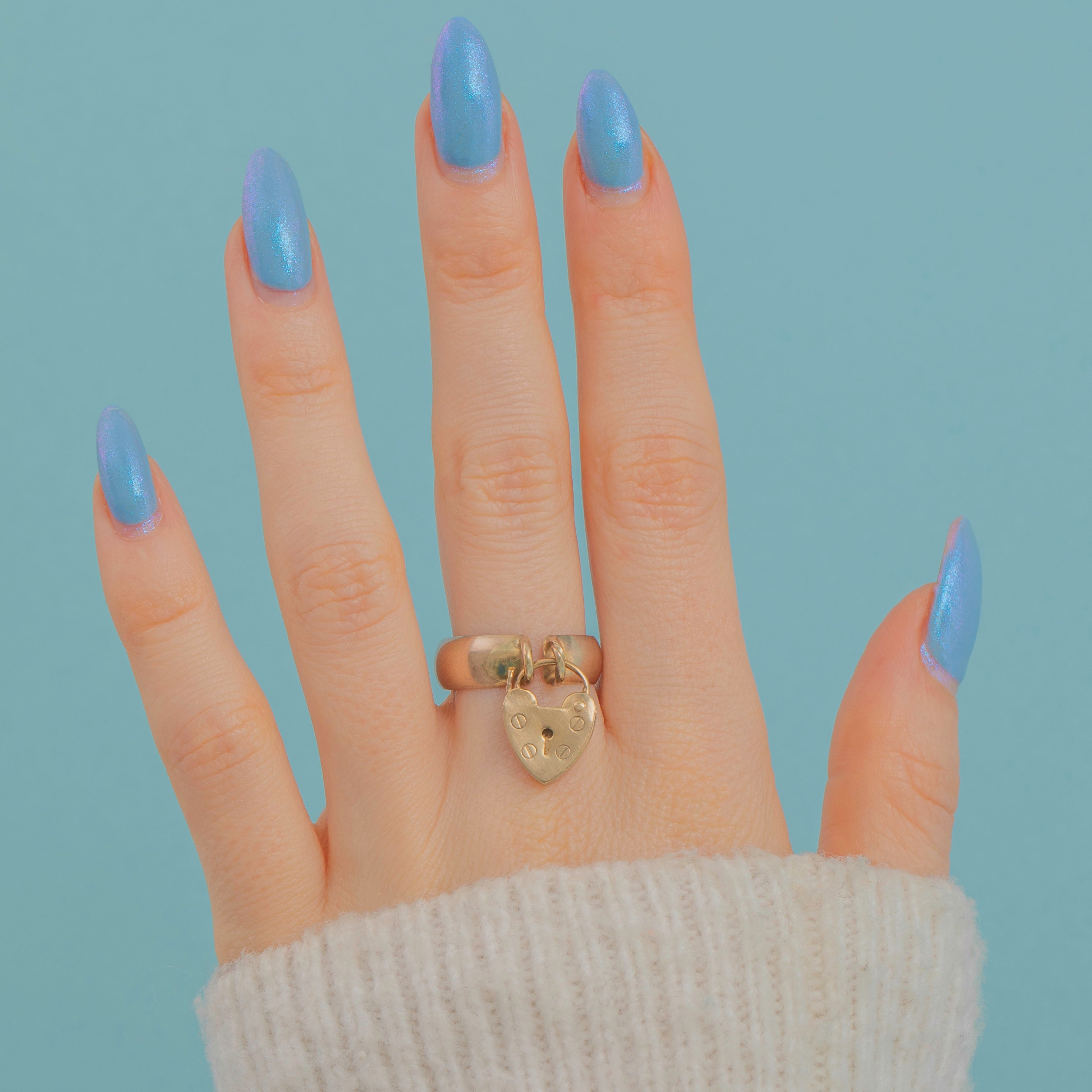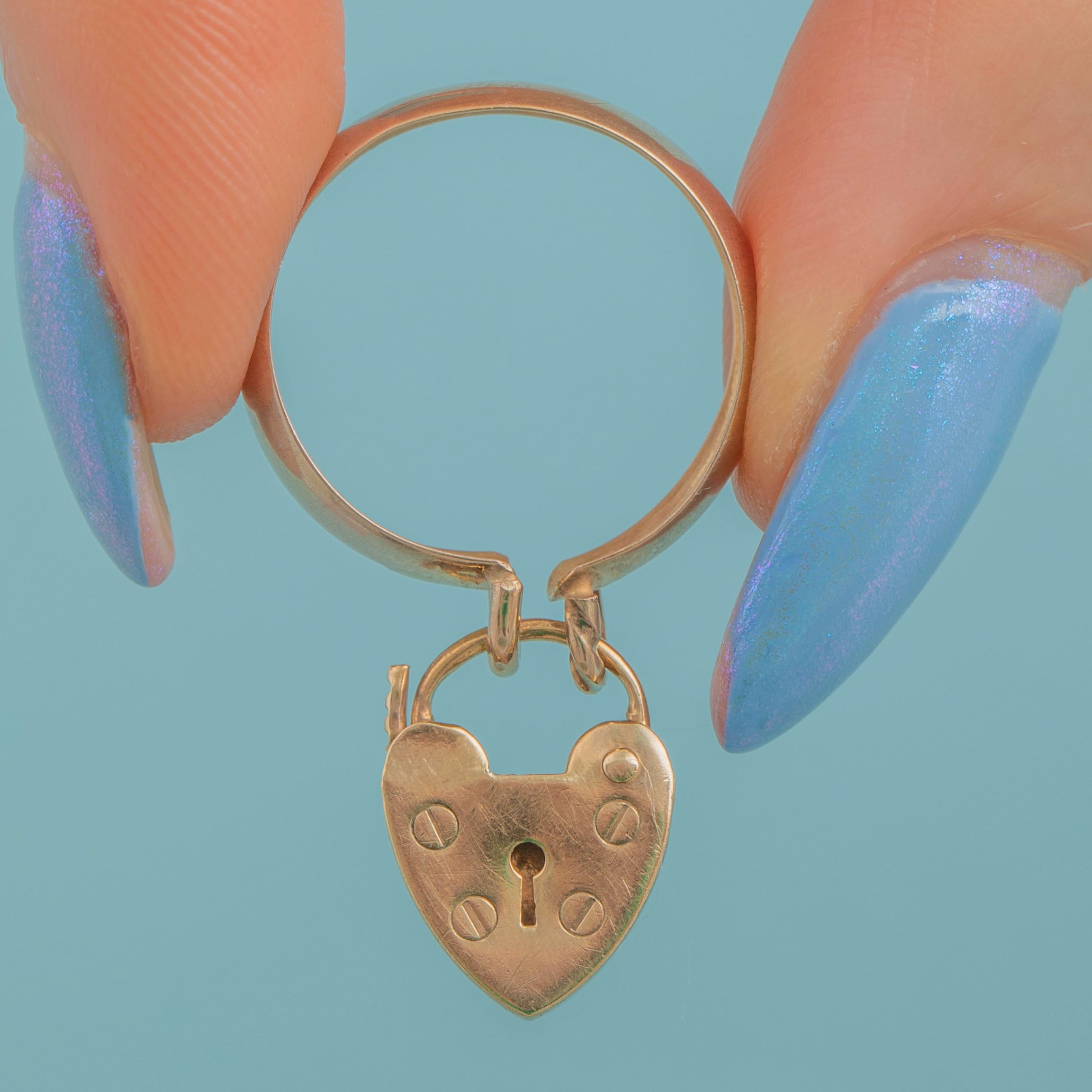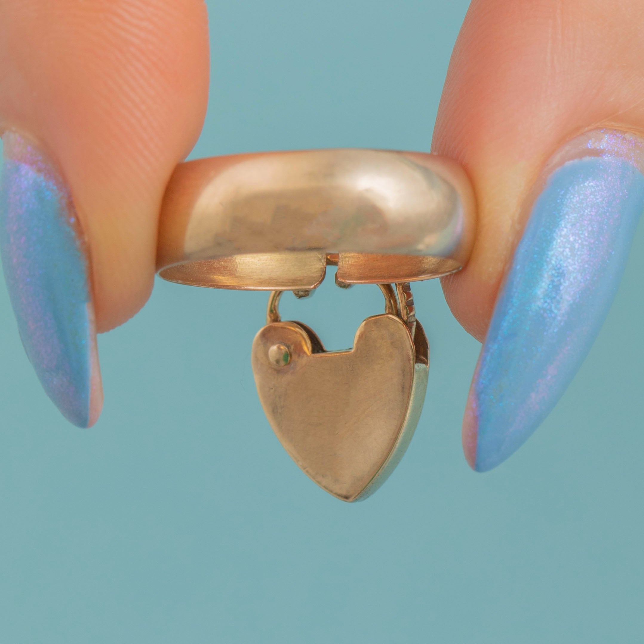 This adorable Art Deco 9ct Gold engraved ring, complete with a heart padlock charm, is a timeless statement piece! Meticulously crafted from buttery 9ct Gold, this ring features a charming heart padlock suspended from her chunky curvaceous band, which is fully hallmarked to