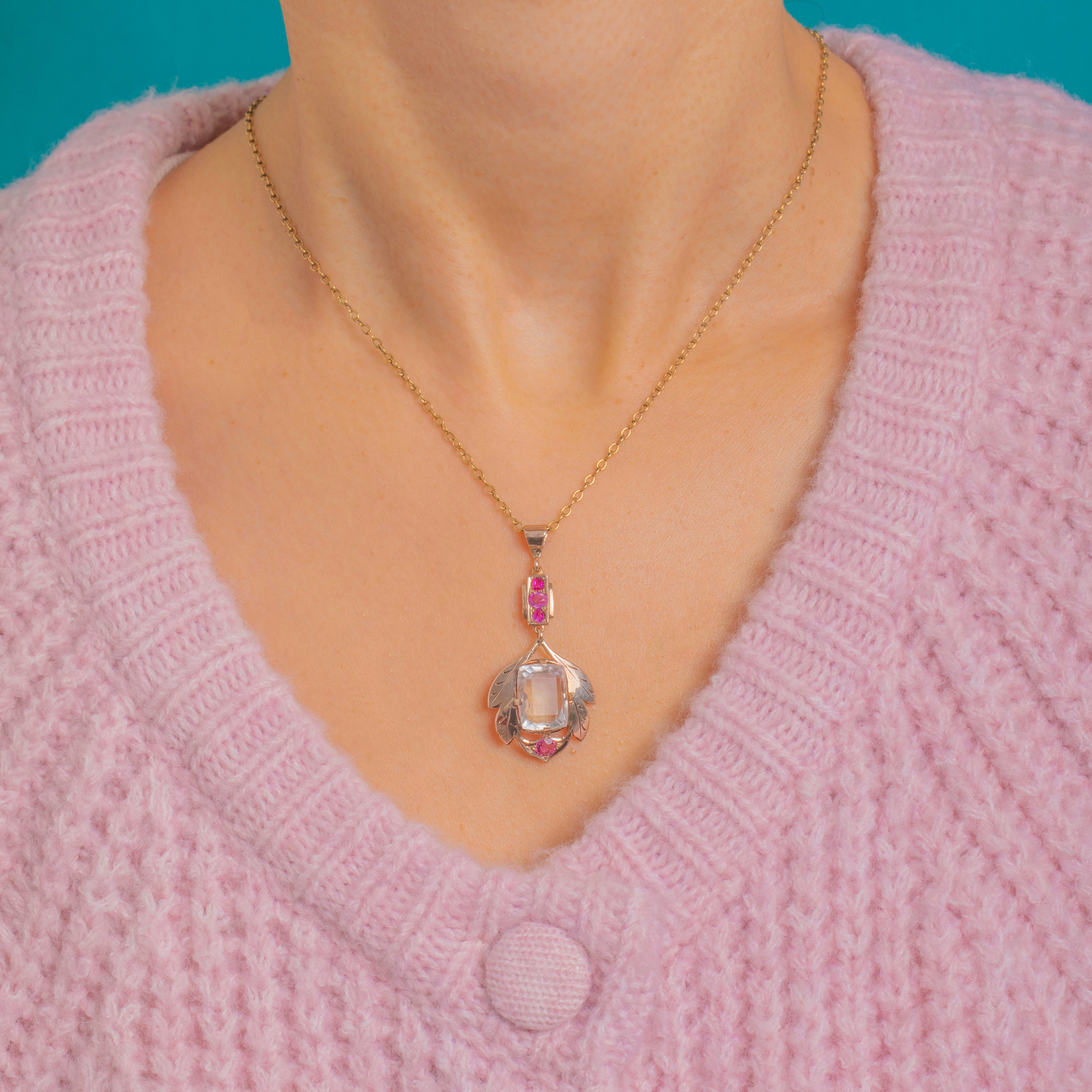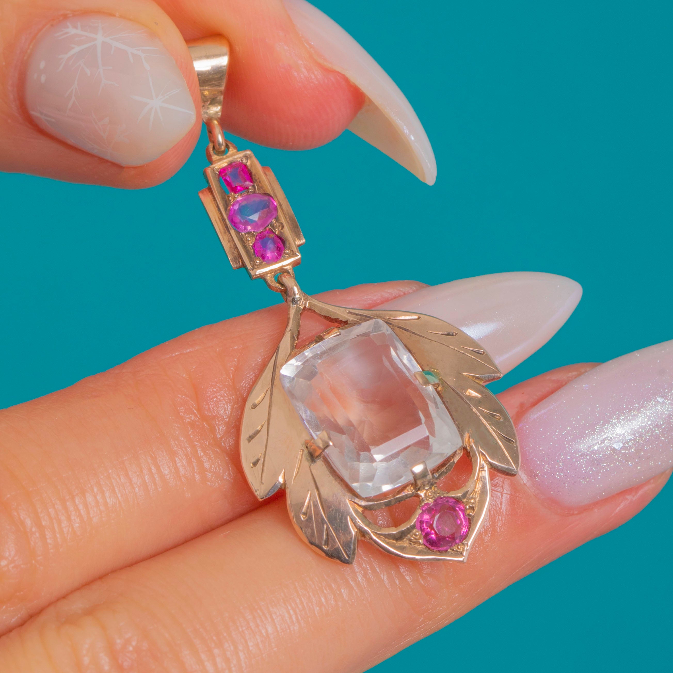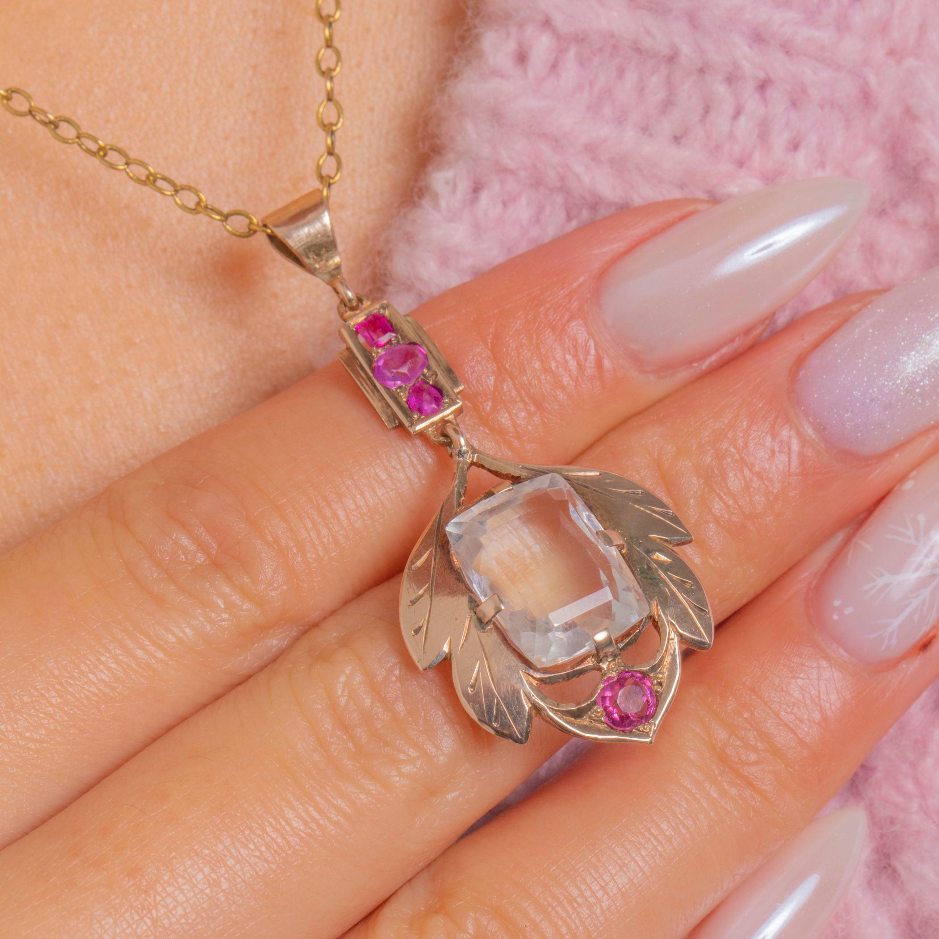 A sparkling little Art Deco treasure, this 9ct Gold leaf drop pendant is centred with an impressive faceted Rock Crystal, lit up with hot pink Ruby accents for a delicious pop of colour. The openwork leaf detailing gives it that unmistakably Deco feel – crisp, graphic, and beautifully balanced.