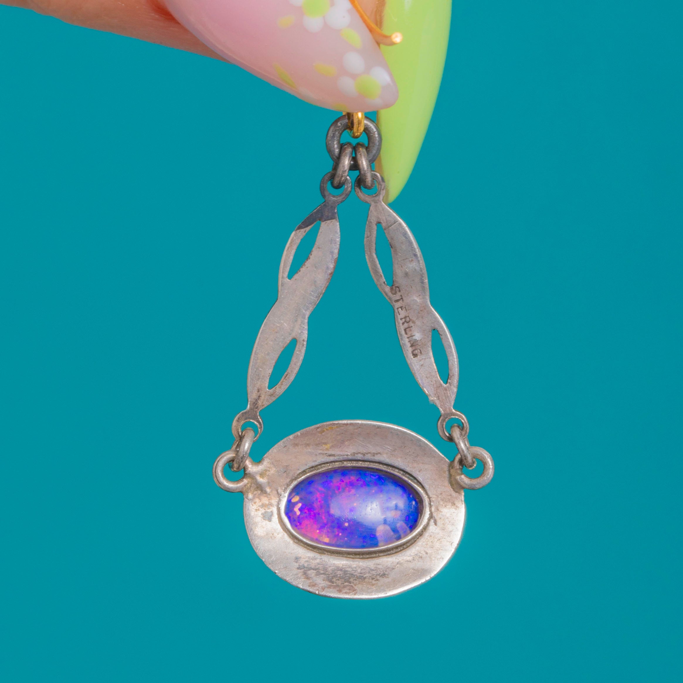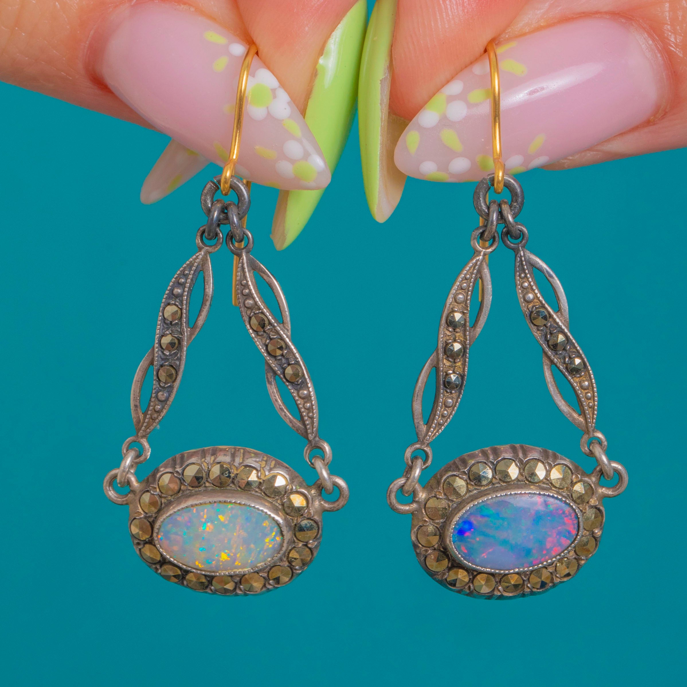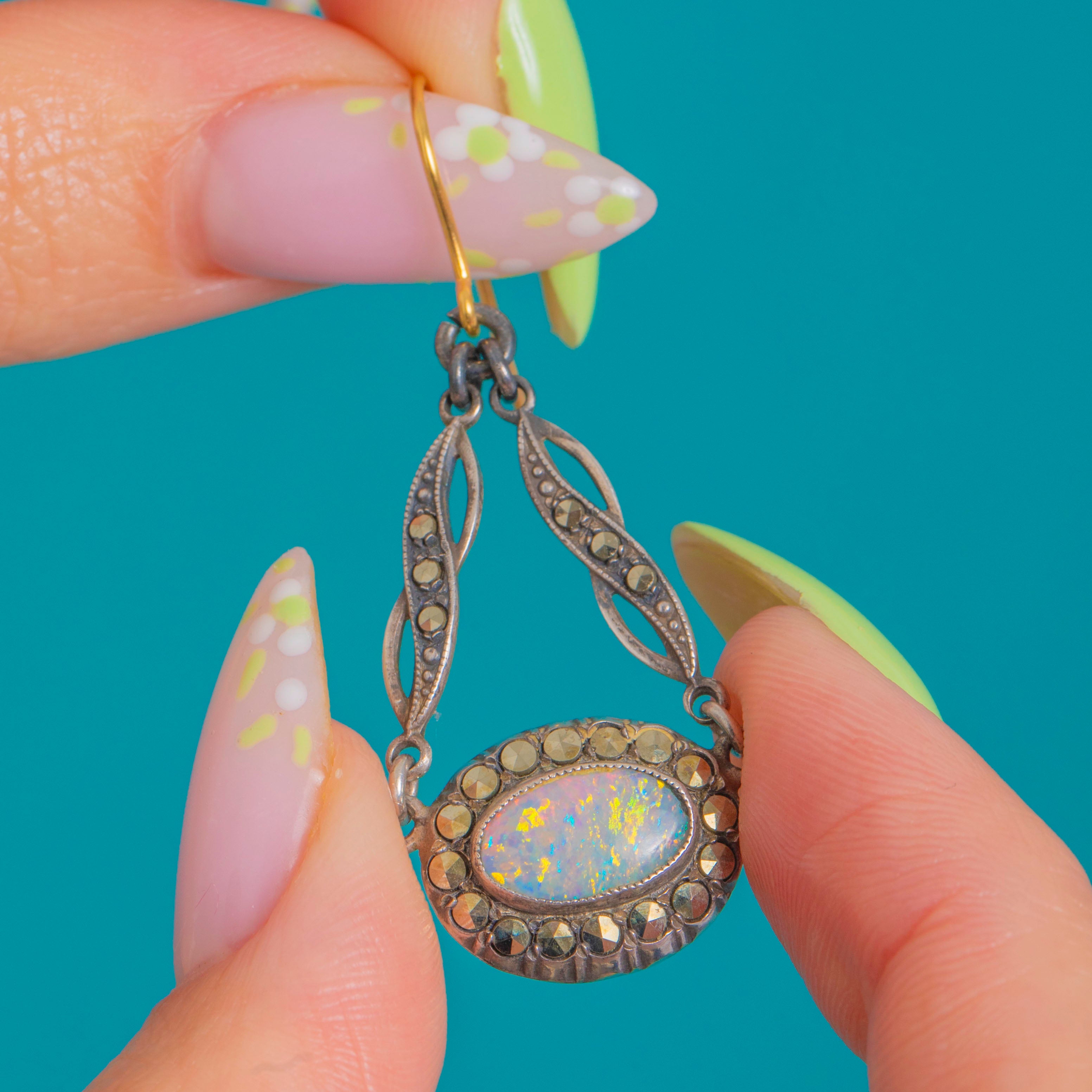 The Opals glow with blue‑green and soft pink fire against the softly oxidised Silver, while the Marcasite brings that signature Deco sparkle. Stamped STERLING and finished with 9ct Gold hooks, they’re an effortlessly elegant day‑to‑evening choice.