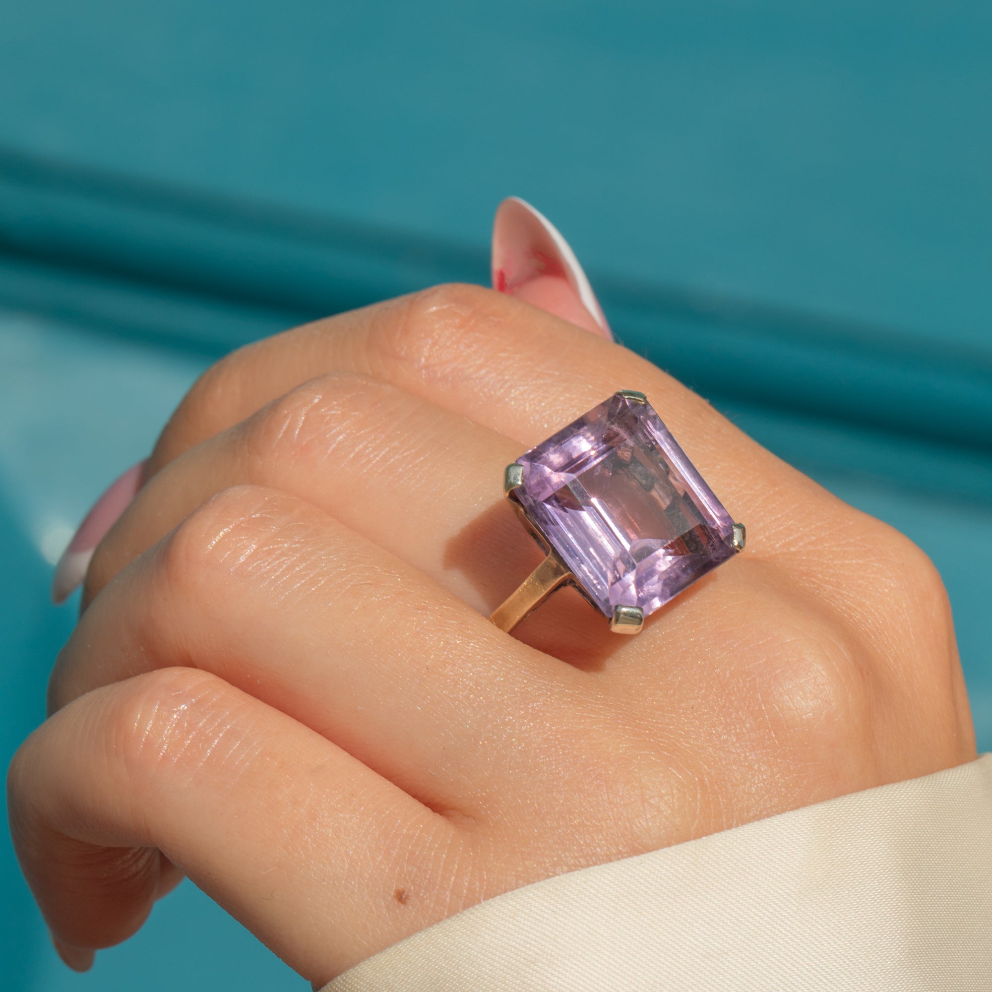 This striking Art Deco cocktail ring features a bold emerald-cut Amethyst measuring an impressive 15.7 x 14mm and weighing approximately 3.75cts. Its vibrant purple hue and precise geometric facets are perfectly complemented by the clean lines of the White 9ct Gold setting.