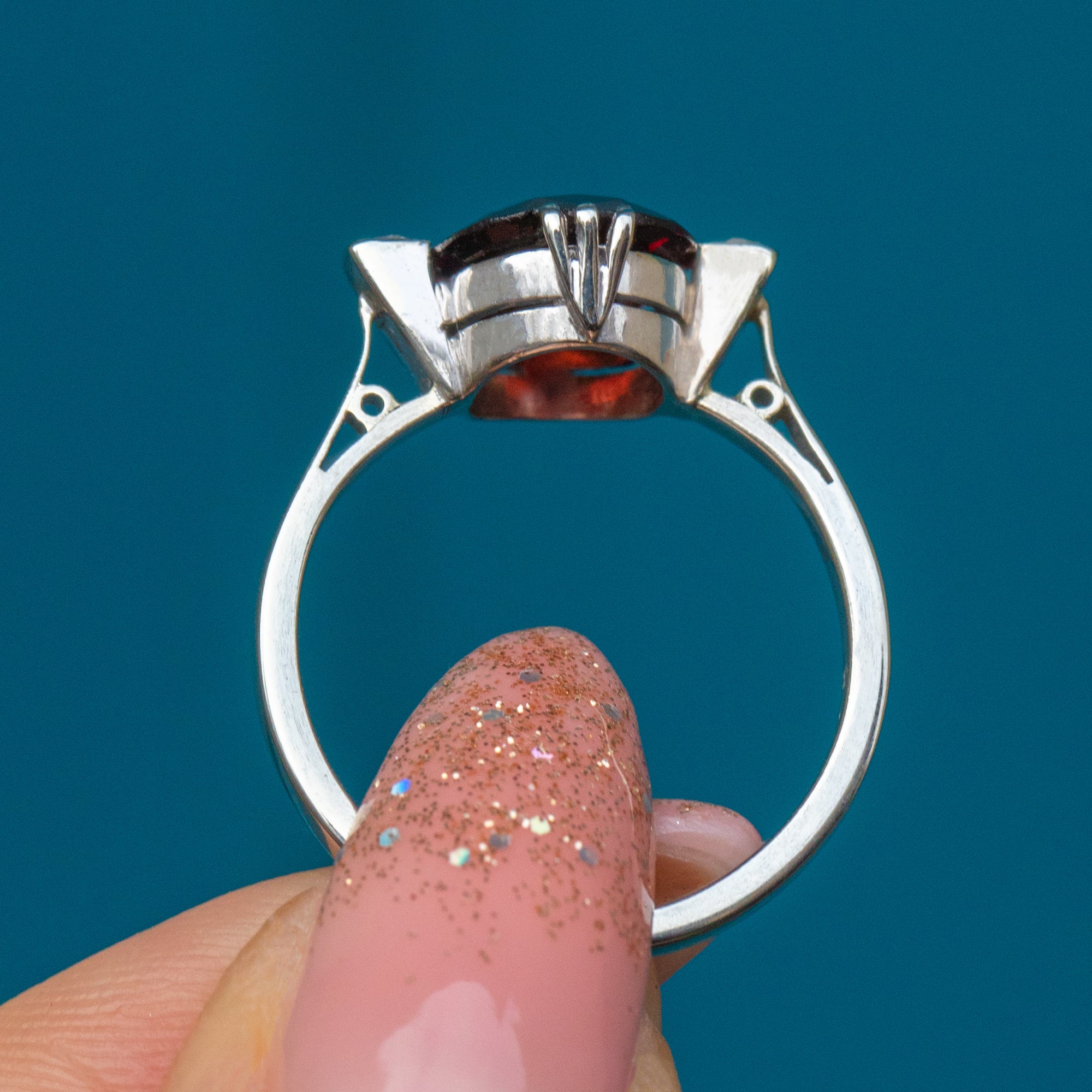 Ready for a statement? This Art Deco 9ct White Gold Garnet & Diamond Ring is absolutely sensational. Inlaid with a whopping berry red natural Garnet, this is a superb ring to add to your jewellery collection.