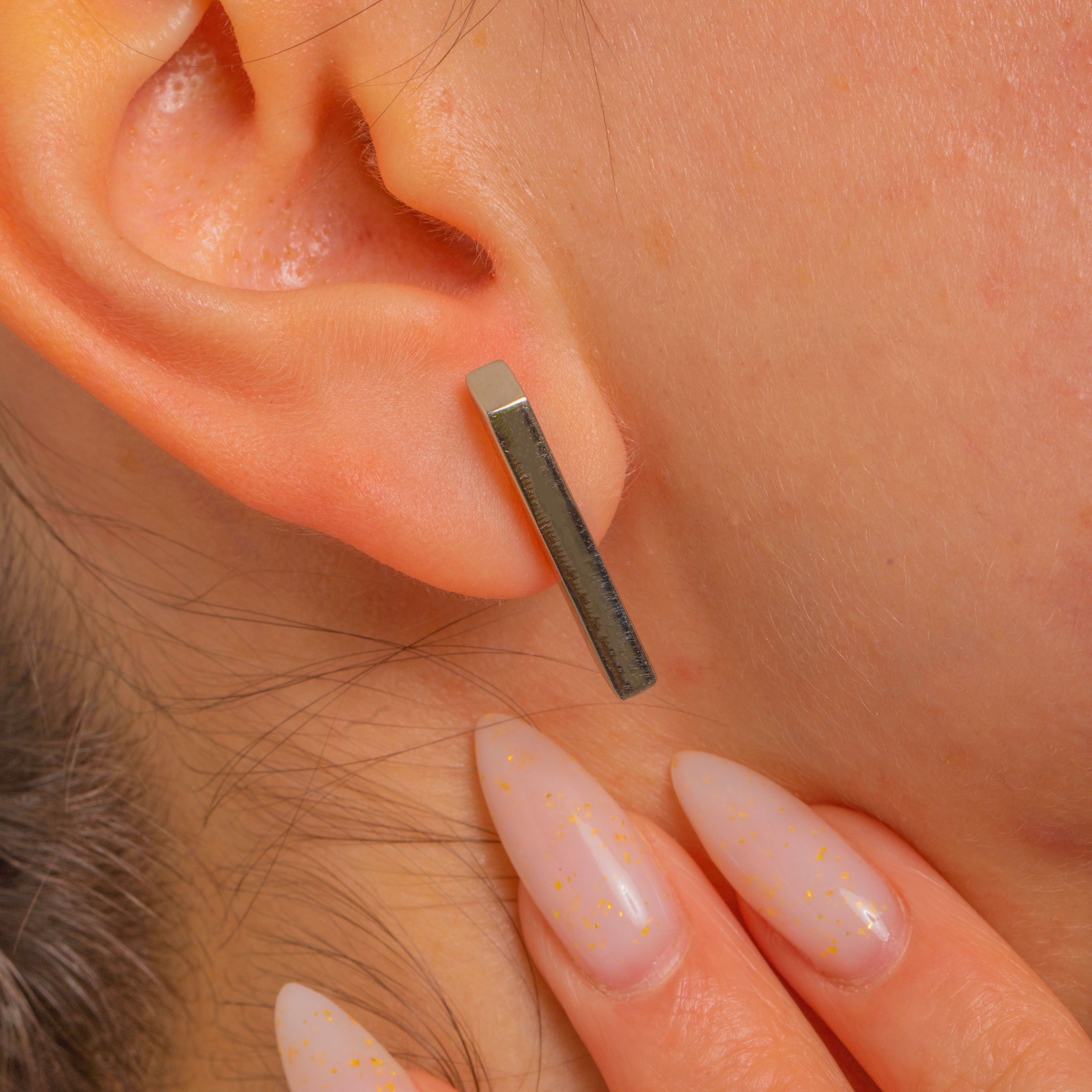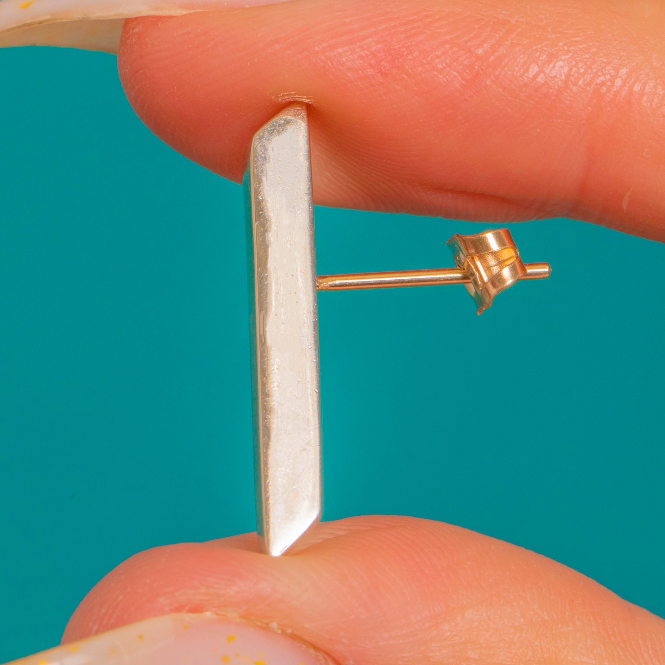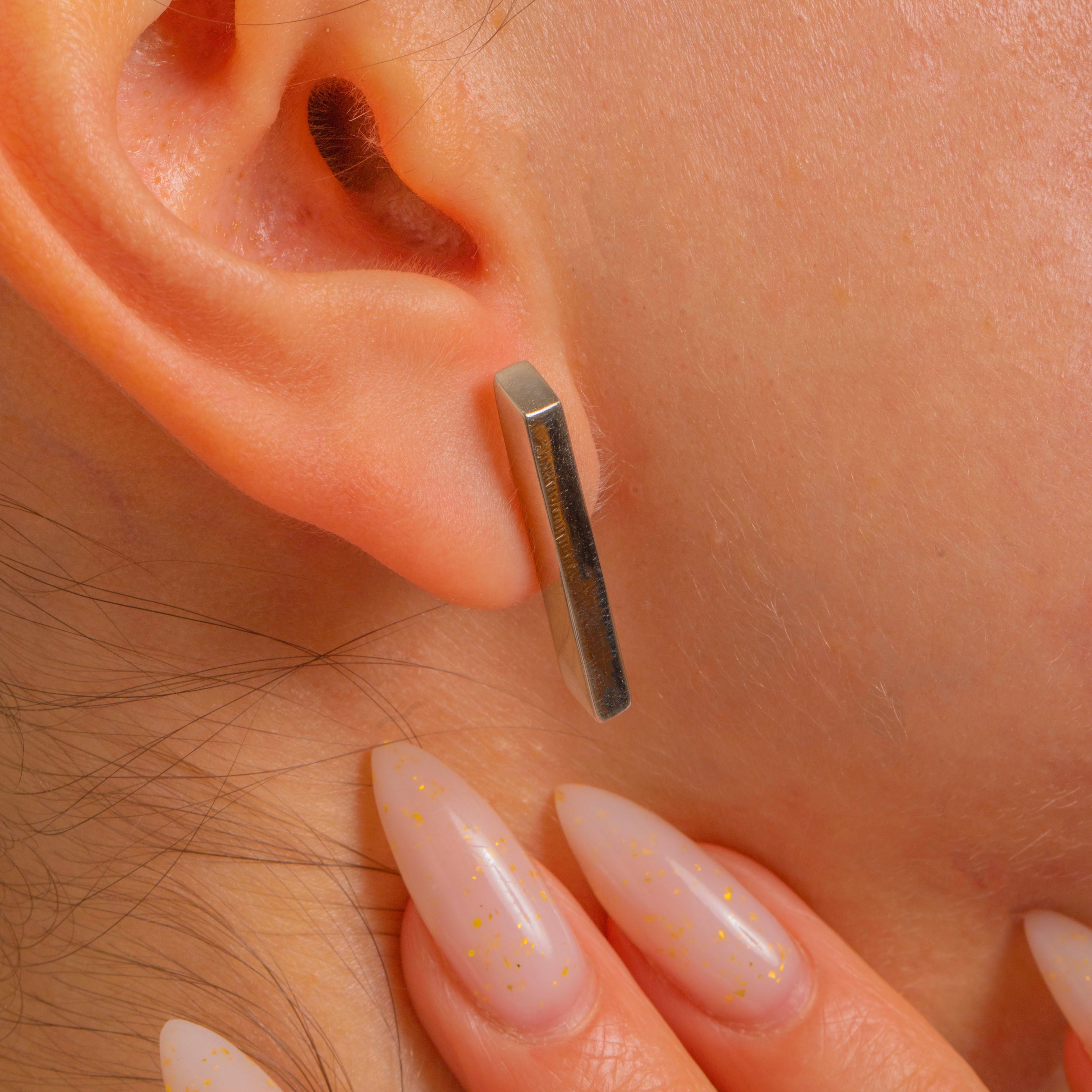 A refined pair of Art Deco knife-edge stud earrings in 9ct White Gold, pared back to essential geometry. Each earring is formed as a slim rectangular bar with crisp, chamfered edges and a machine-finished surface, an elegant expression of the era’s architectural minimalism. Understated and versatile, they sit close to the lobe for a quietly modern silhouette.