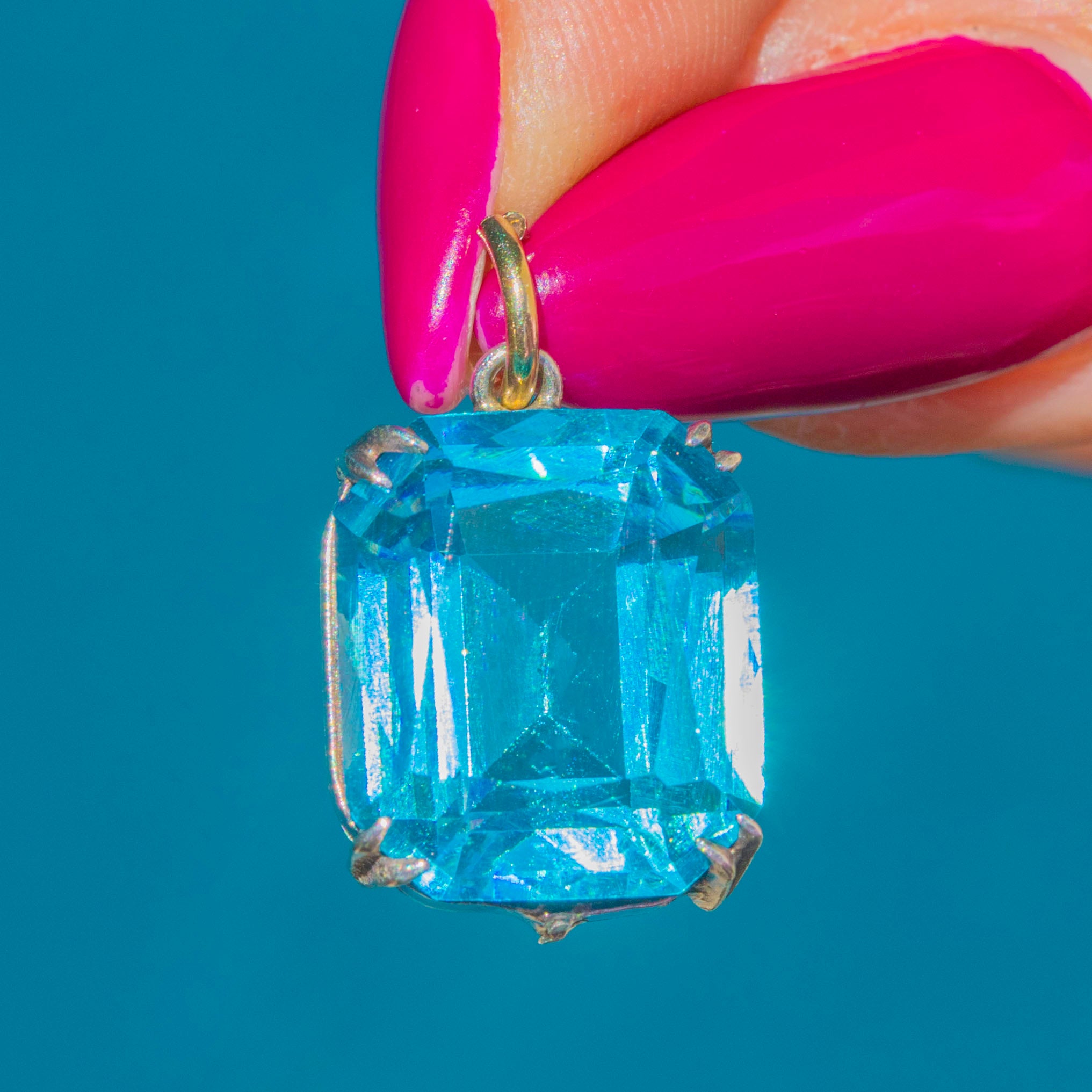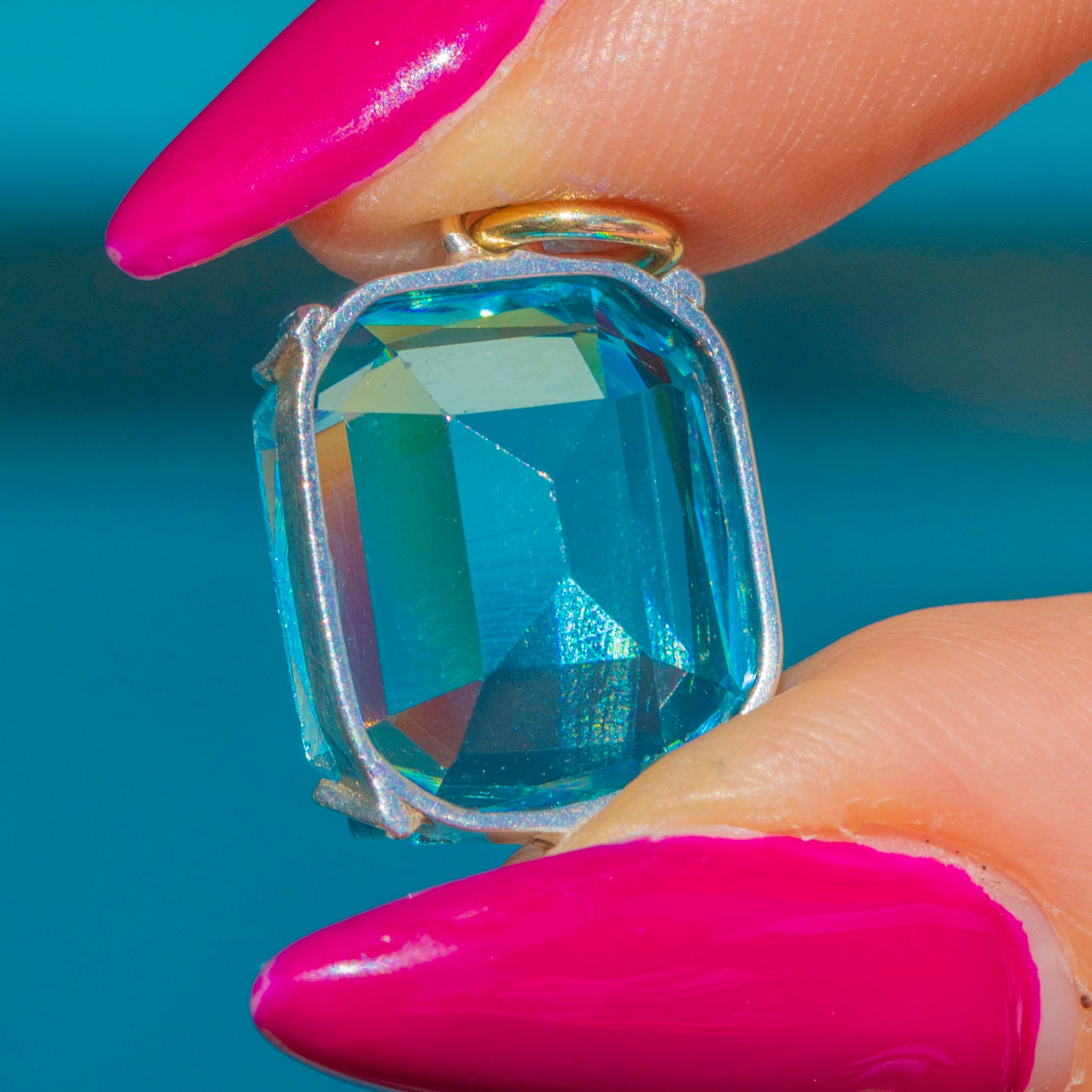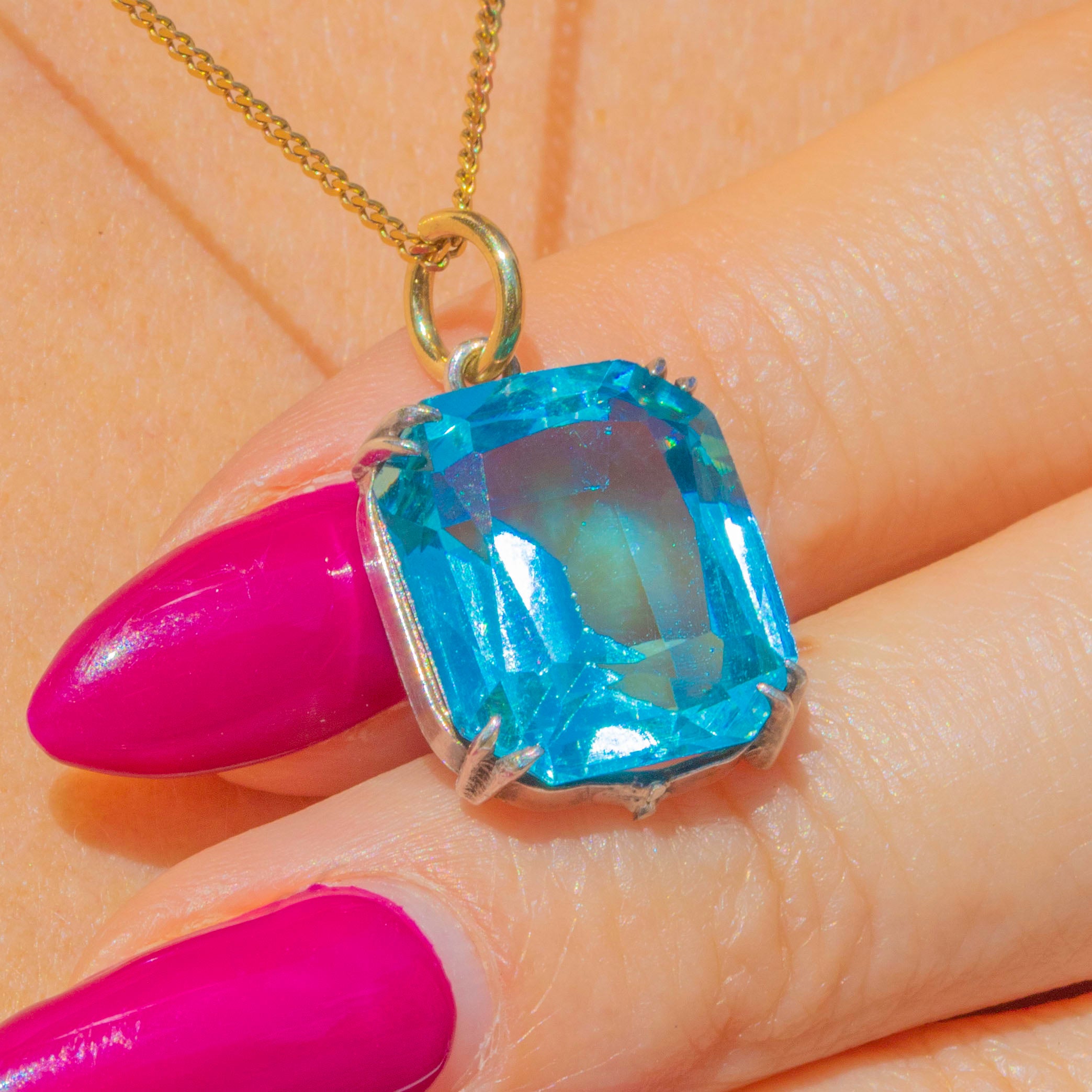 The Sterling Silver settings perfectly complement the icy tones of her Paste, and her tapered claws bring a dash of Deco elegance. Complete with a 9ct Gold jump-ring, all she needs now is an antique Gold chain to adorn!