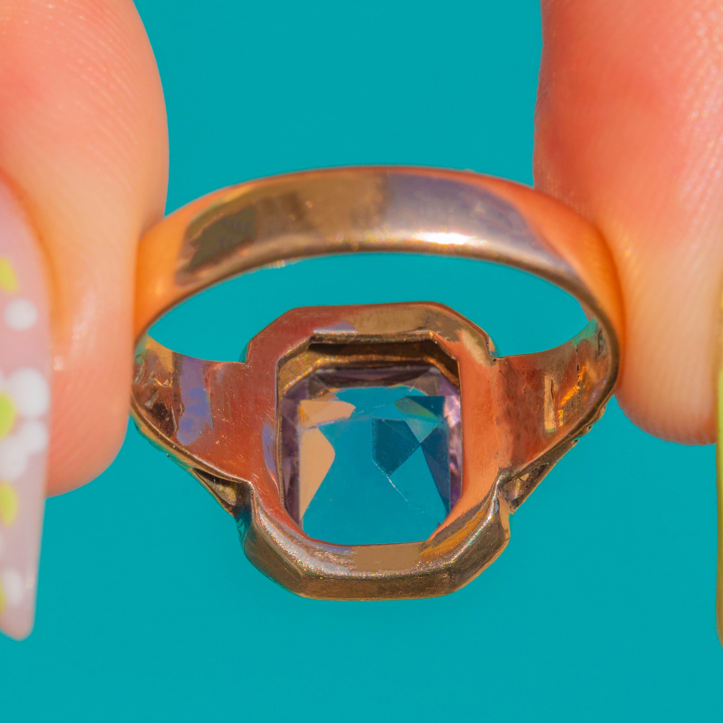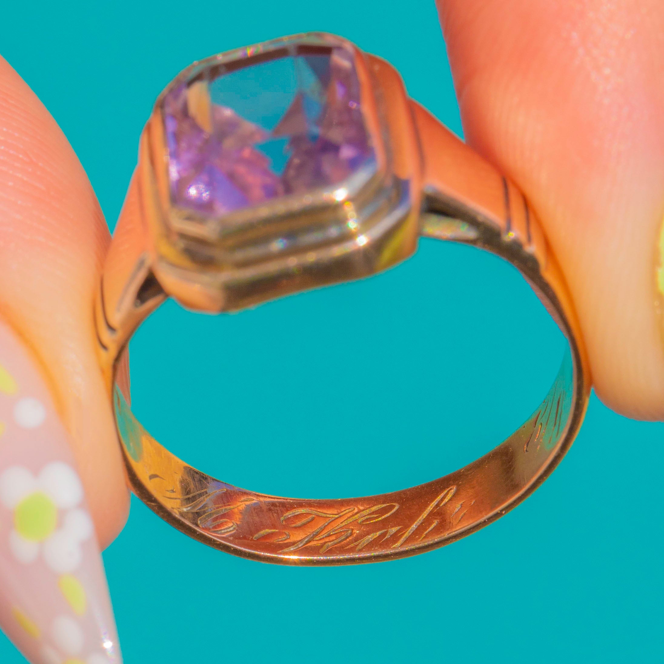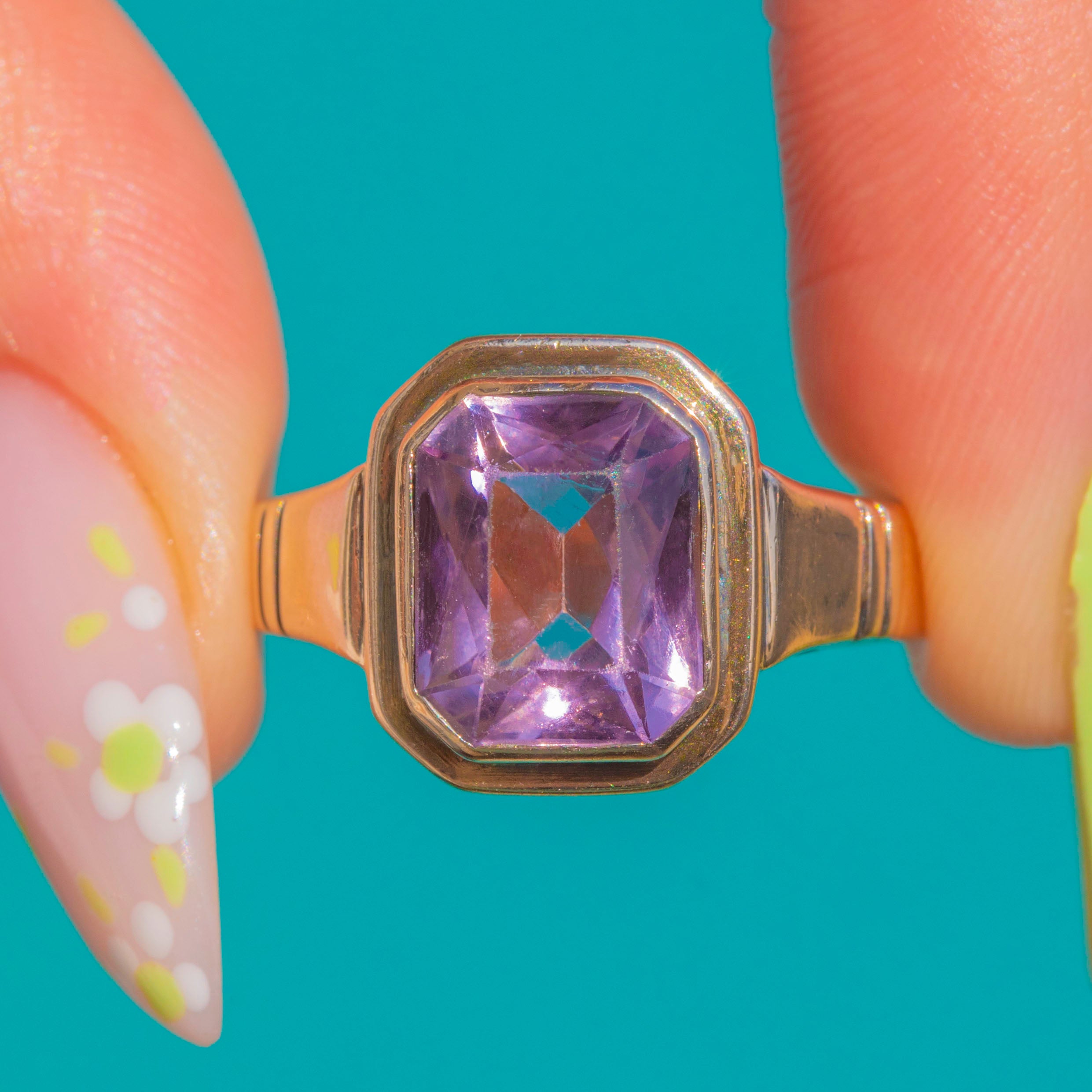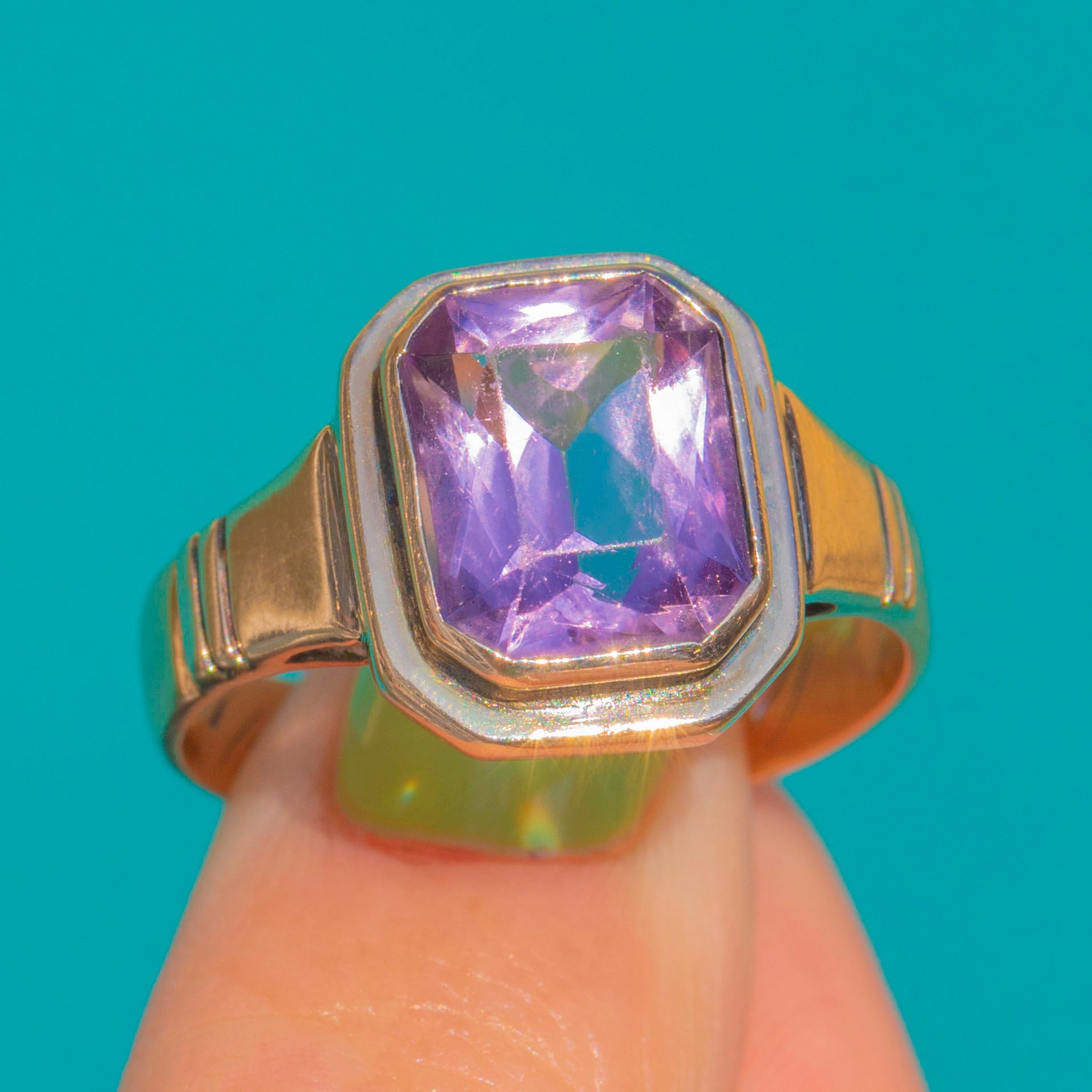 EXCELLENT: The Amethyst is bright and well-preserved with no obvious chips or abrasions visible to the eye. The Gold shows only light surface wear consistent with age, and the stepped bezel and shoulders remain crisp with secure settings. The shank is in strong condition with no evidence of past resizing or repairs.