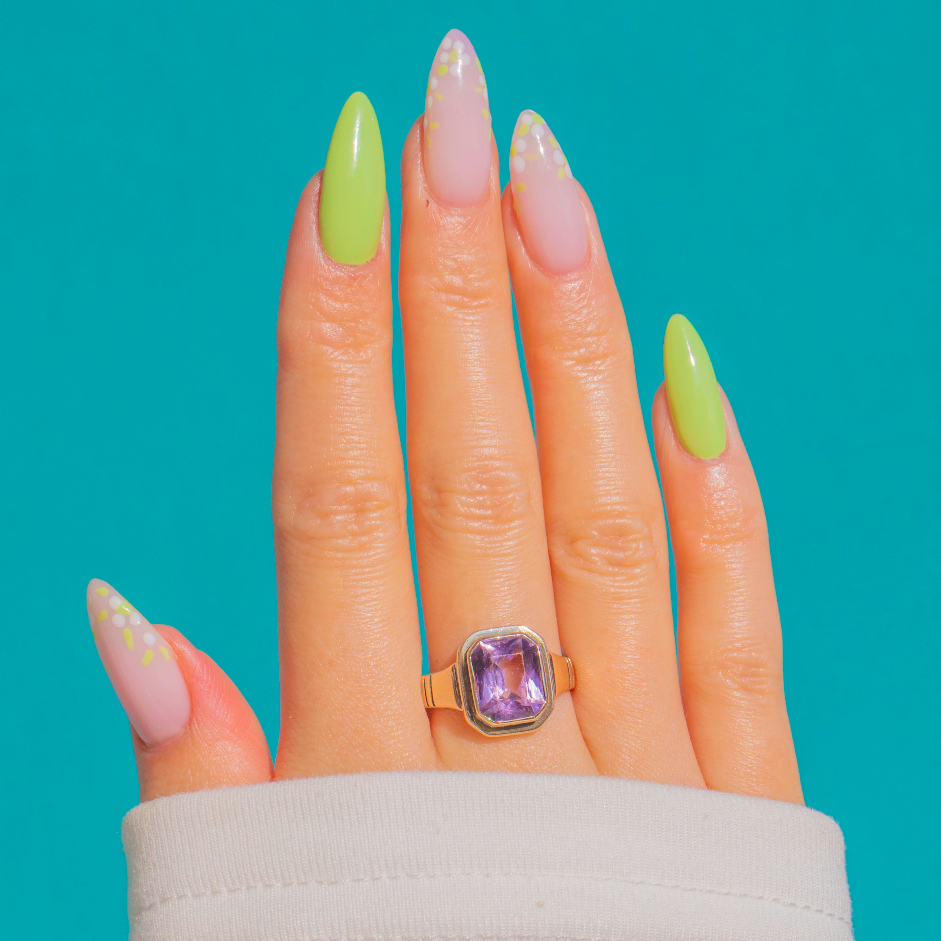 All bold lines and cool geometry, this Art Deco ring centres a lush violet Amethyst in a crisp step cut with clipped corners. The stone sits within a multi-stepped, octagonal bezel that amplifies its architectural silhouette, while broad tapered shoulders with linear groove details complete the sleek, streamlined look.