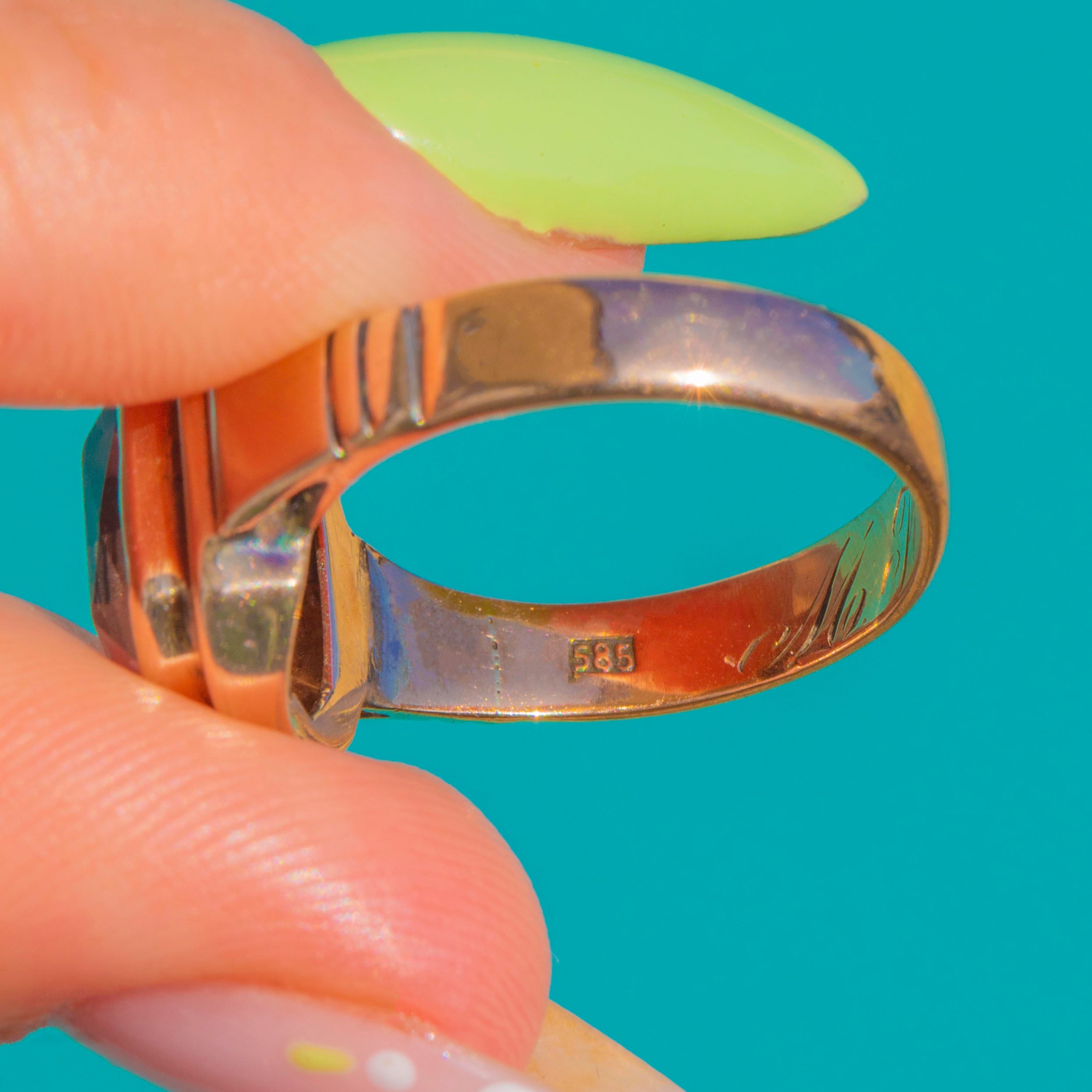 Inside, a romantic hand-engraved inscription reads “M Koln. 8/4 1895”, a charming personal touch that adds character to this striking cocktail piece.