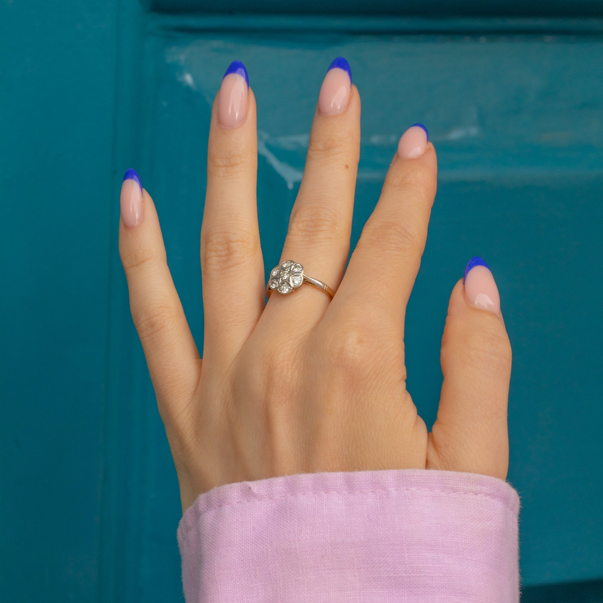 EXCELLENT. This antique 18ct Diamond cluster ring is in excellent condition. The Diamonds are secure in their Platinum settings, free from chips or fleabites. The inside of the ring is clearly stamped 18ct. With a sturdy yellow Gold band this Diamond engagement ring is the perfect forever piece.