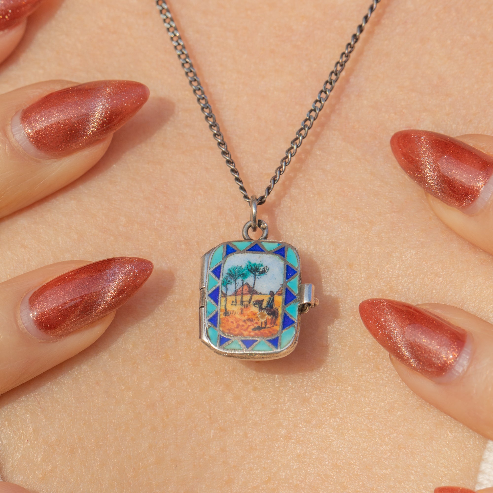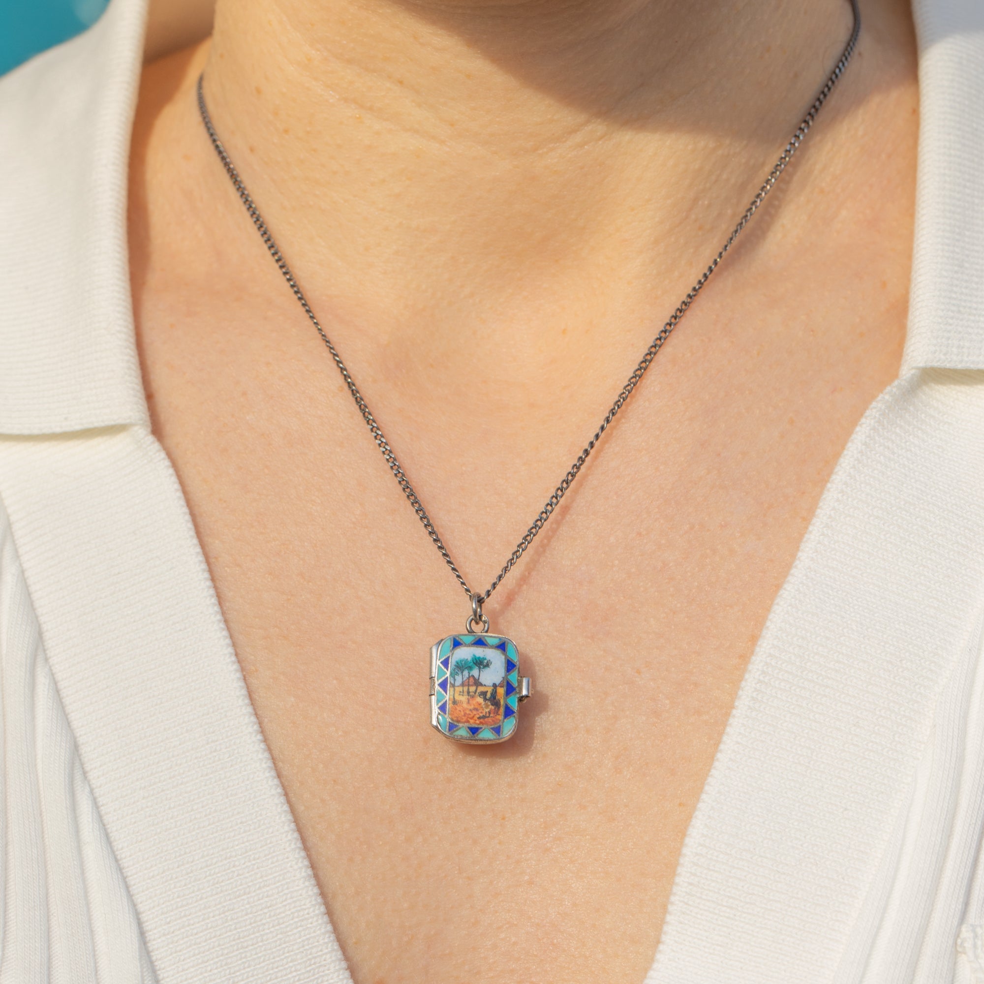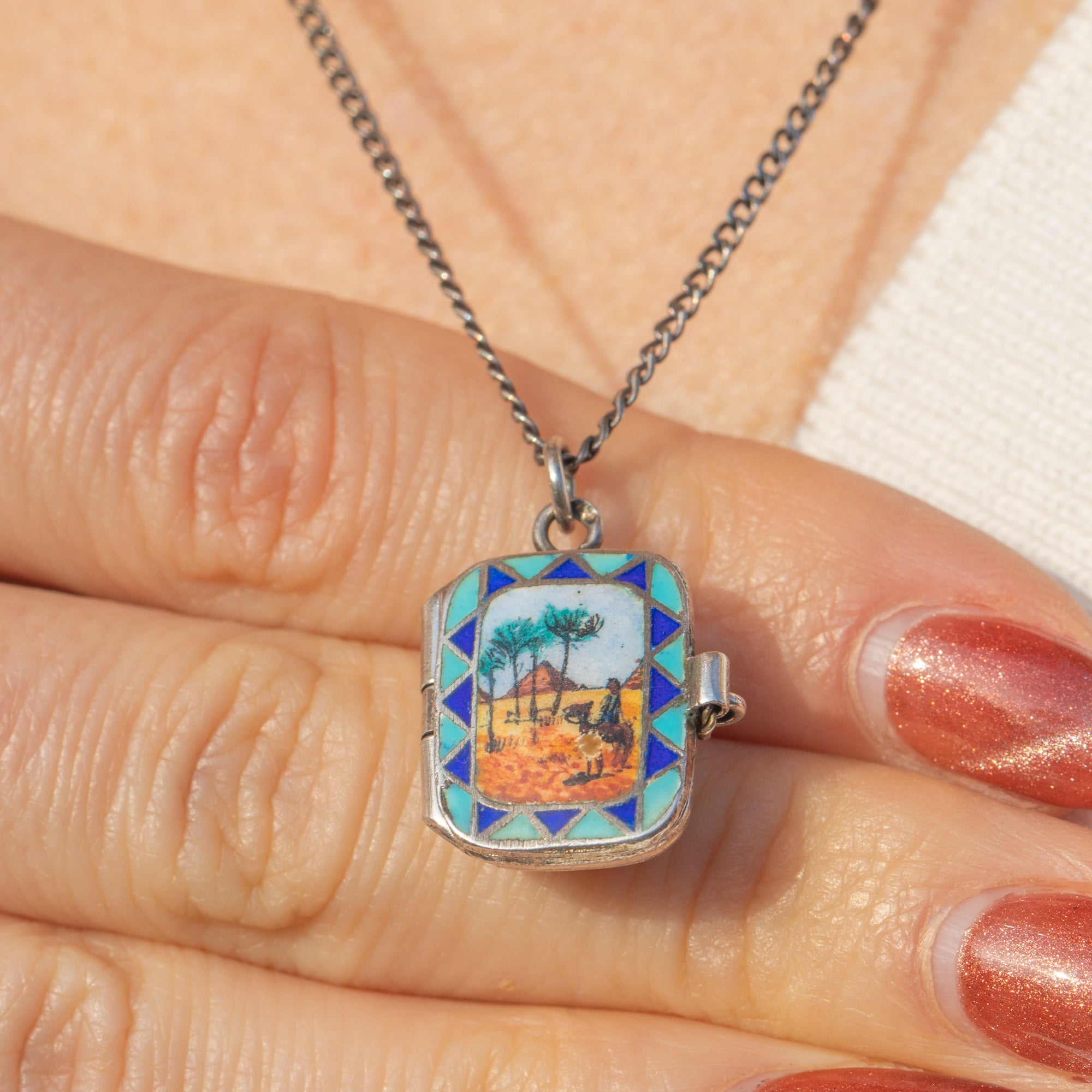 An incredible Art Deco Egyptian Revival Silver Enamel Moses basket pendant. Inlaid with colourful Enamel, and featuring a beautiful biblical scene on its lid, this pendant will instantly transport you to the River Nile!