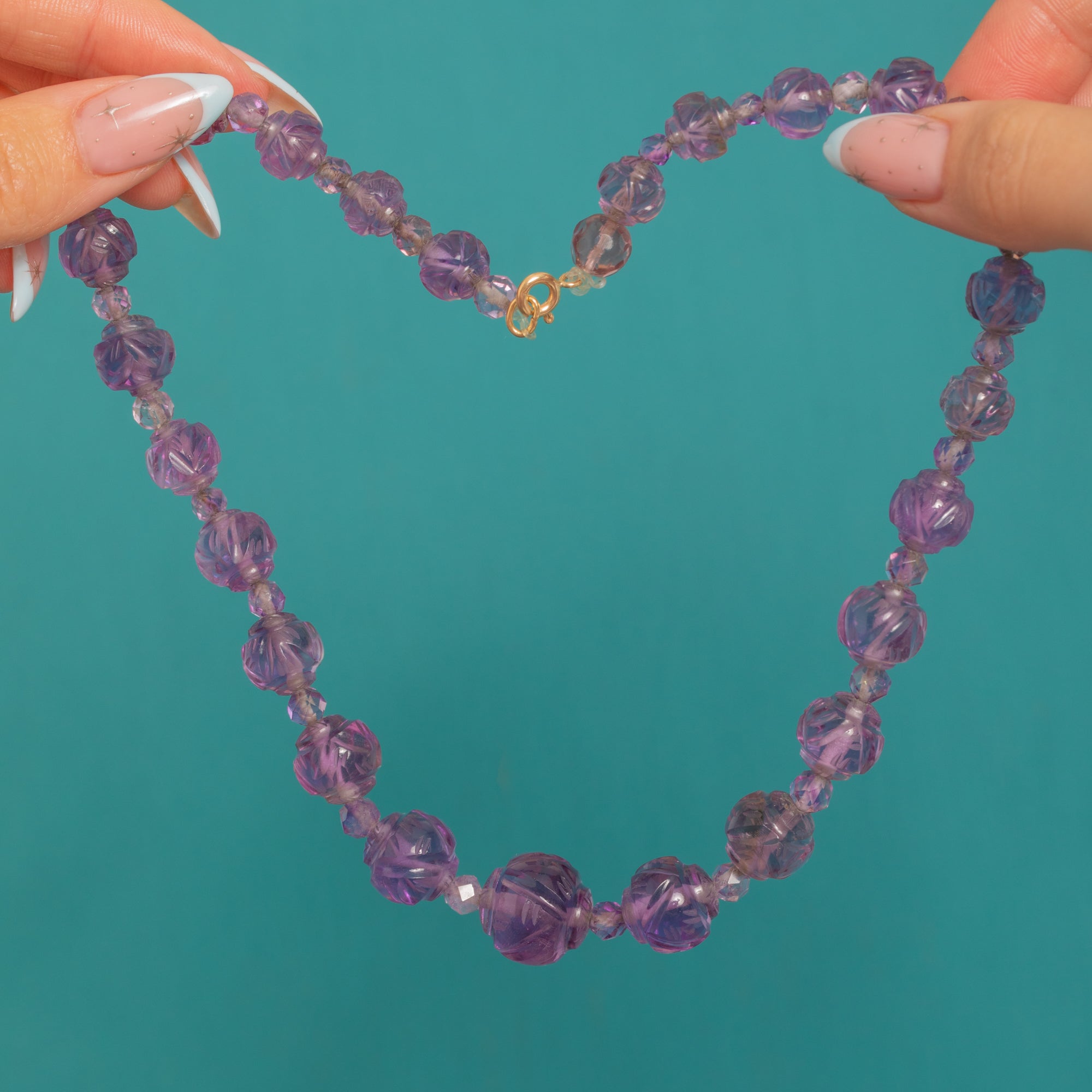 A sculptural Art Deco necklace composed of hand-carved Amethyst “melon” beads, gracefully graduated and punctuated by smaller faceted Amethyst spacers. The fluted carving reveals beautiful translucency and natural internal inclusions, and the alternating faceted beads lend a subtle sparkle that dances between each carved sphere.