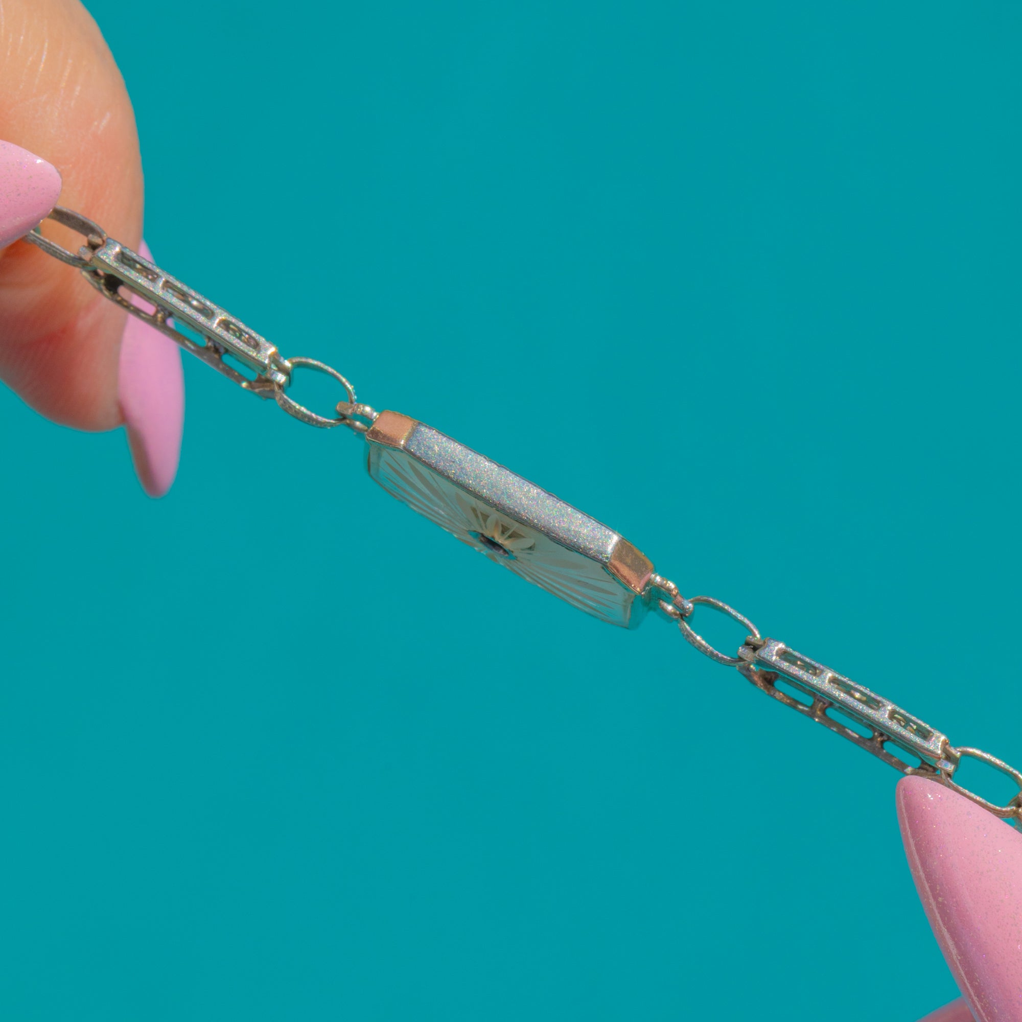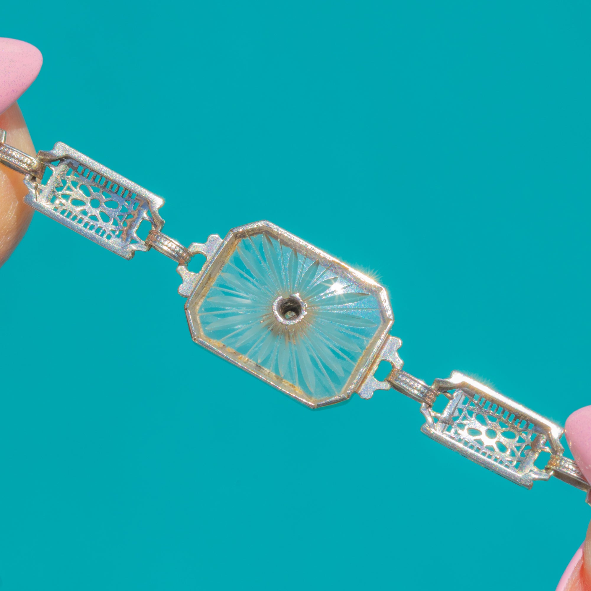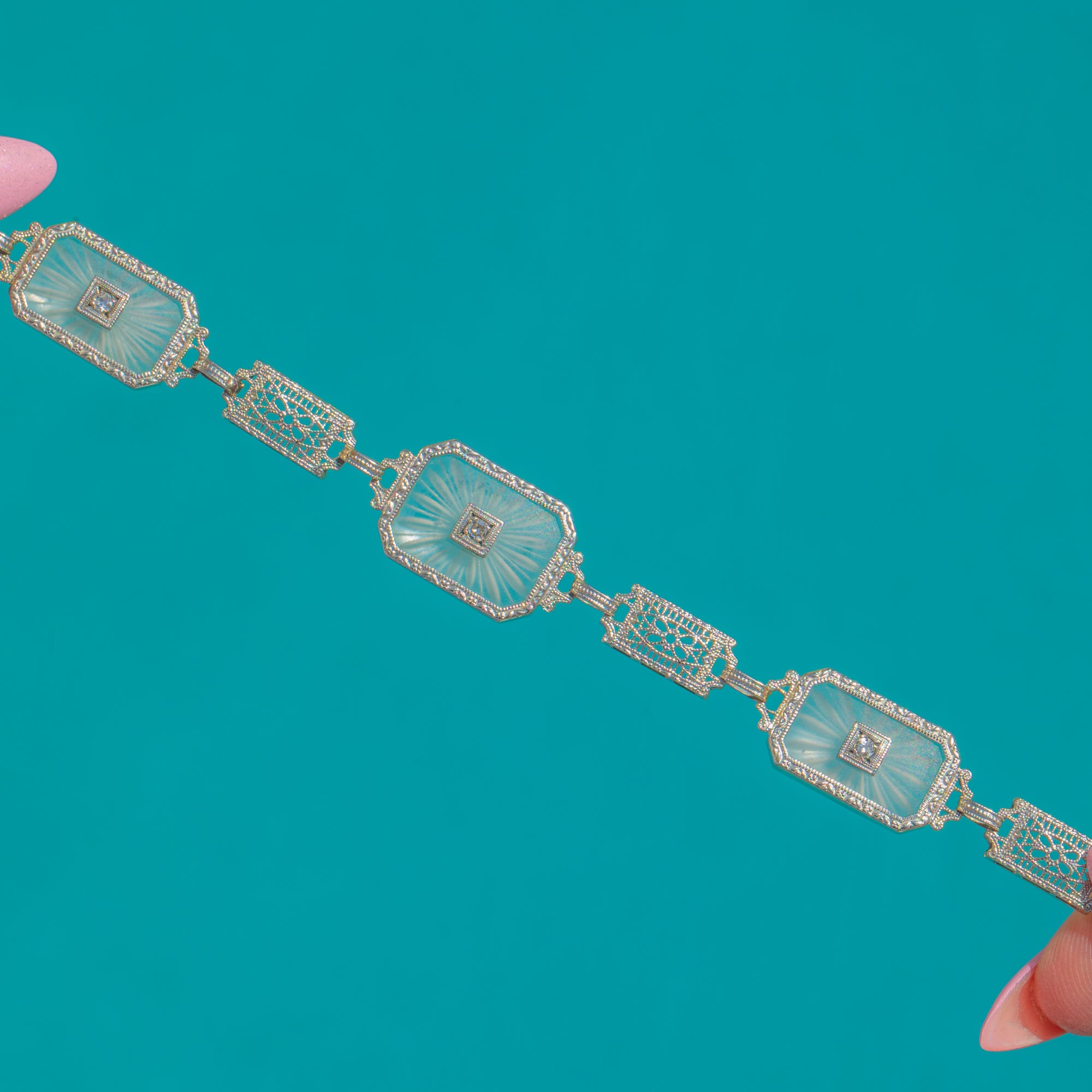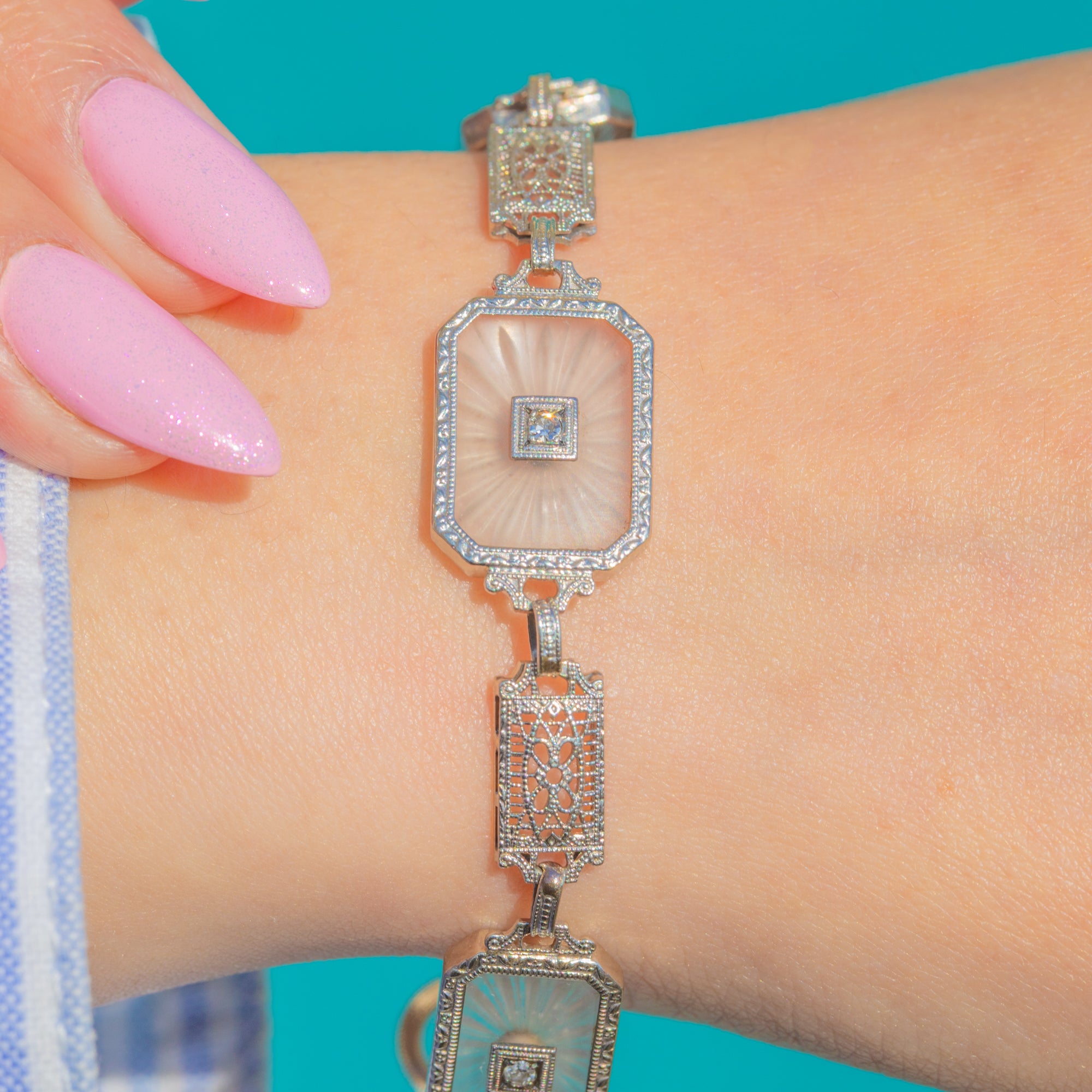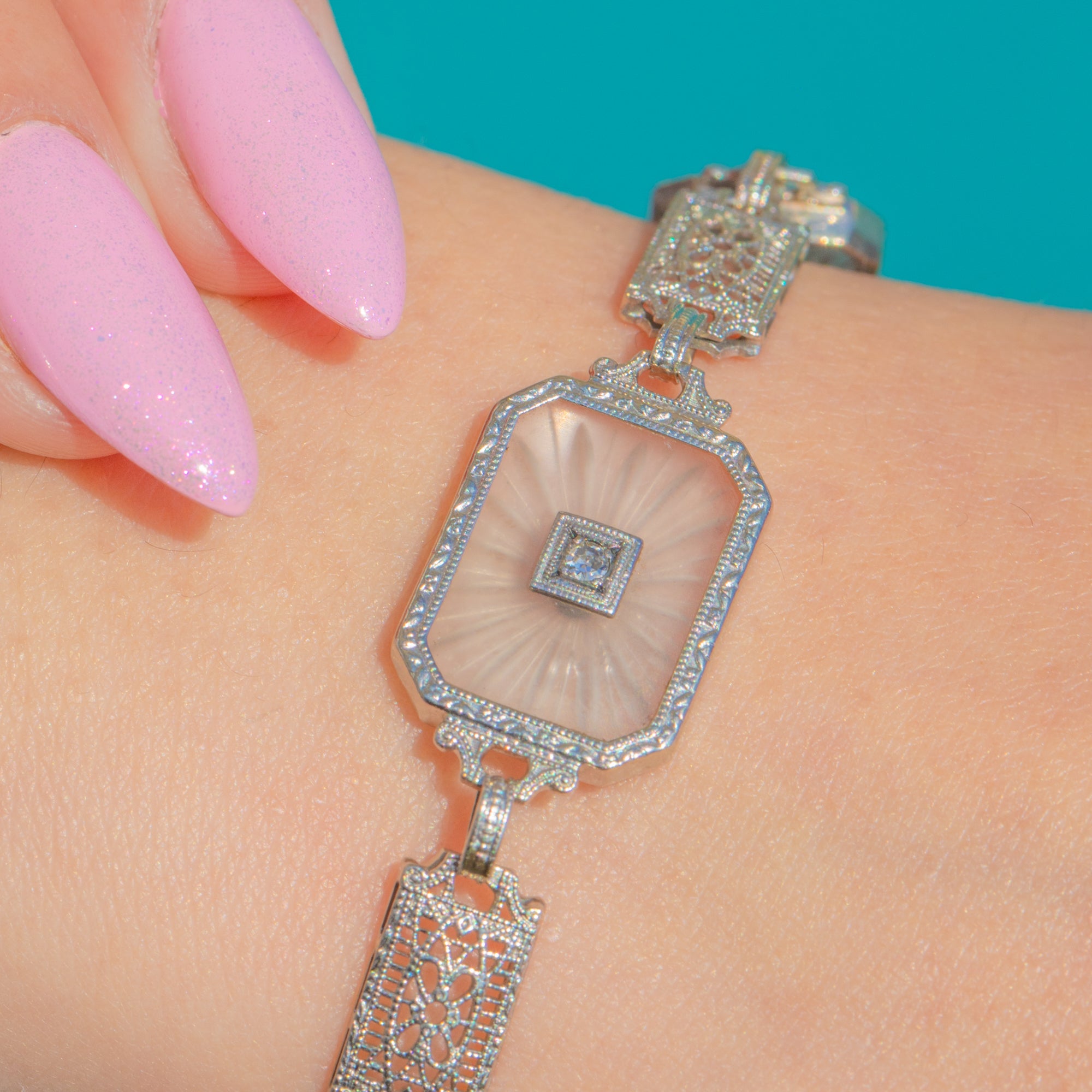 Art Deco Filigree 14ct White Gold Camphor Glass & Diamonds Bracelet